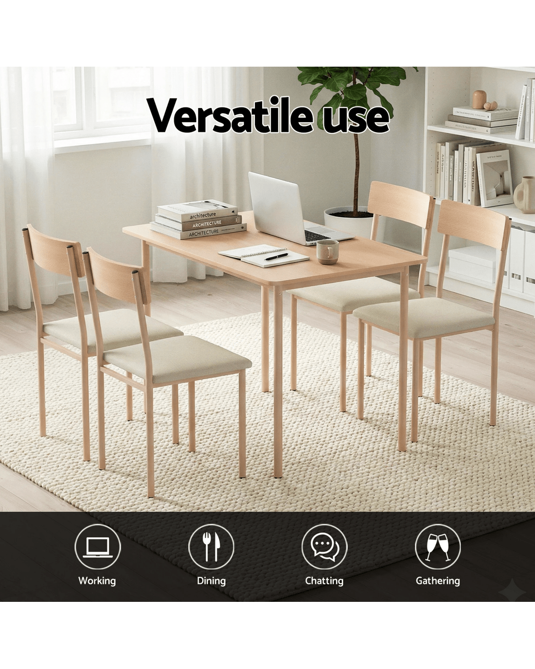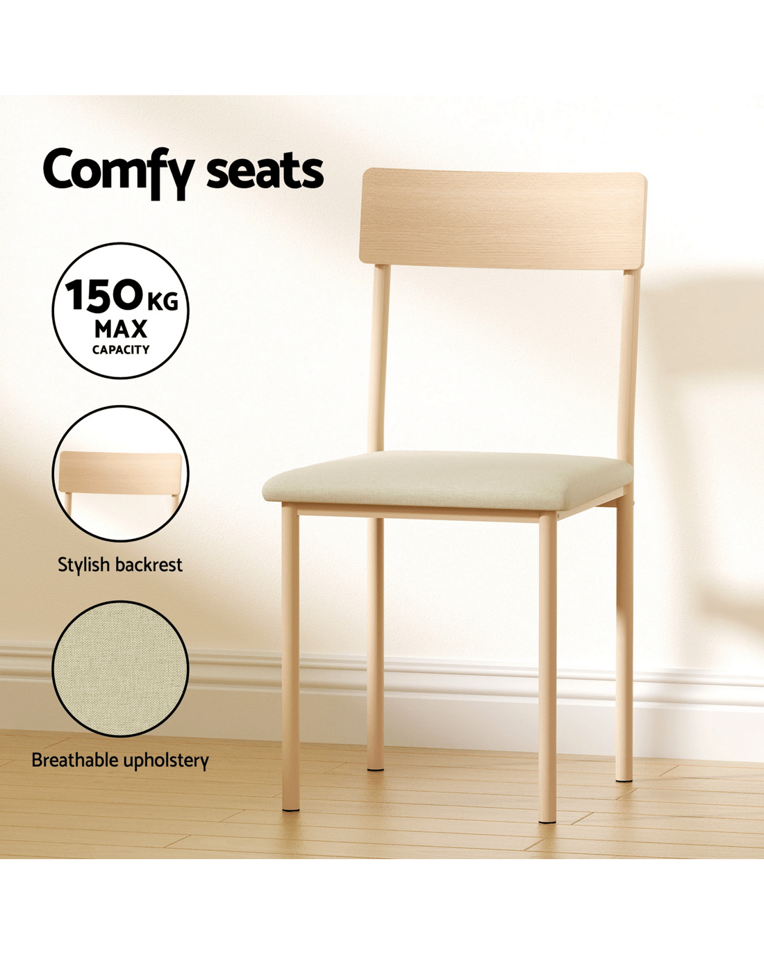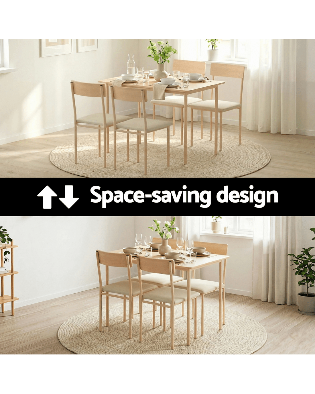 Infuse your home with Nordic charm using the Artiss 5-Piece Scandi Dining Set. Designed for the modern Australian lifestyle, this suite combines a clean, minimalist silhouette with intelligent engineering. While it boasts the lovely appearance of natural light oak, the frame is actually crafted from reinforced metal with a premium wood-grain finish. This means you get the sturdy, wobble-free performance of steel without sacrificing the cosy timber aesthetic. Complete with soft padded seats for extra comfort, this 110cm dining set is the perfect durable, stylish, and space-saving solution for your daily meals.