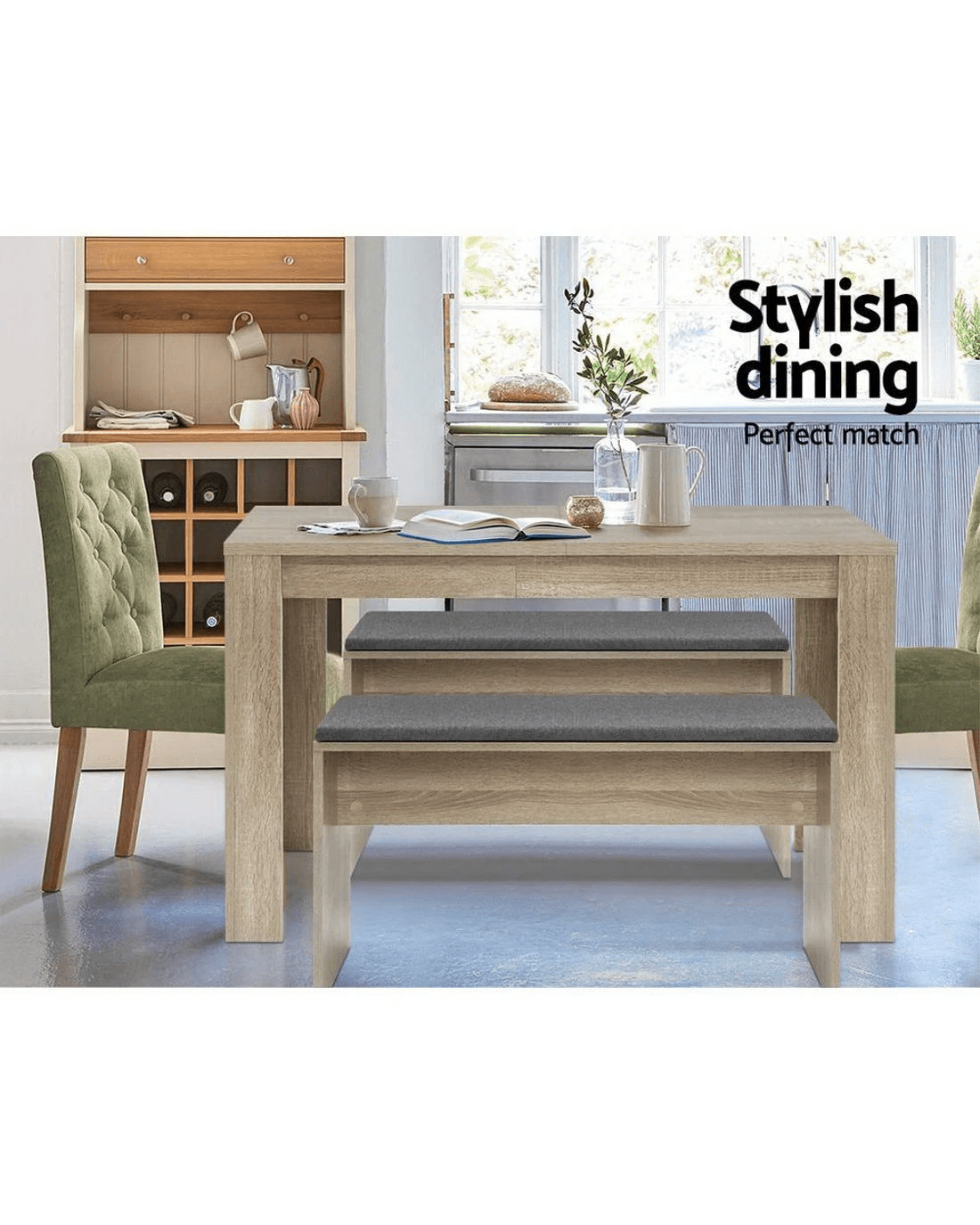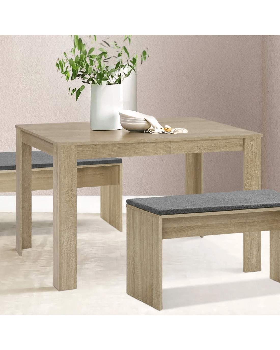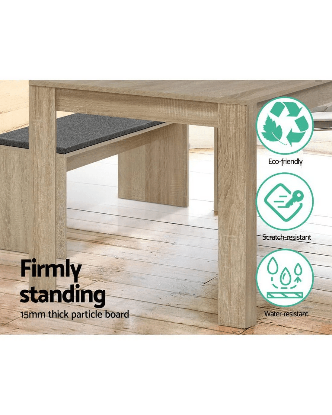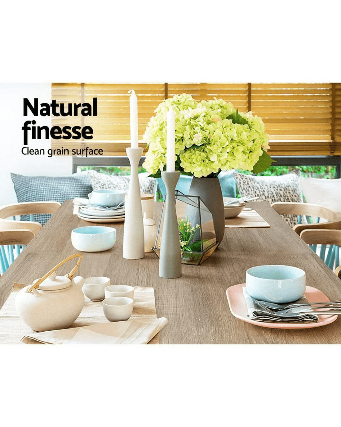 If you are looking for a simple wooden dining table that seats four to six people, our Artiss NATU Dining Table is what you are after. The dining table has a beautiful natural wood grain finish and will blend in perfectly with your décor. Made from 15mm particle board, the dining table is exceptionally thick and offers a very solid and chunky feel. In other words, the table will last through decades of robust use and still retain its strength and character. And dare we say; it will look even better with age. Not least, the entire table is further reinforced with heavy-duty fixings and anti-slip base to present a dining table that is never short on reliability nor durability. Match with the NATU Dining Bench for the complete natural look.