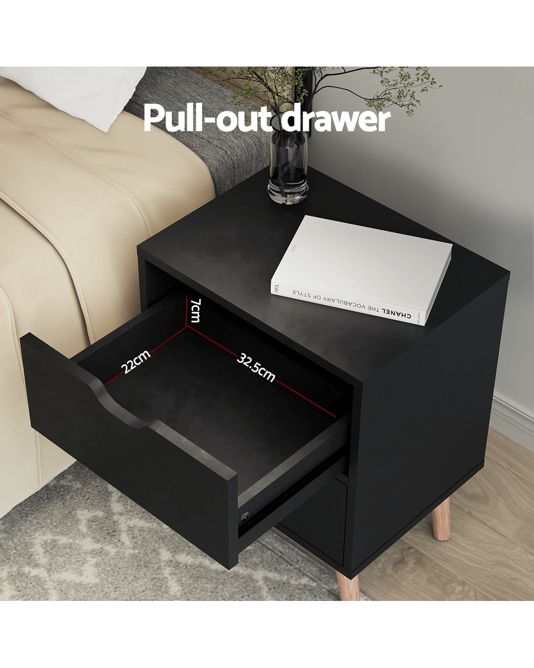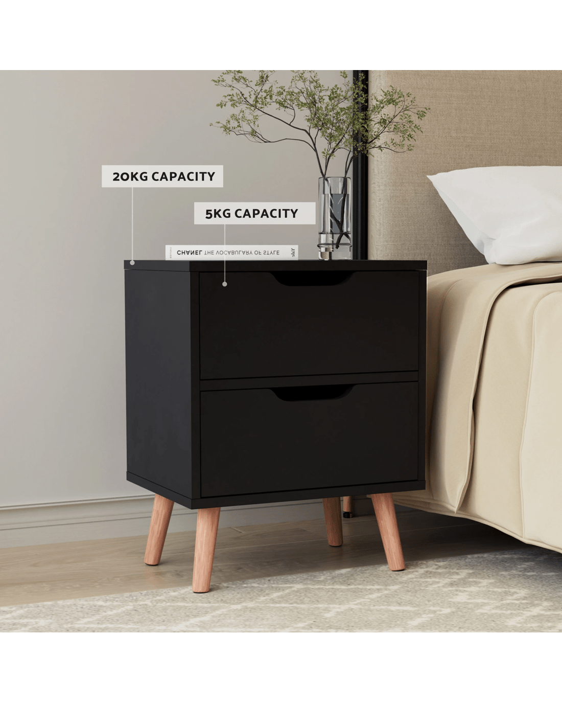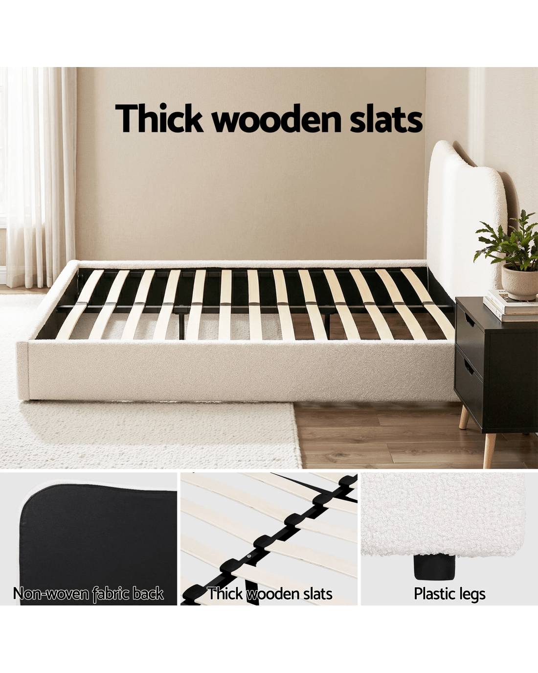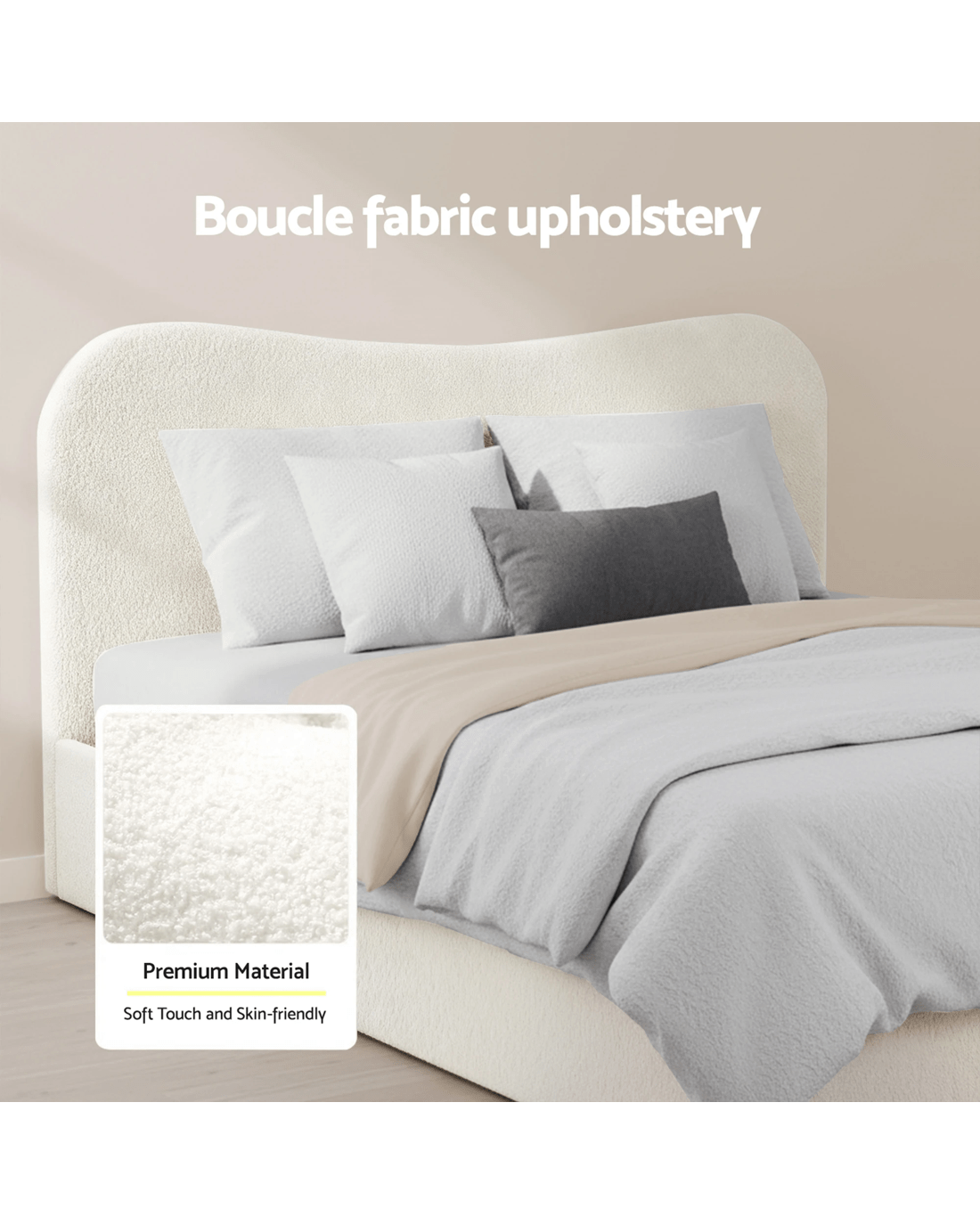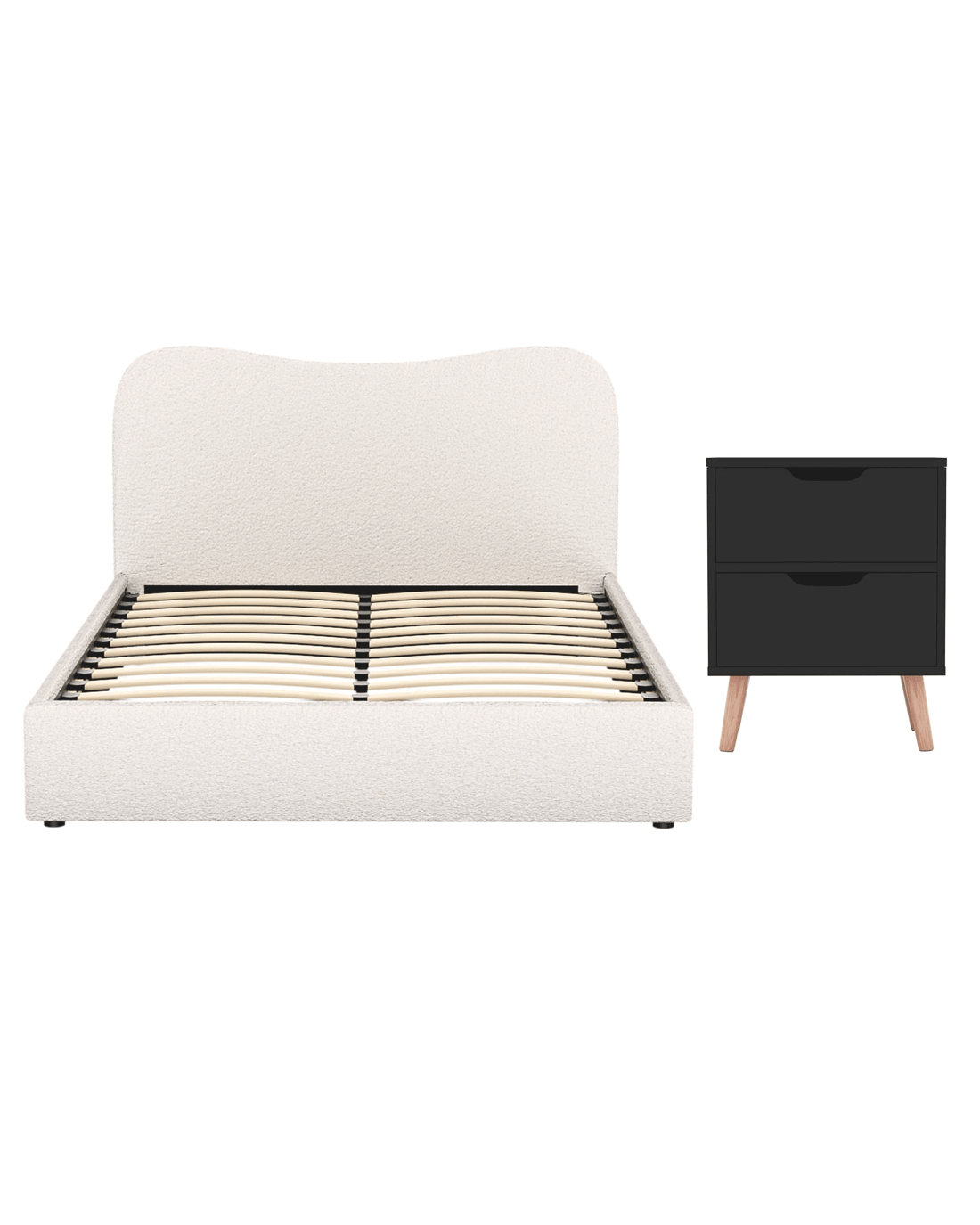 Complete your bedroom with the Artiss Double Bed Frame and Bedside Table Set. The boucle fabric bed frame features a padded headboard and wooden slat support. The black bedside table includes two drawers with anti-rust coated slides and splayed beech legs. Both items offer easy assembly and durable construction. Bundle includes bed frame, bedside table, and manual.