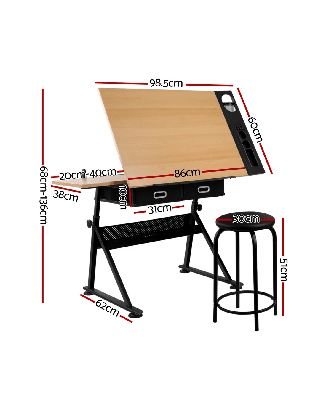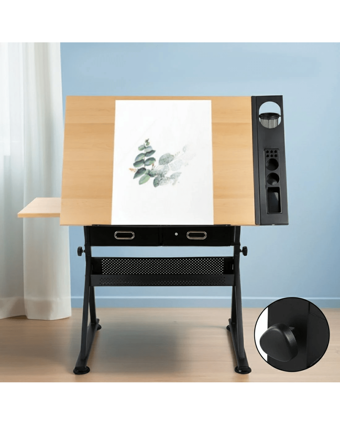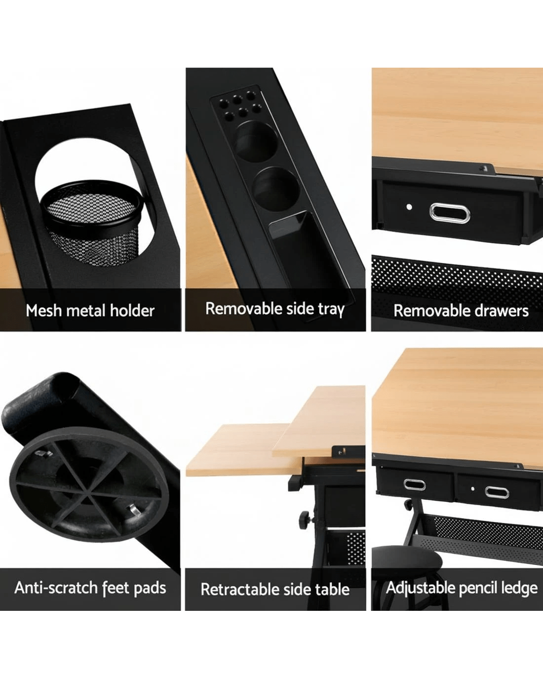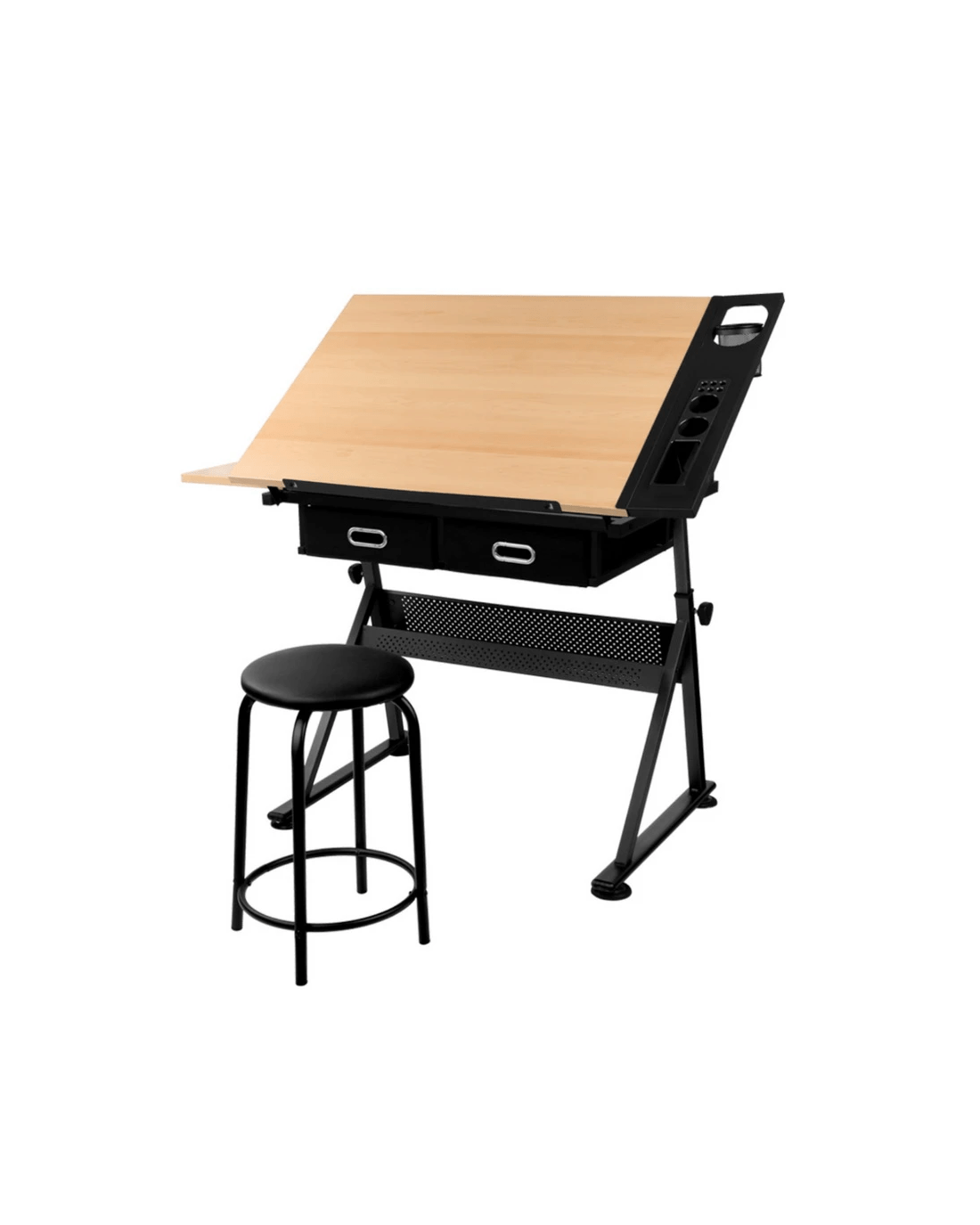 With its wide MDF board desk top and an apron edge, the Drawing Desk is assured of safe use with utmost functionality. Better still, under the main top is an extra slide-out table to extend your working zone. The removable side pigment shelf and drawers, and a hollow metal shelf also help to provide useful working and drawing essentials storage. As for the frame, the black powder-coated finish steel-constructed structure is designed to be durable while the anti-scratch feet pads keeps the Desk firmly in place. Not least, the Drawing Desk can be set at your preferred working angle and height for optimum efficiency and a padded leather stool included for comfort and style.