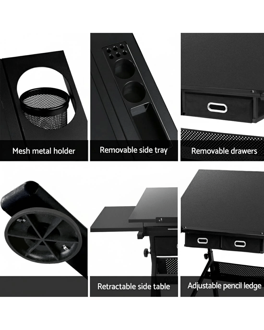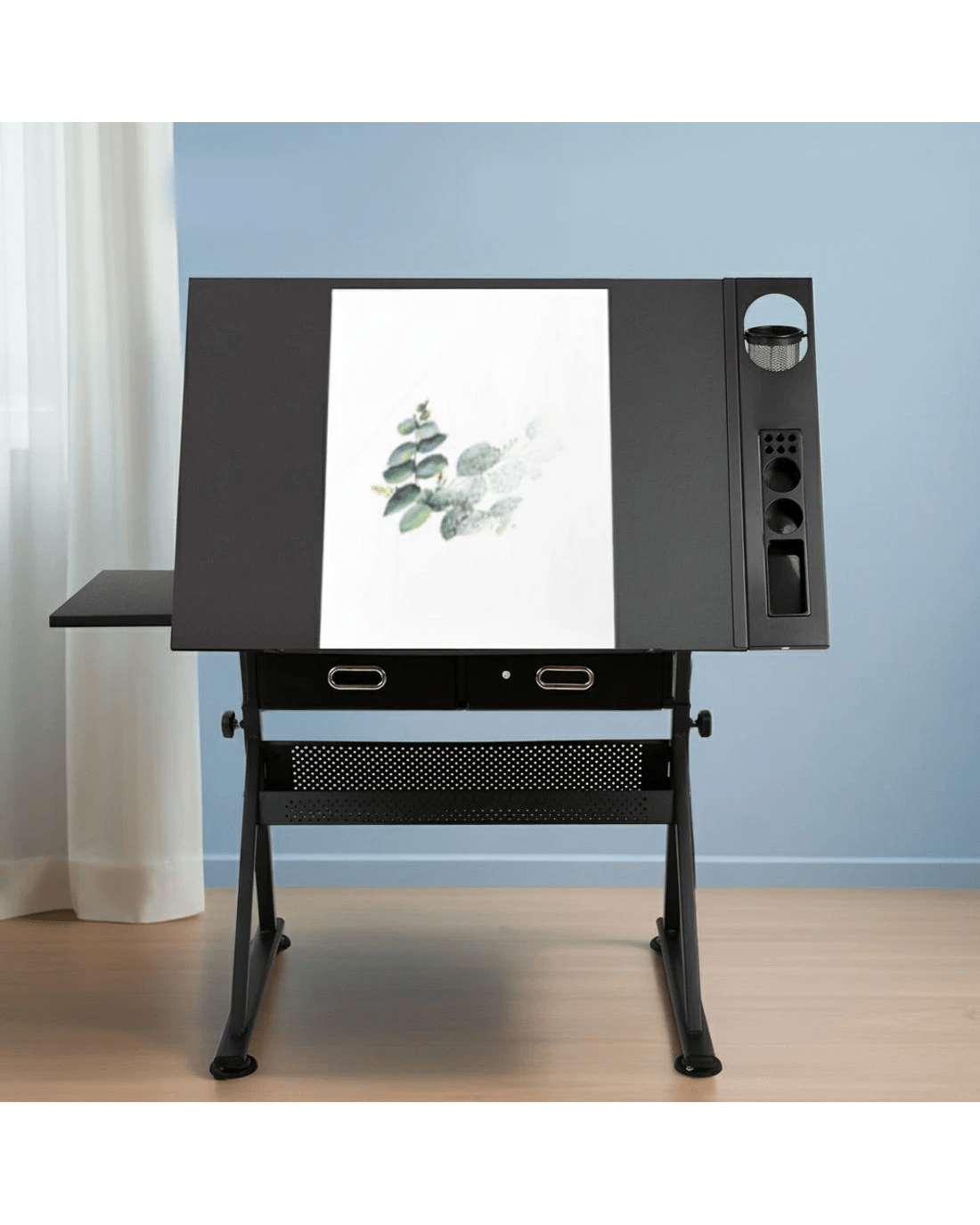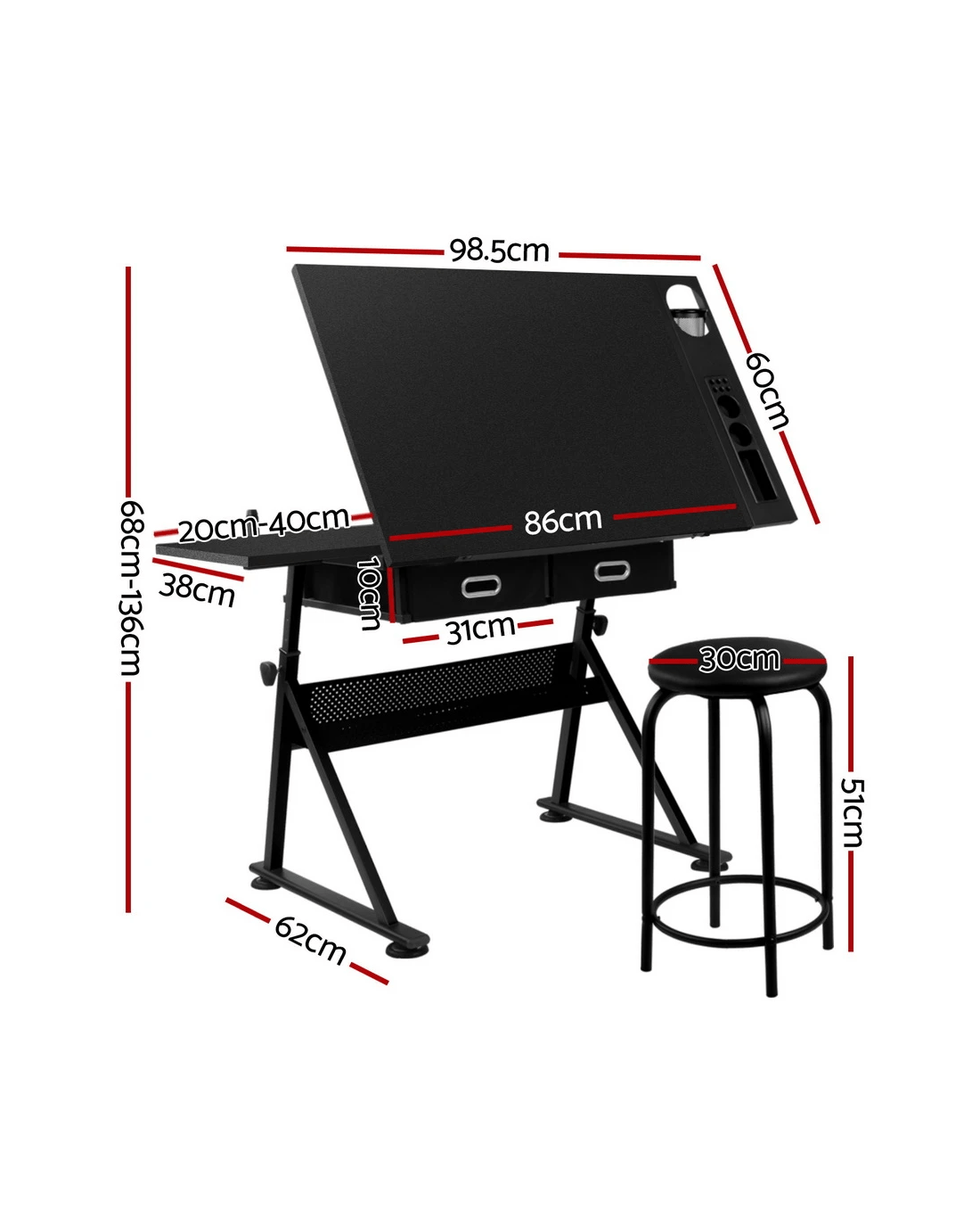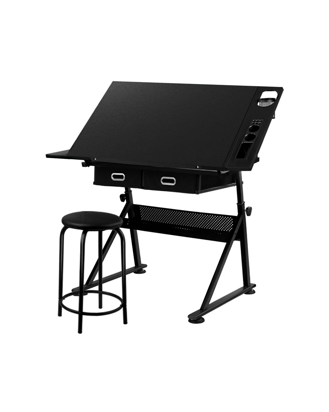 With its wide MDF board desktop and an apron edge, the Drawing Desk is assured of safe use with utmost functionality. Better still, under the main top is an extra slide-out table to extend your working zone. The removable side pigment shelf and drawers, and a hollow metal shelf also help to provide useful working and drawing essentials storage. As for the frame, the black powder-coated finish steel-constructed structure is designed to be durable while the anti-scratch feet pads keep the Desk firmly in place. Not least, the Drawing Desk can be set at your preferred working angle and height for optimum efficiency and a padded leather stool included for comfort and style.