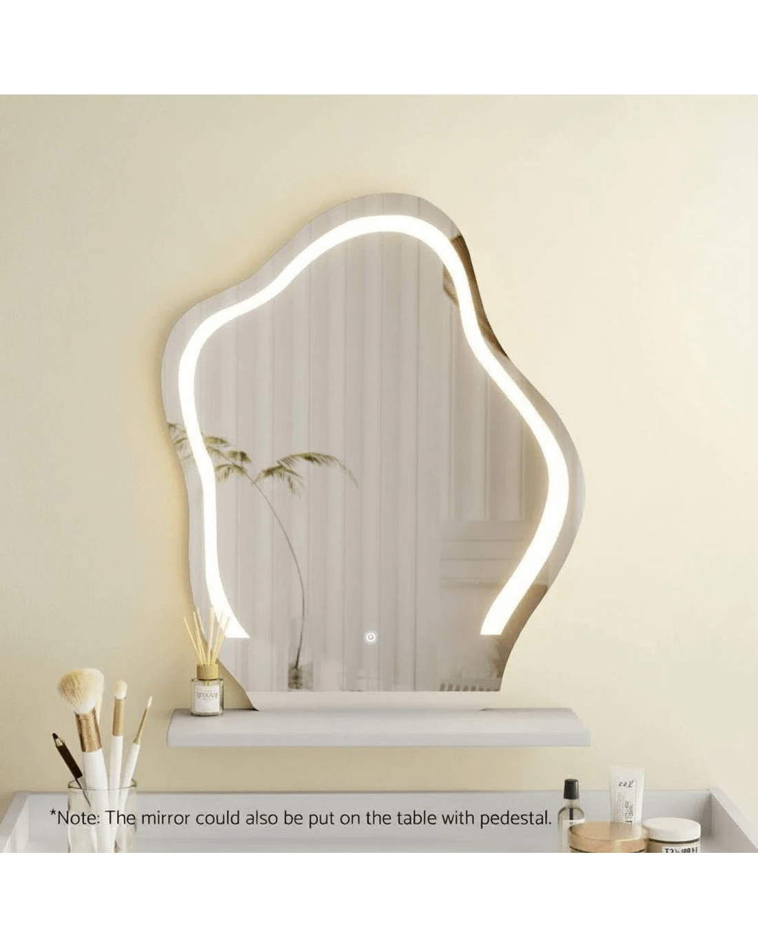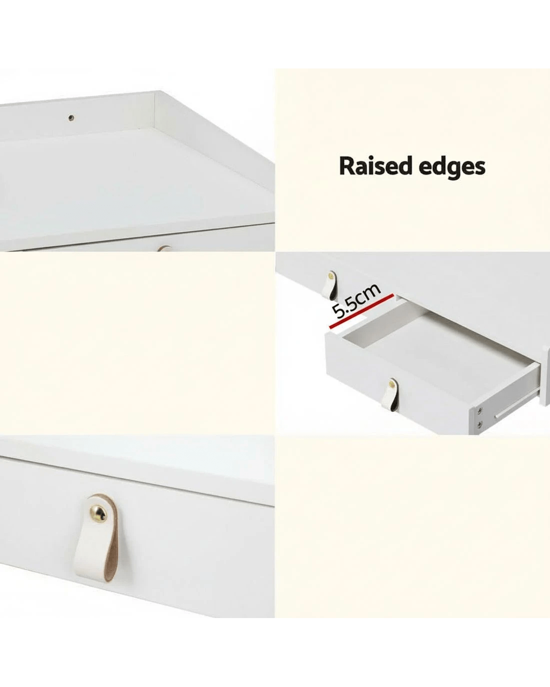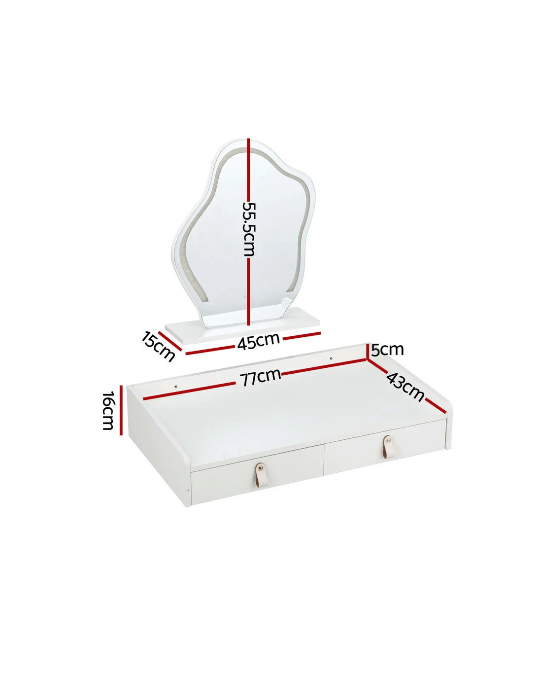 Make mornings simple with the Artiss Daphne Dressing Table. Crafted from 15mm thick particle board and designed for long-lasting use, the wall-mounted vanity with a cloud-shaped mirror exudes elegance and a sense of ethereal beauty. The mirror comes equipped with an LED strip that features warm, neutral and daylight white colours so you can look great under any light. With the convenience of a USB cable, you can effortlessly charge your devices while indulging in your beauty routine. Designed with practicality in mind, this vanity table boasts two spacious storage drawers, providing ample space to organise your essentials. The anti-rust drawer runners ensure smooth and seamless operation, guaranteeing a hassle-free experience. Emphasising ease and convenience, this floating vanity table is not only easy to maintain and clean but also a breeze to assemble. With its sleek design and luxurious features, it is the perfect embodiment of opulence and functionality. Elevate your space with this remarkable piece and indulge in the ultimate luxury of the Artiss Daphne Dressing Table.