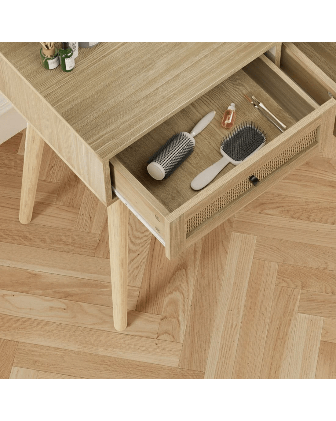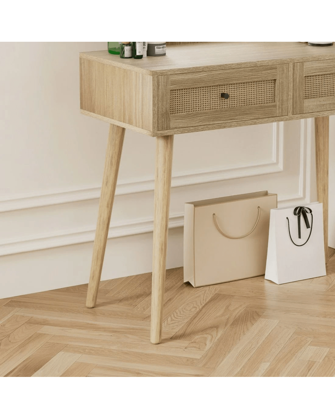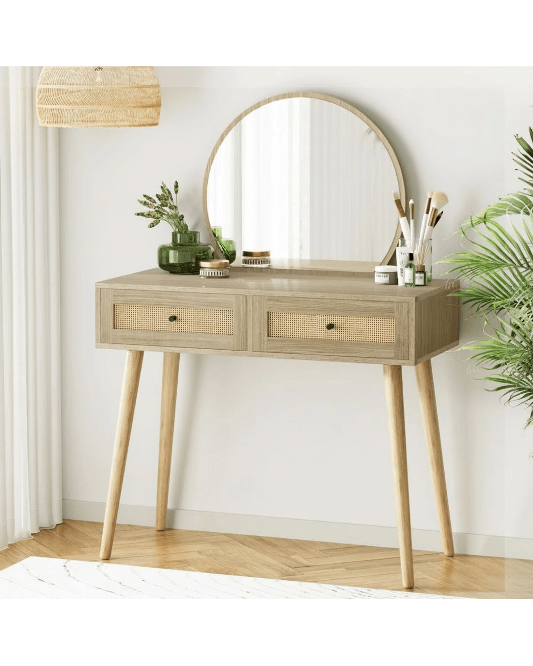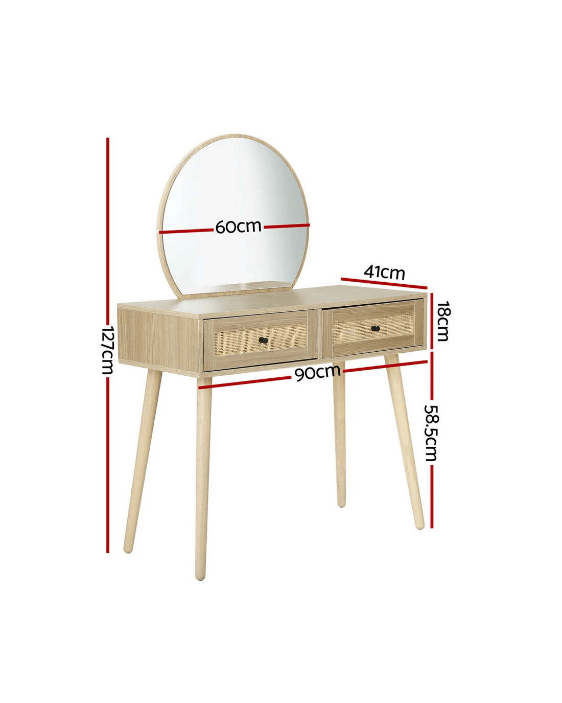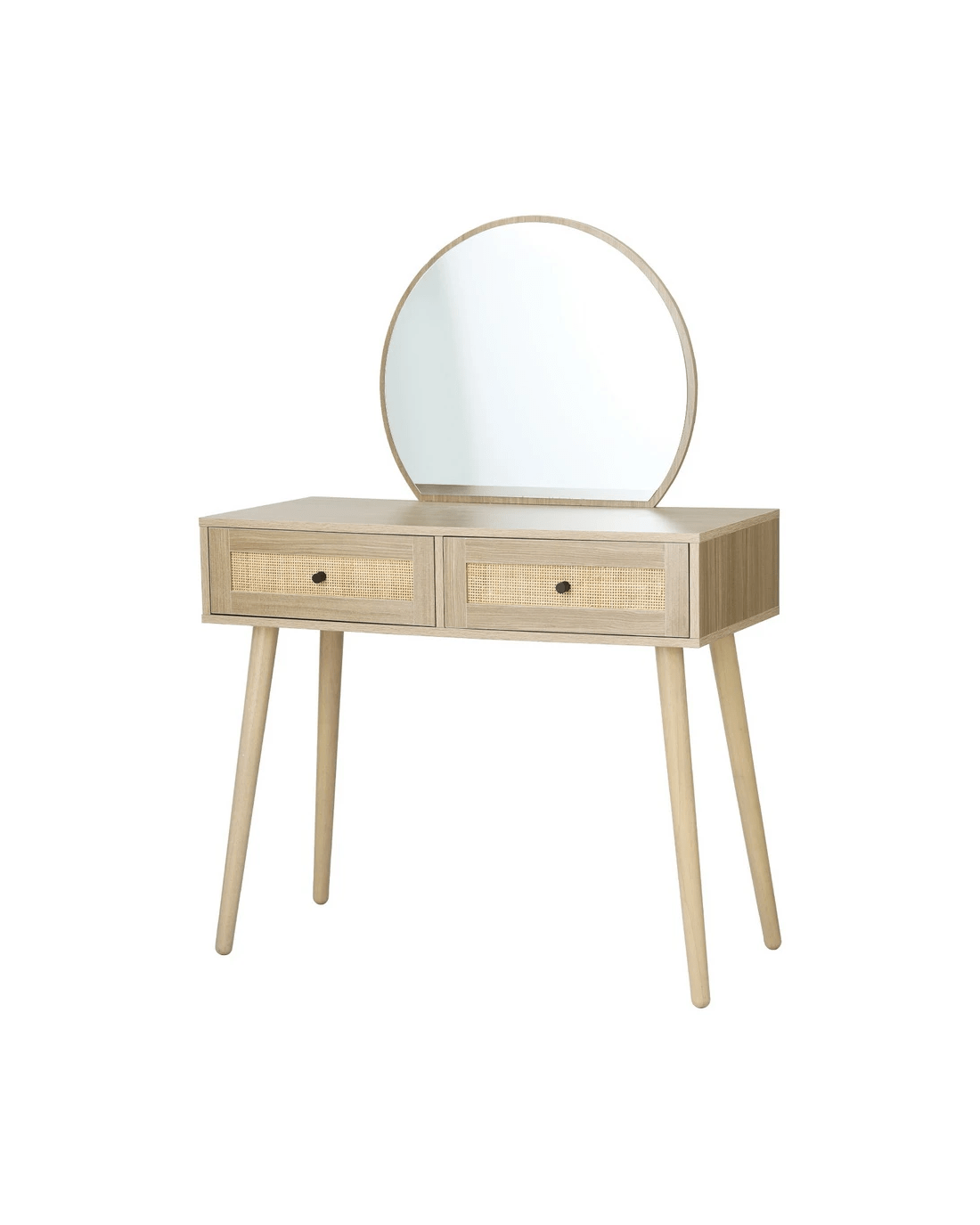 Complete your morning routine with the Artiss Frances Dressing Table. Made from 15mm thick particle board with a smooth melamine finish, real rattan drawers and solid rubberwood legs, the dressing table is designed to last through many early mornings and late evenings. With two generous storage drawers, you can fit all of your make-up, accessories and other health and beauty essentials. The anti-rust drawer runners ensure smooth opening every time. Splayed rubberwood legs keep the table stable and contribute to the generous 60kg weight capacity. The round mirror allows you to get up close and personal for skincare and makeup application and a full view of your ensemble when you're done. With the Artiss Frances Dressing Table, you'll always be ready for what the day brings.