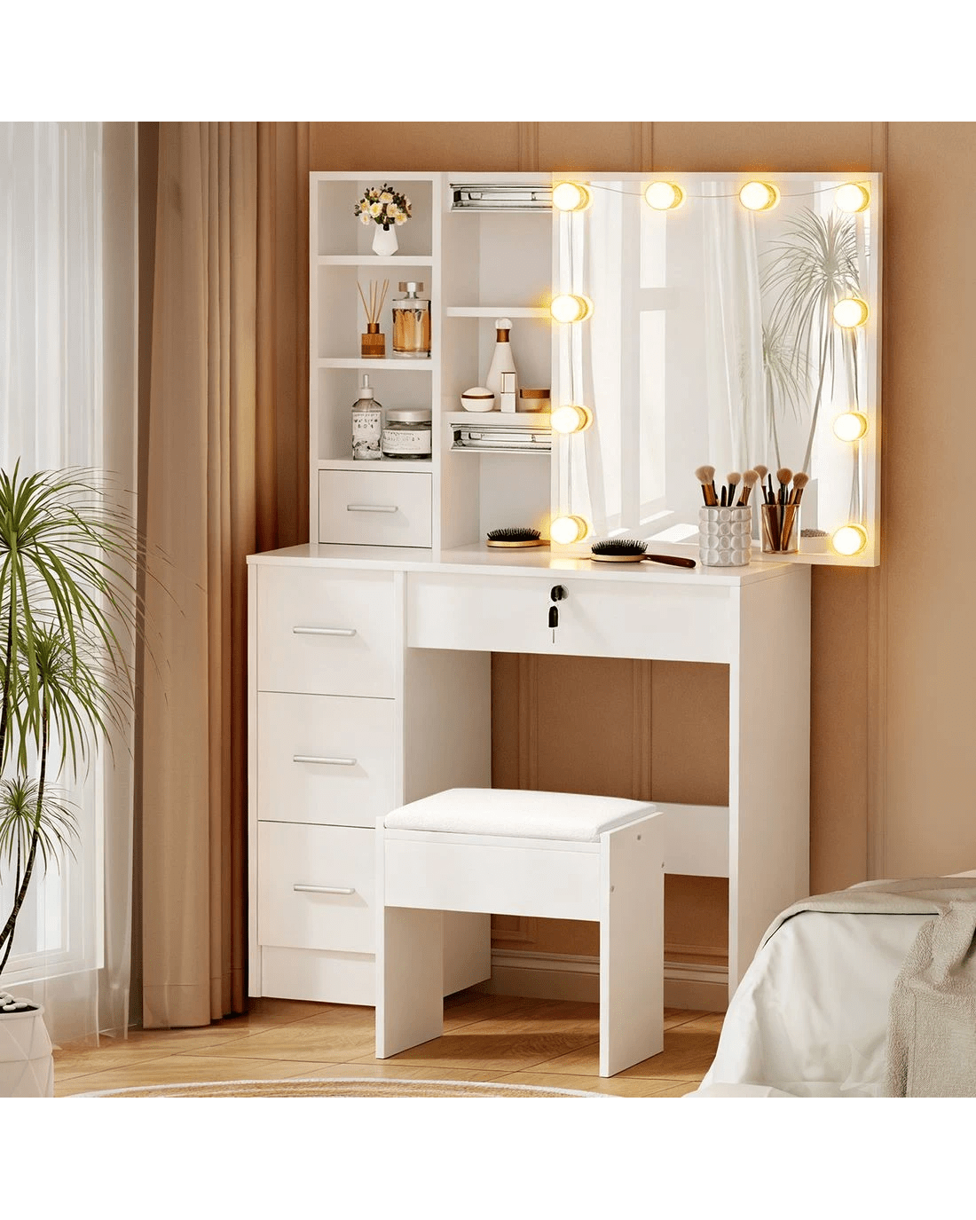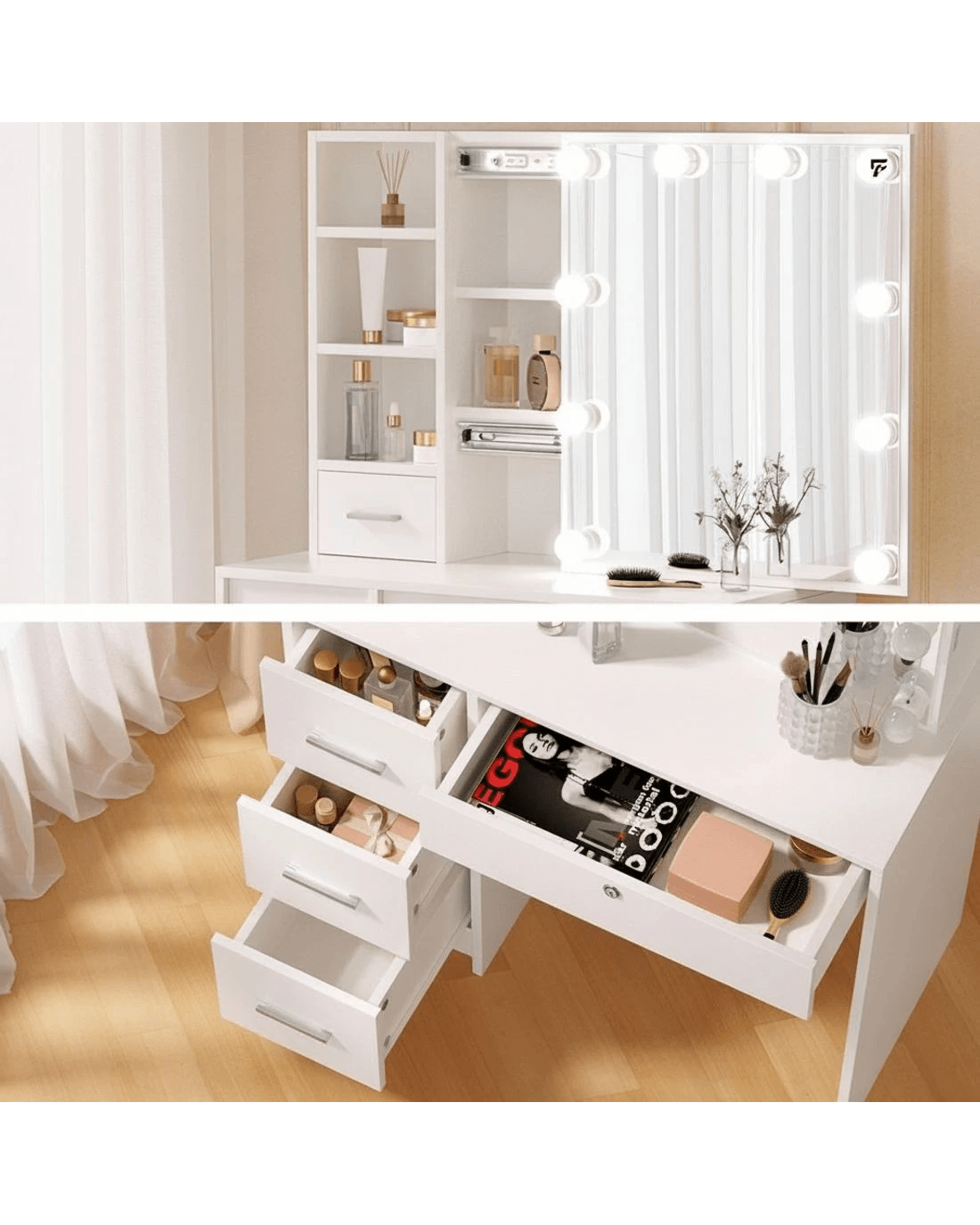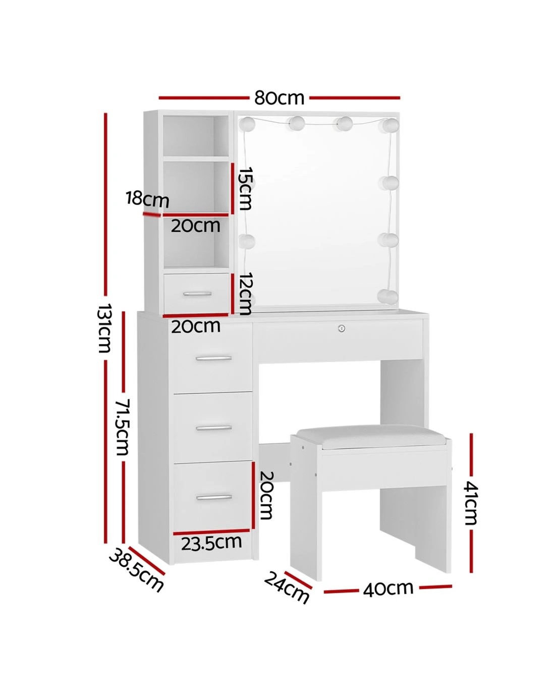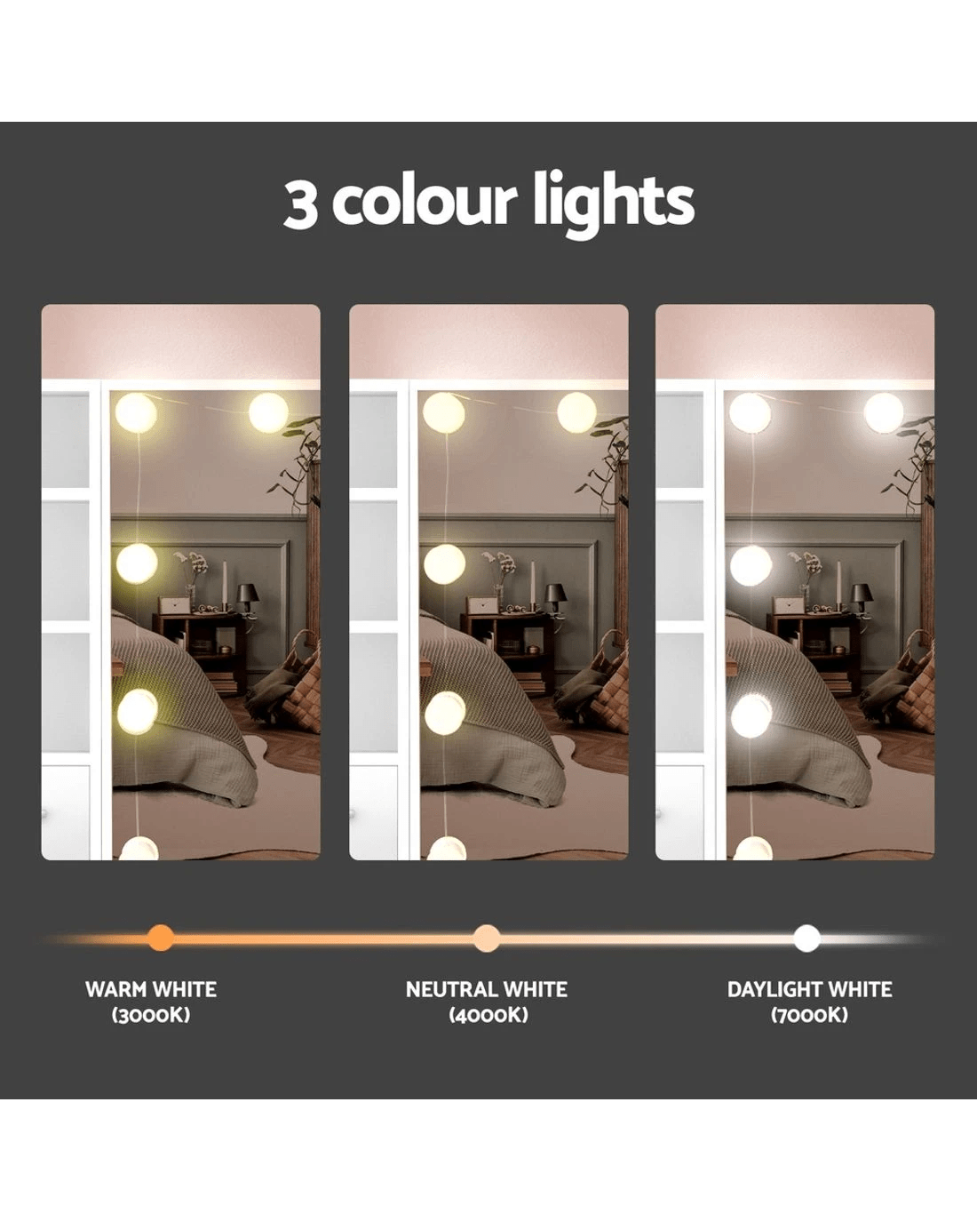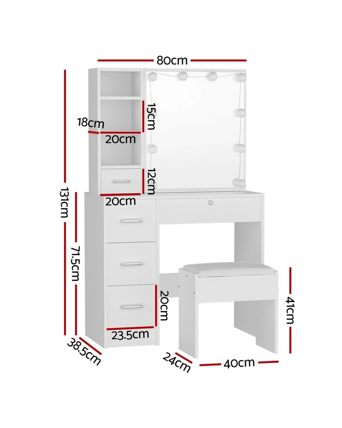 Feel like a star straight out of Hollywood with the Artiss Dylan Dressing Table. Packed with generous storage and other convenient features, your new beauty routine will be a breeze. Made from quality MDF particleboard with a melamine finish, the table is built to last. The Hollywood-style makeup mirror is surrounded by bright LED bulbs for the perfect illumination. Choose from warm, neutral and daylight white light so you can always look stage-ready. The vanity features three open shelves that you can use to display trinkets or beauty products. Five generous storage drawers with silver handles open smoothly on anti-rust runners, giving you instant access to your beauty essentials. A foam-padded PU leather stool allows you to sit comfortably while applying make-up or skincare and can be neatly tucked away when not in use. Easy to install and even easier to maintain, you'll love getting ready for the day in front of your new Artiss Dylan Dressing Table.