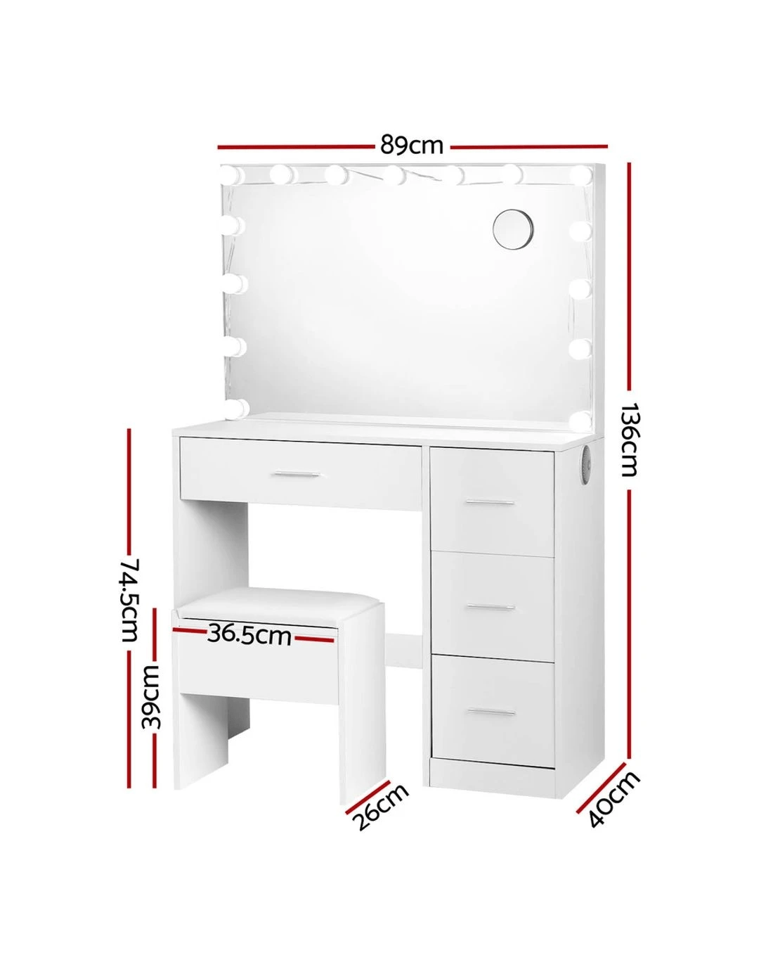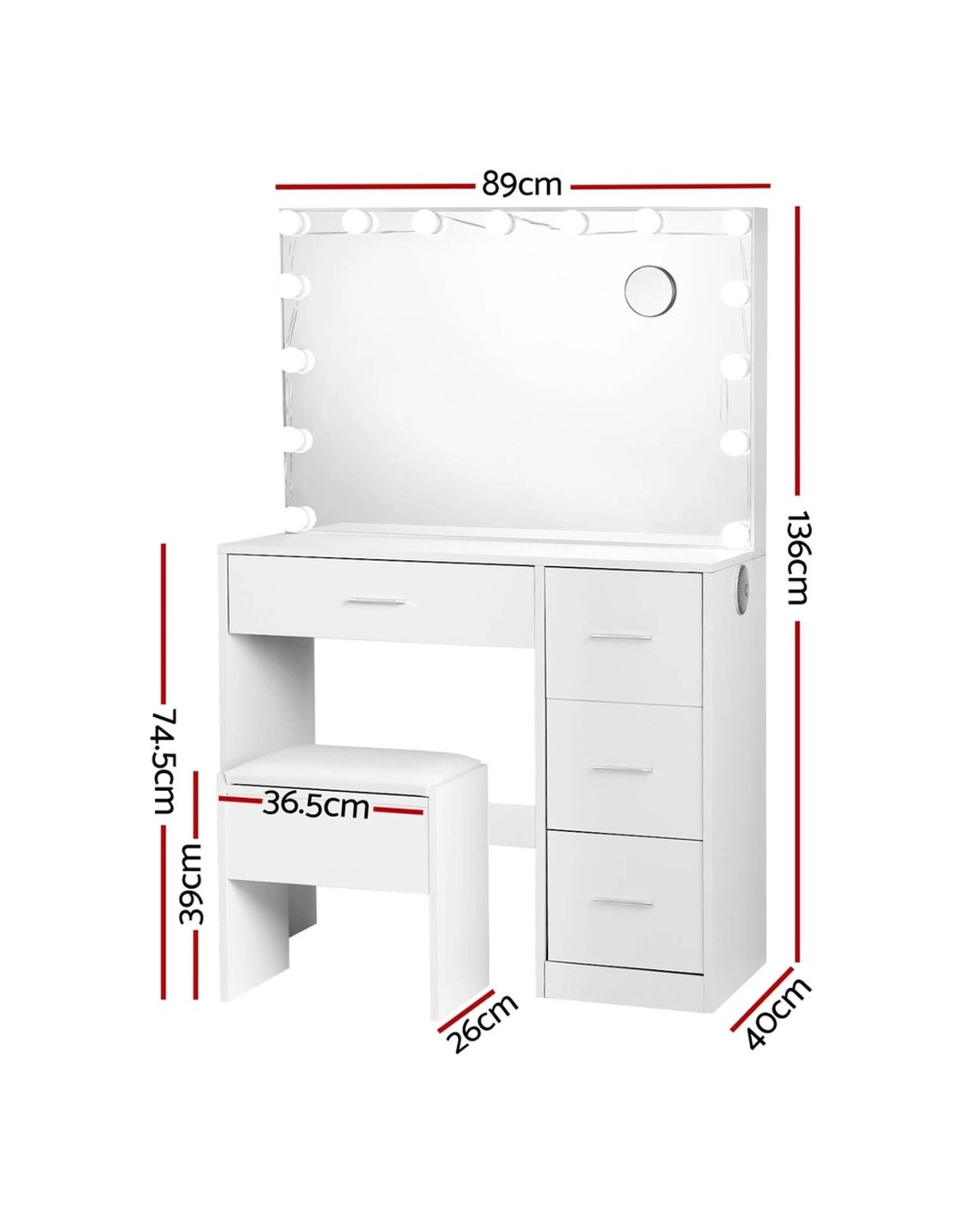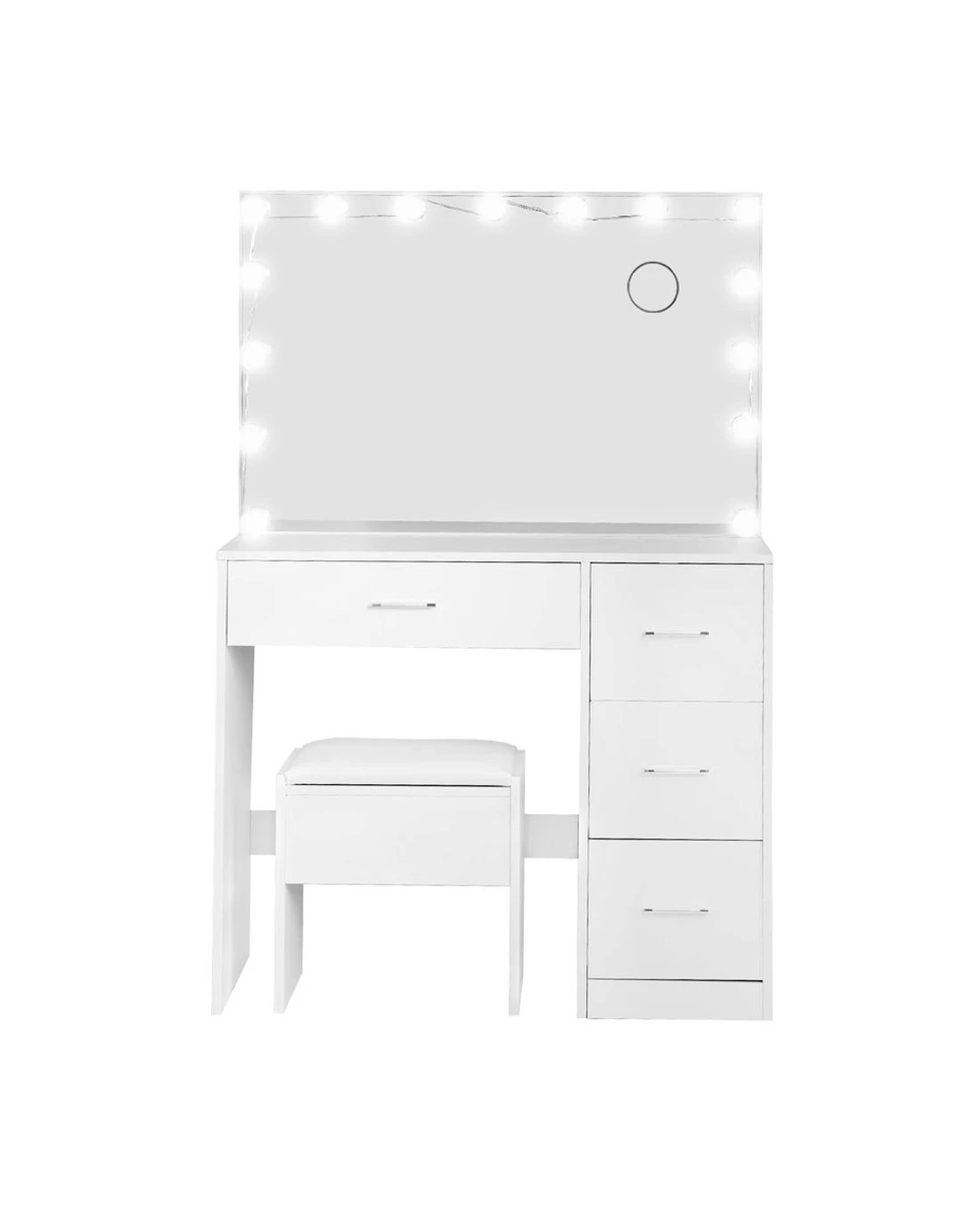 Feel like a star straight out of Hollywood with the Artiss Darcy Dressing Table. Packed with generous storage and other convenient features, your new beauty routine will be a breeze. Made from quality MDF particleboard with a melamine finish, the table is built to last. The Hollywood-style makeup mirror is surrounded by bright LED bulbs for the perfect illumination. Choose from warm, neutral and daylight white light so you can always look stage-ready. The vanity features four generous storage drawers with silver handles open smoothly on anti-rust runners, giving you instant access to your beauty essentials. A foam-padded PU leather stool allows you to sit comfortably while applying make-up or skincare and can be neatly tucked away when not in use. Easy to install and even easier to maintain, you'll love getting ready for the day in front of your new Artiss Darcy Dressing Table.