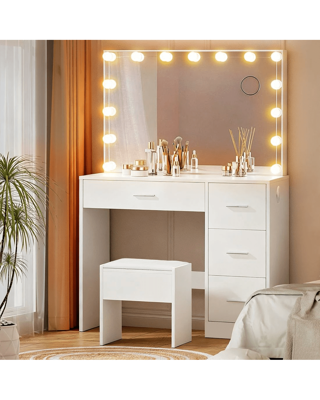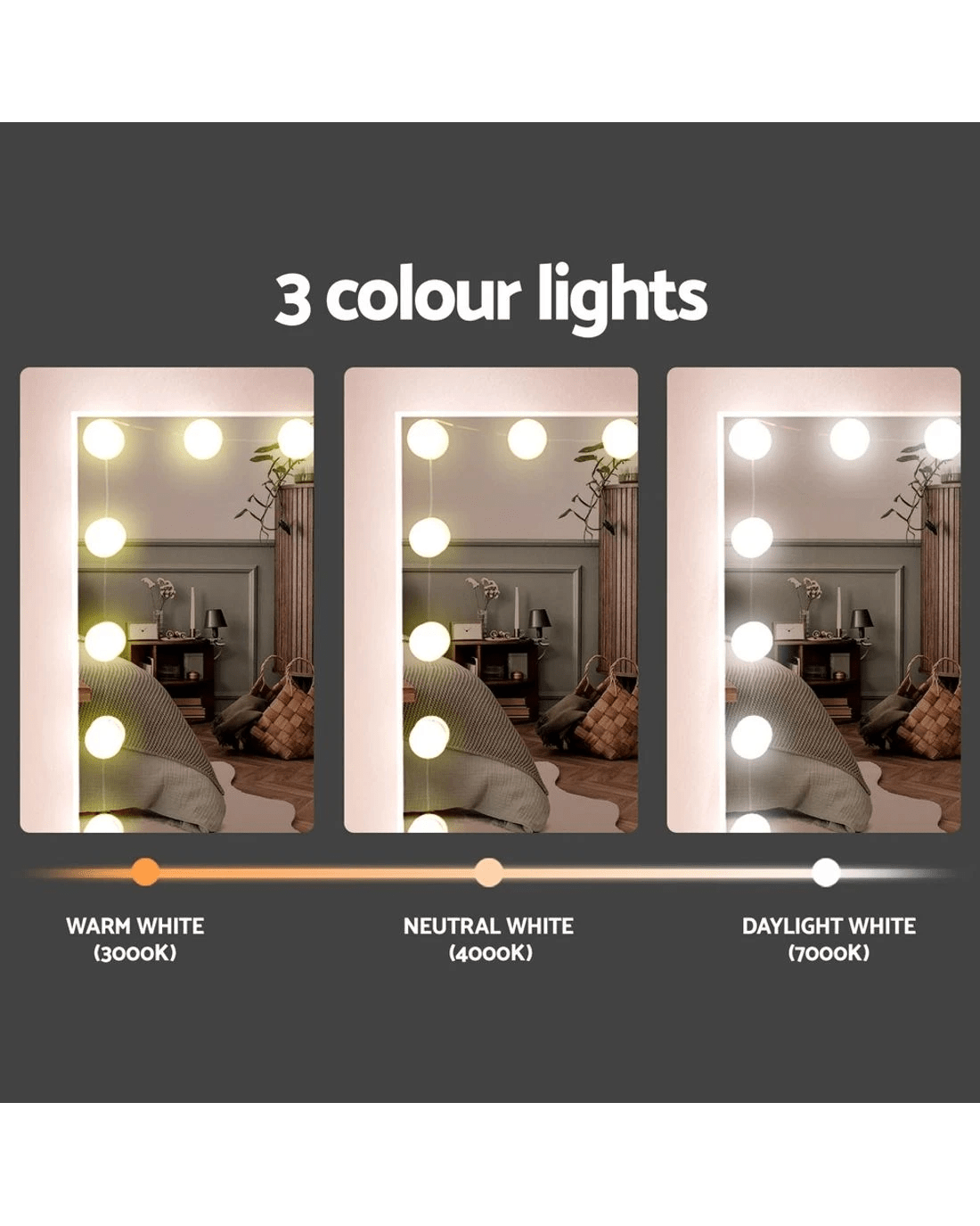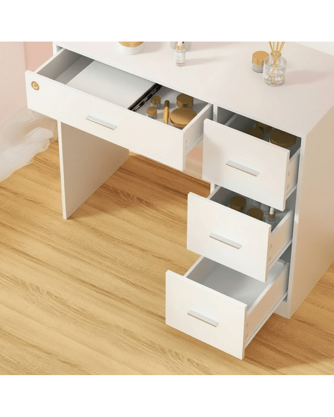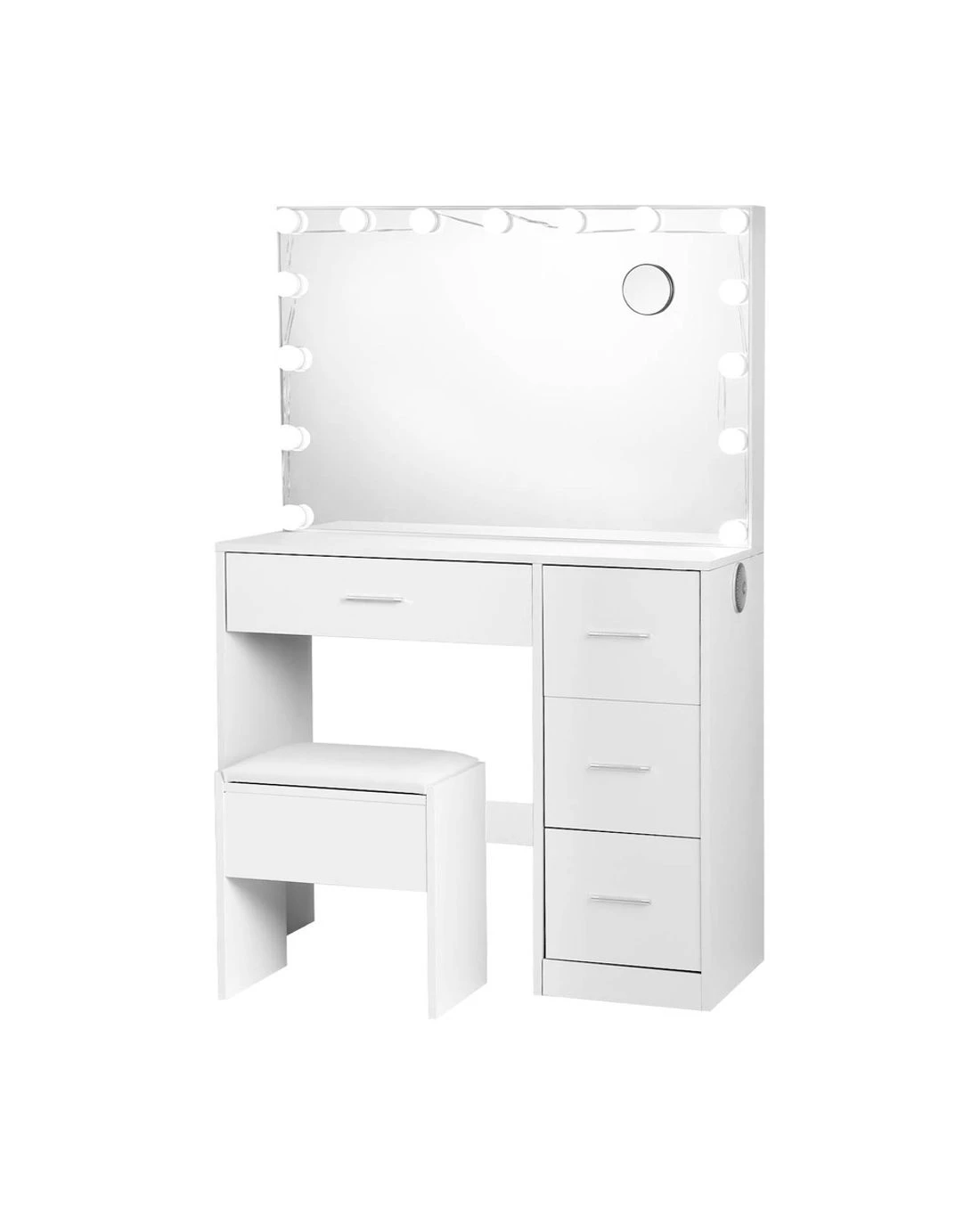 Feel like a star straight out of Hollywood with the Artiss Darcy Dressing Table. Packed with generous storage and other convenient features, your new beauty routine will be a breeze. Made from quality MDF particleboard with a melamine finish, the table is built to last. The Hollywood-style makeup mirror is surrounded by bright LED bulbs for the perfect illumination. Choose from warm, neutral and daylight white light so you can always look stage-ready. The vanity features four generous storage drawers with silver handles open smoothly on anti-rust runners, giving you instant access to your beauty essentials. A foam-padded PU leather stool allows you to sit comfortably while applying make-up or skincare and can be neatly tucked away when not in use. Easy to install and even easier to maintain, you'll love getting ready for the day in front of your new Artiss Darcy Dressing Table.