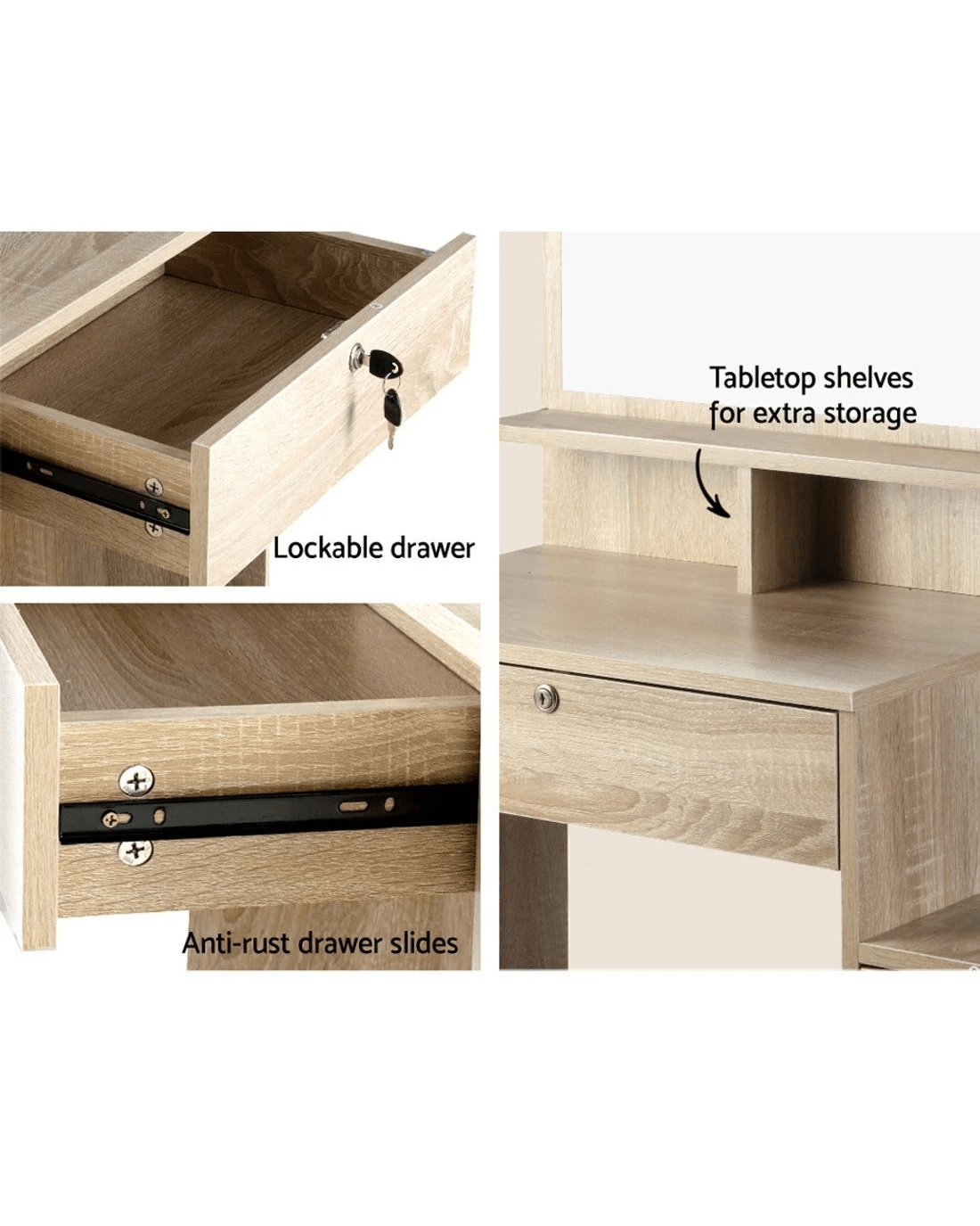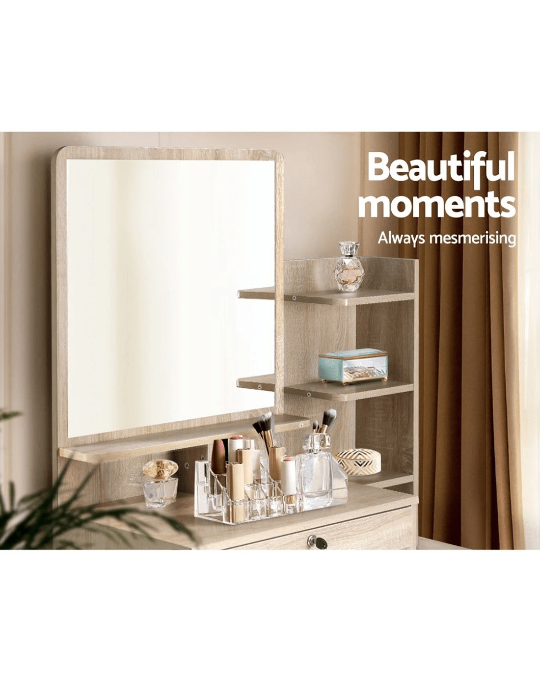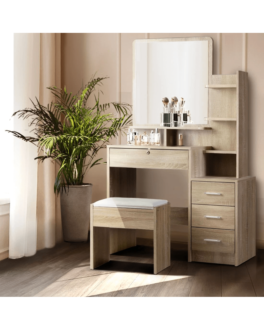 Featuring an aesthetically pleasing design and impressive functionality, the dressing table set makes a perfect upgrade to your bedroom. It comes with a big mirror, a spacious tabletop with ample storage space, and an elegant thick-padded dressing stool. For sure, nothing's better than having the luxury to sit down at a dressing table and get ready with all your makeup essentials at hand. The dressing table has four spacious drawers, three open shelves and extra display tabletop shelves. Show off your luxurious collection with the display shelves, place your eye-catching makeup boxes on the handy open shelves, keep safe your precious jewellery in a lockable drawer, and store the rest of your beauty collection in the drawers. Perfect for keeping everything organized and mess-free. Furthermore, it also has ample legroom so that you can sit comfortably and create those head-turning looks.