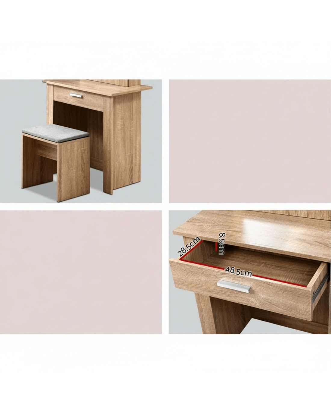 Beauty is in the eye of the beholder. And our Artiss Dressing Table Set is definitely a beauty to behold. Made of sturdy 15mm thick particle board with melamine, the dressing table is embellished with many practical features. There is a hidden cabinet with three shelves behind the large sliding mirror and one spacious drawer with a sleek aluminium handle, providing ample storage space for your cosmetics, perfumes, jewelleries, fashion accessories and other personal essentials. The table offers ample legroom too for you to groom with minimum hassle and a well-padded stool completes the ensemble. Not least, the smooth and impeccable wood finish makes for an easy blend with any decor as well as hassle-free maintenance. Create your own personal styling zone with our beautiful and functional dressing table set.
