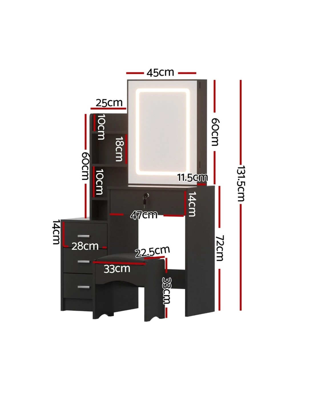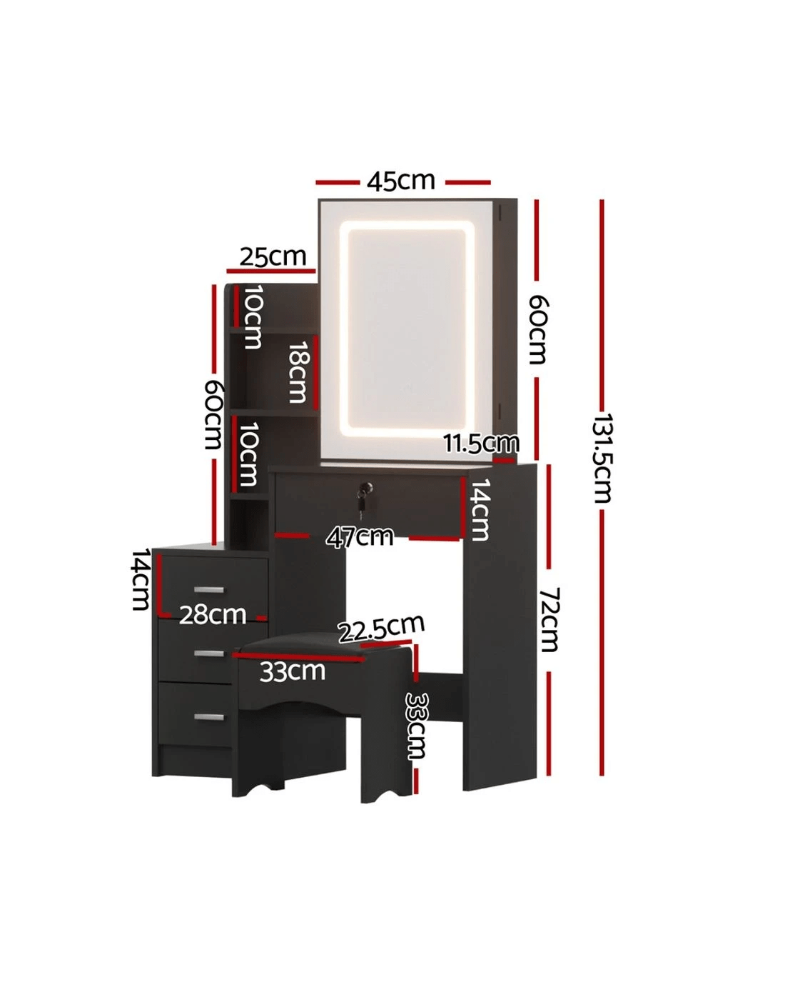 The Artiss LED Dressing Table is the ultimate blend of style and functionality. Featuring a sliding mirror door with hidden storage and 3 adjustable LED lighting options, this vanity table ensures perfect lighting for makeup application. Its 4 spacious drawers, including a lockable one, offer ample space to keep your beauty essentials organised. The foam-padded stool adds comfort, while the durable, easy-to-clean design ensures longevity. Ideal for bedrooms, apartments, or professional use, this modern vanity is a must-have for beauty enthusiasts.