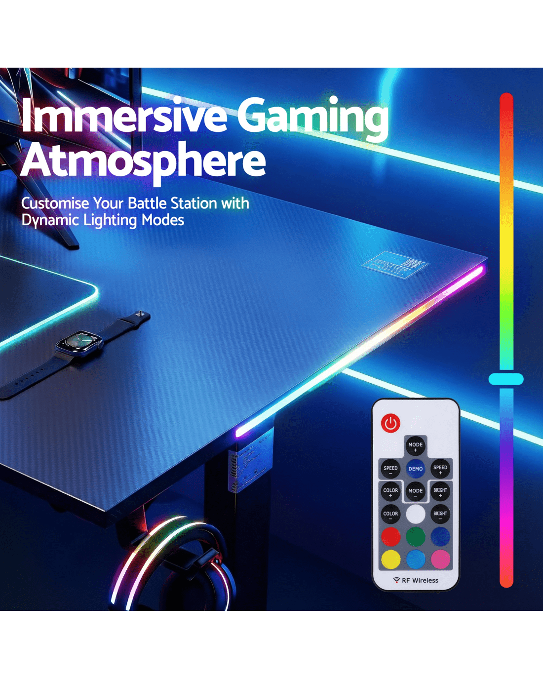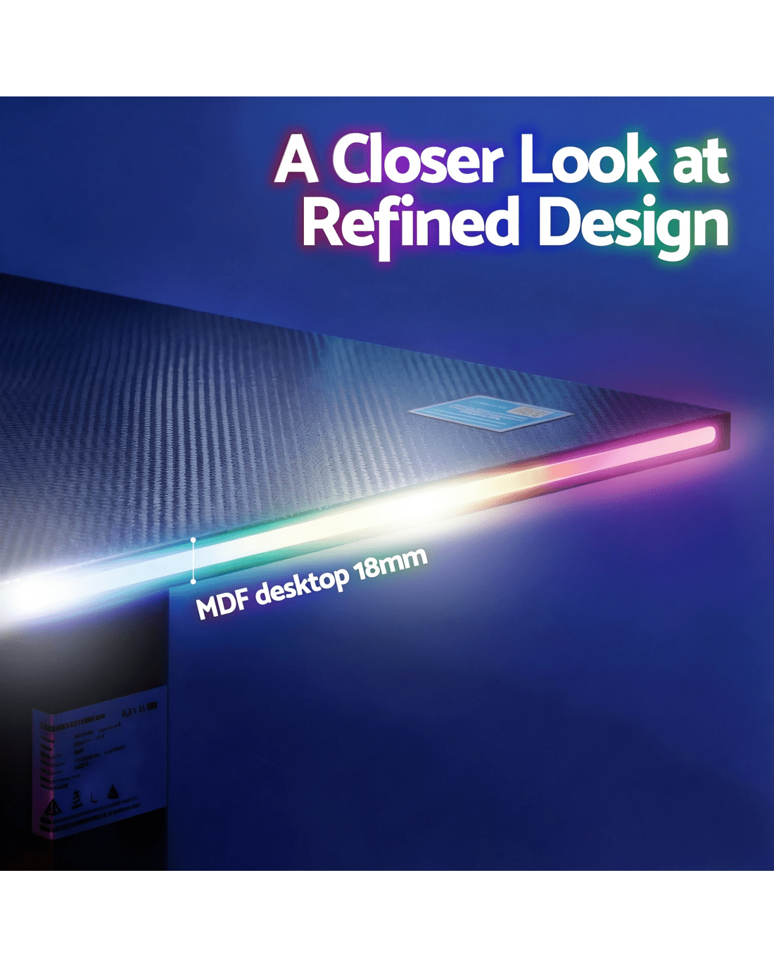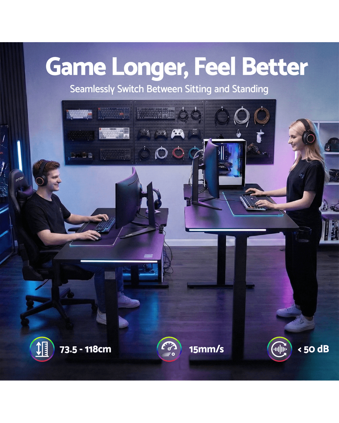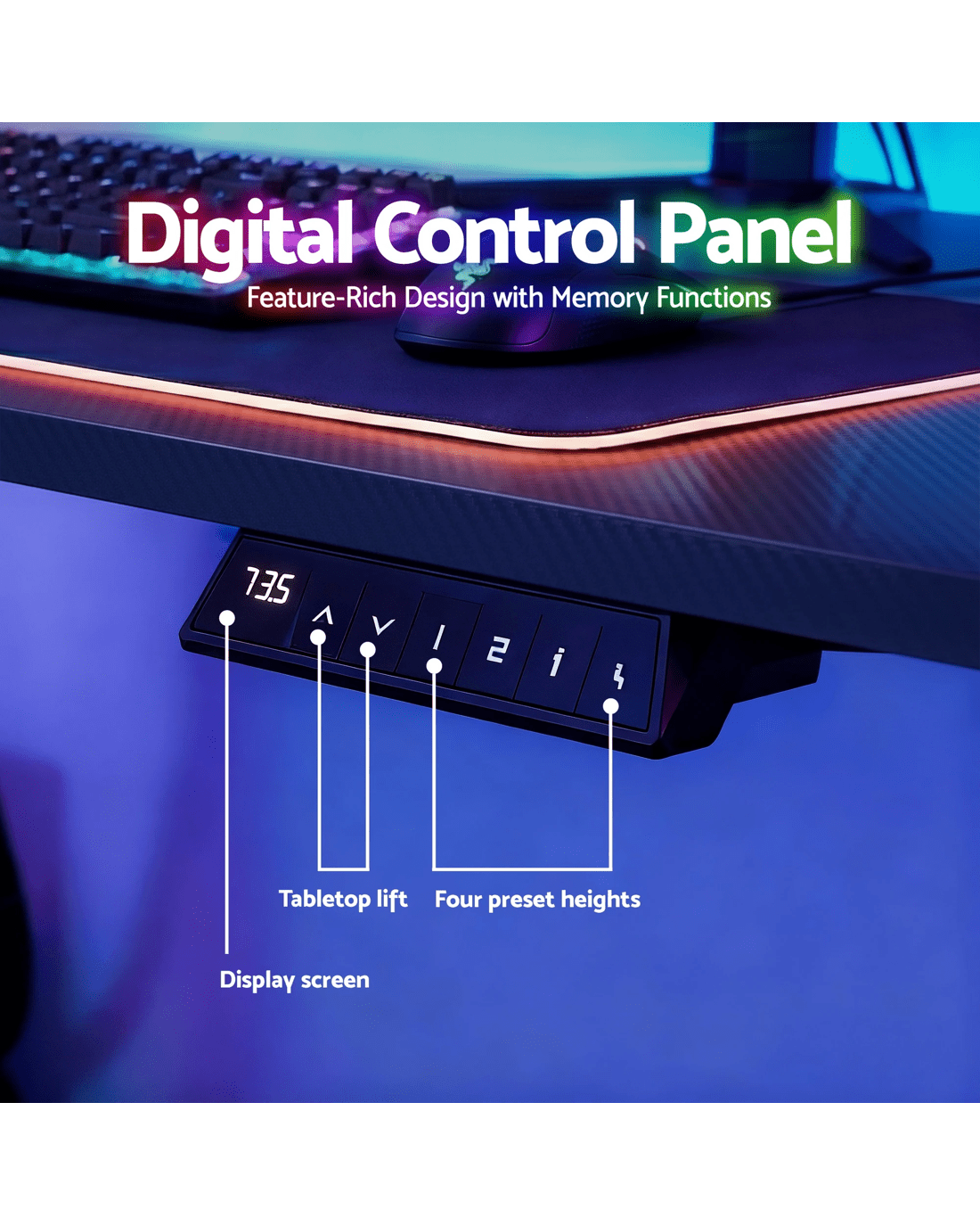 Designed for modern gamers, this Artiss gaming standing desk features electric height adjustment with memory control, RGB LED lighting, and a durable MDF desktop. Switch easily between sitting and standing while keeping cables organised for a clean gaming setup.