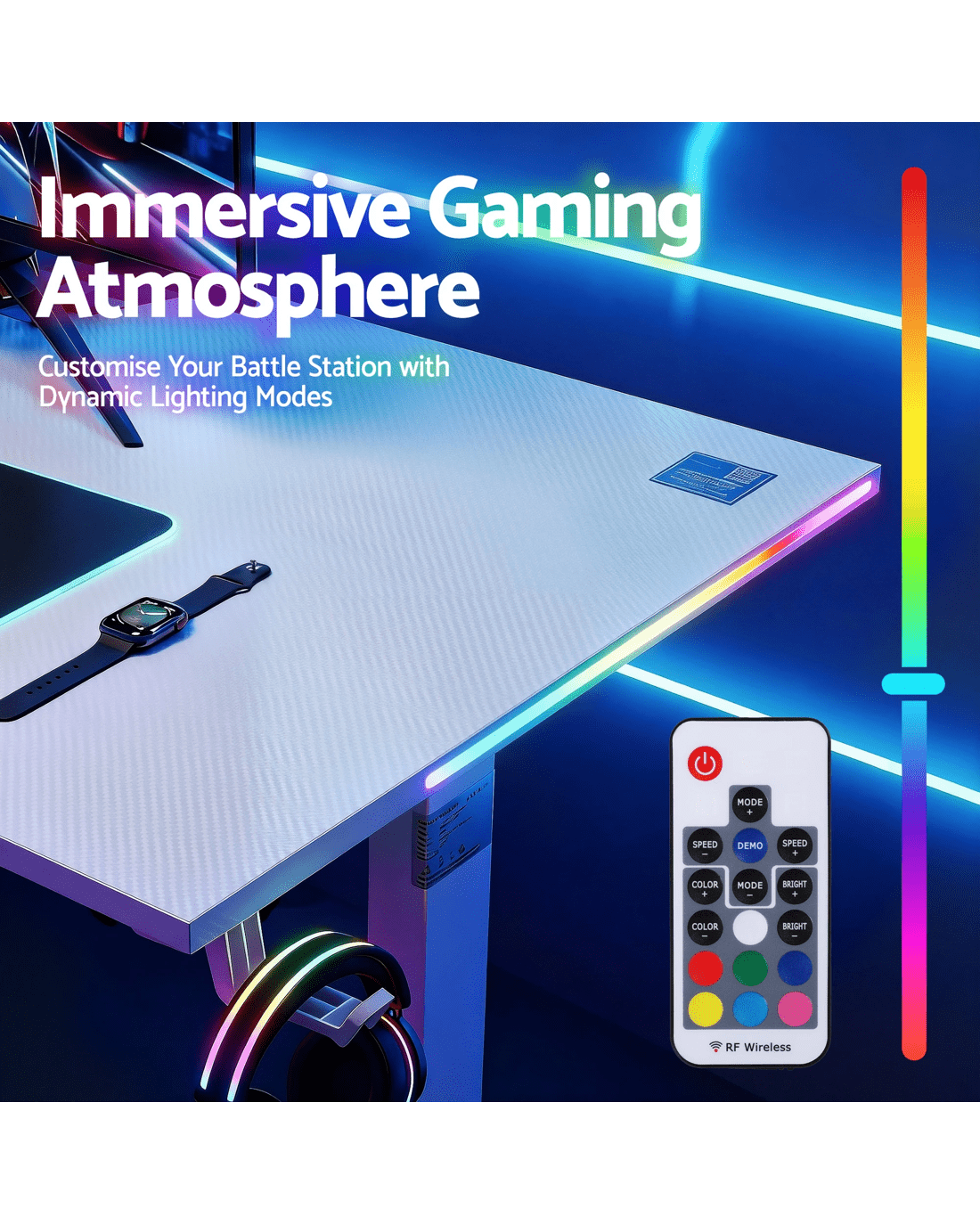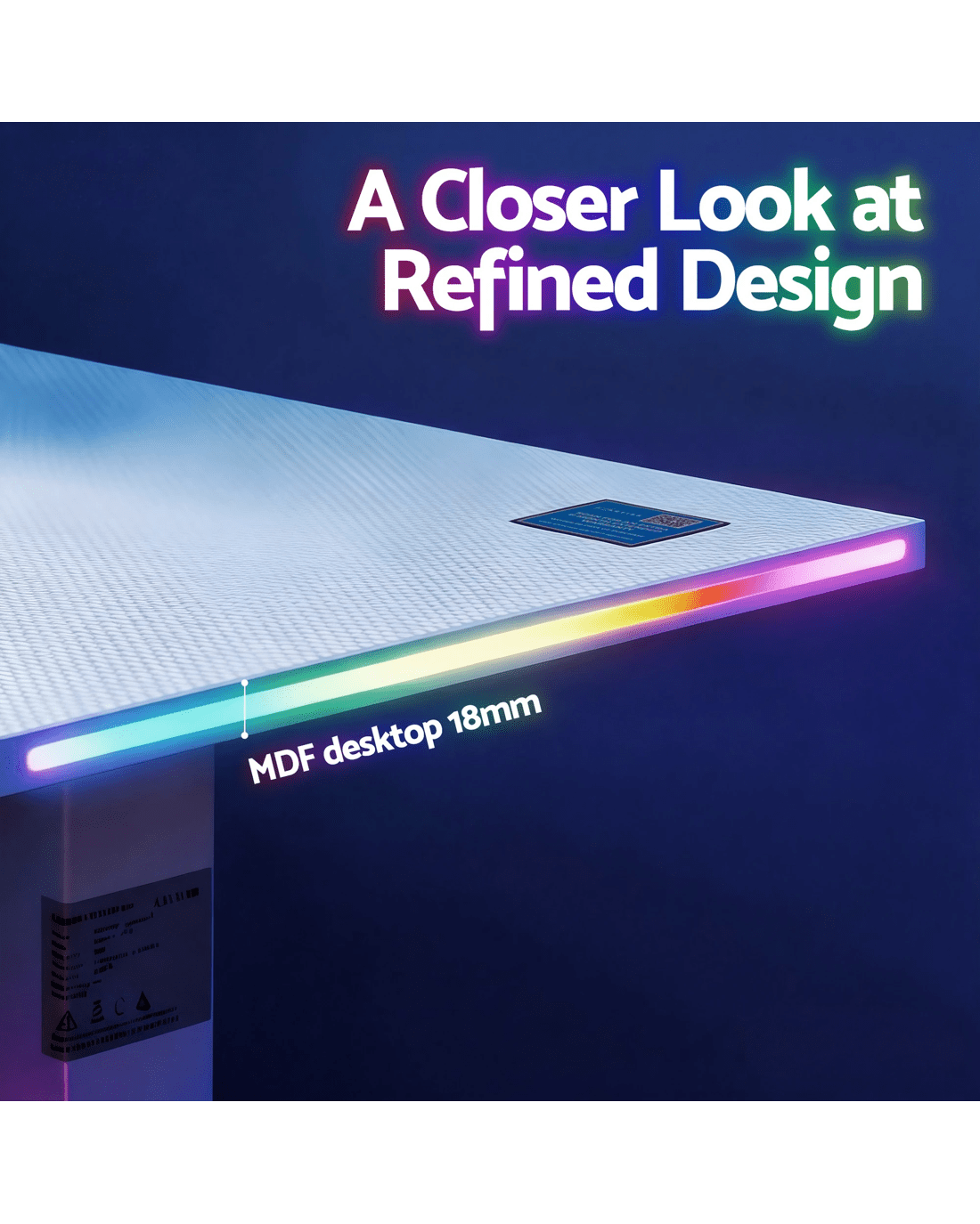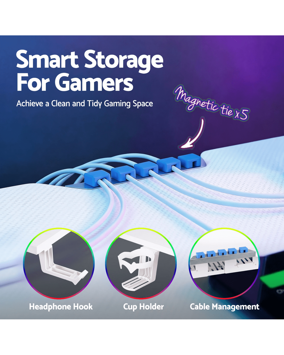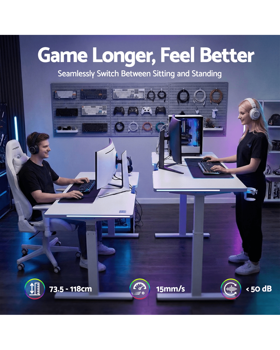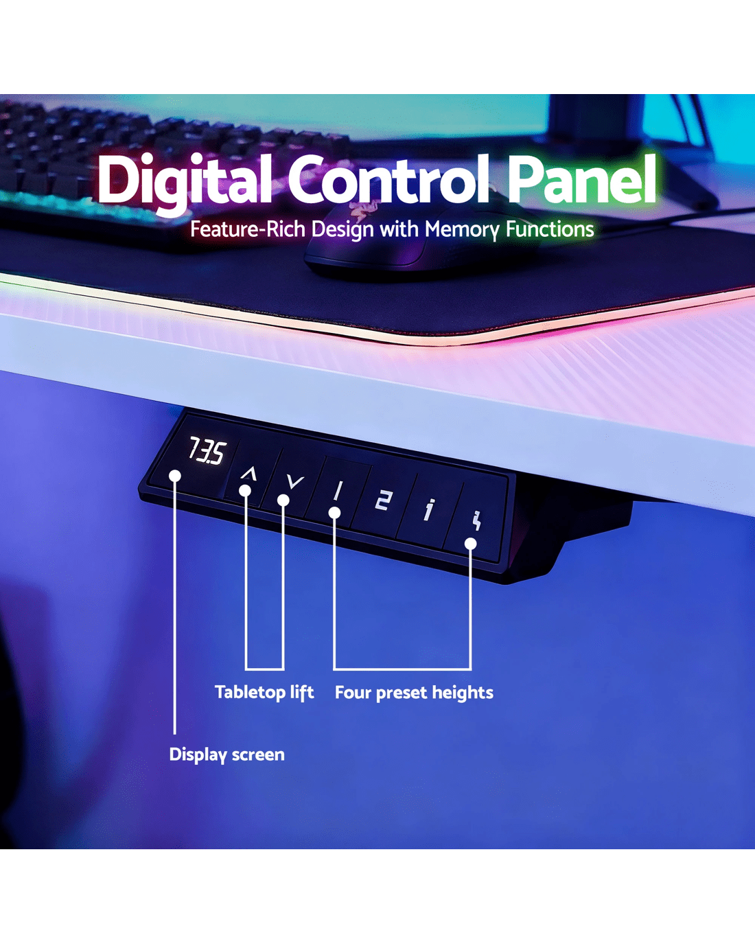 Designed for modern gamers, this Artiss gaming standing desk features electric height adjustment with memory control, RGB LED lighting, and a durable MDF desktop. Switch easily between sitting and standing while keeping cables organised for a clean gaming setup.
