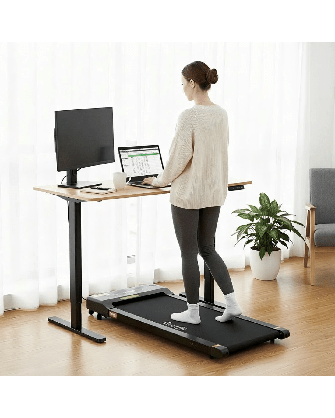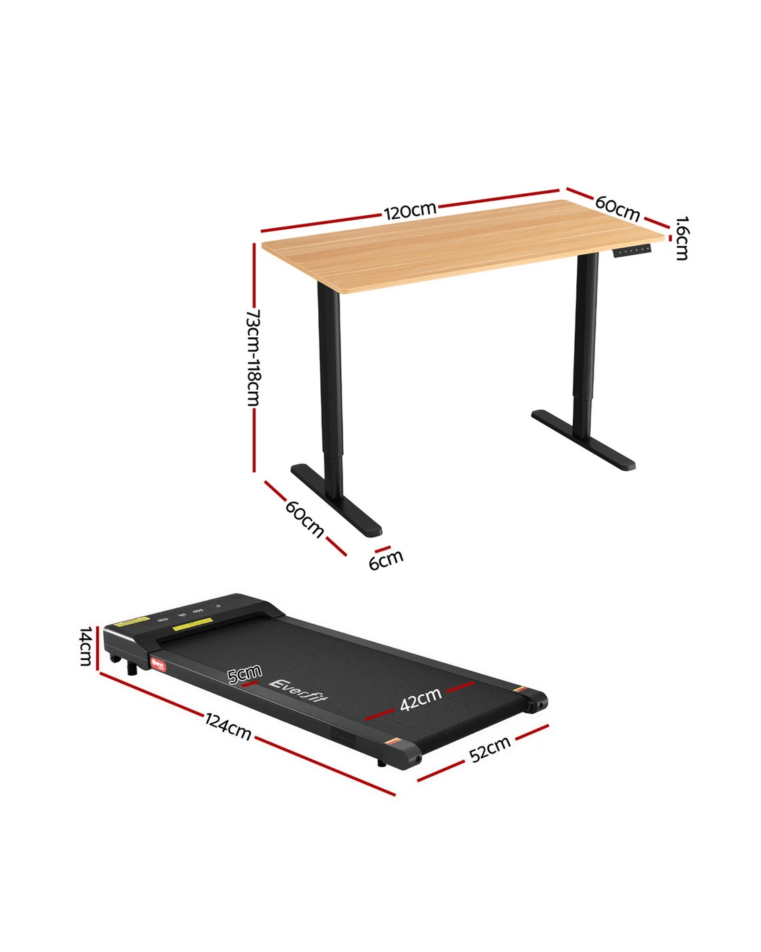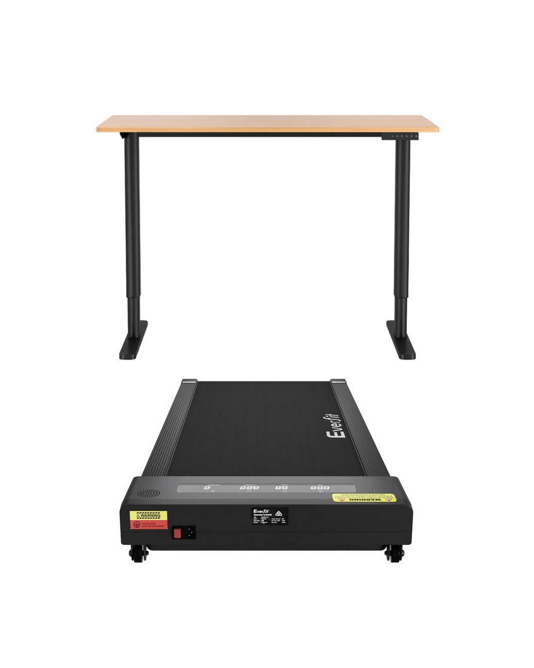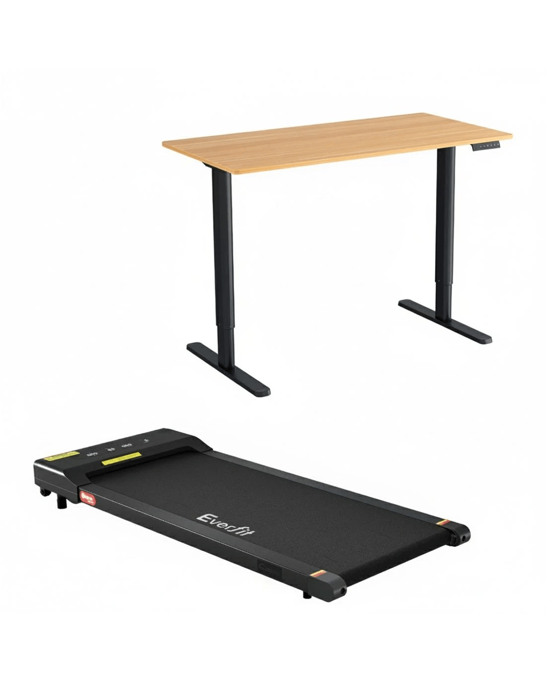 Boost your workday wellness with this innovative 2-in-1 motorised standing desk and treadmill combo. The desk features smooth, quiet height adjustment from 73cm to 118cm with memory presets. The treadmill offers a 1-10km/h speed range controlled by remote or Bluetooth app, featuring a shock-absorbent 400mm belt. Crafted with a high-quality powder-coated frame and contemporary design, this SAA & CE certified bundle is ideal for the active home office. Treadmill requires no assembly.