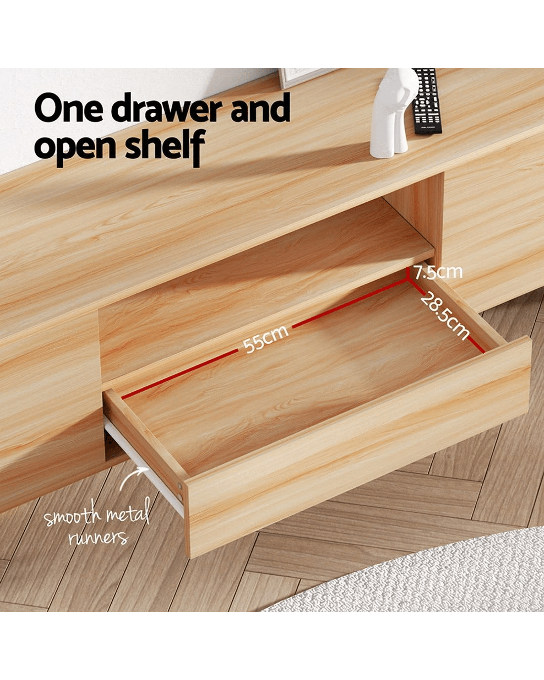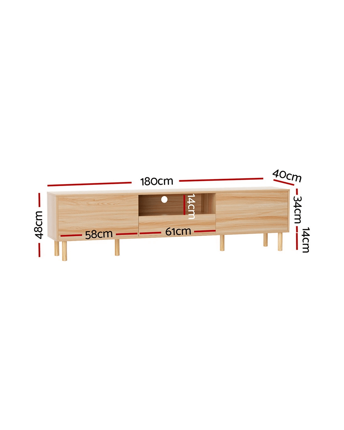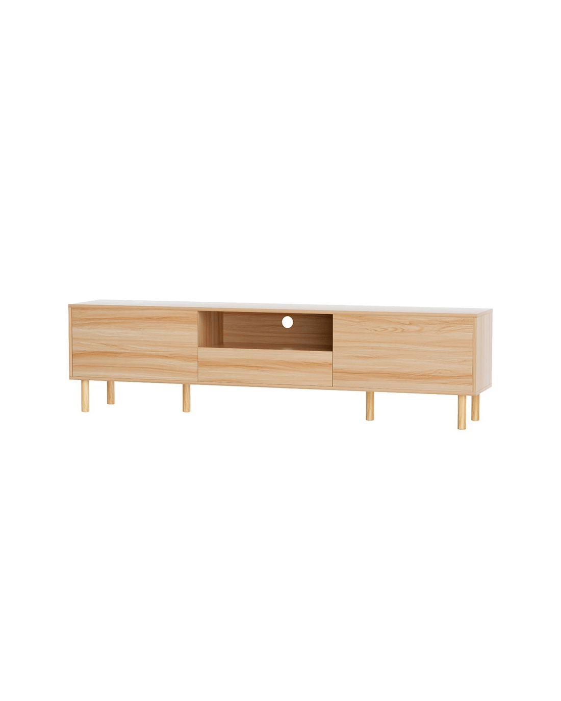 Style and functionality blend together in the beautiful Alex Entertainment Unit from Artiss. This lowline entertainment unit has the perfect height and storage capacity for all your entertainment needs, from your television to your sound system and consoles. The simple push-to-open drawer design and natural wood-grain finish will blend in perfectly with modern homes. Made from thick particleboard with a smooth melamine finish and solid pine wood legs, the unit is sturdy and durable for long-lasting use. Two storage cabinets, one spacious drawer and an open shelf with cable management are perfect for your media, books, equipment and other trinkets. The unit features extra supporting legs at the center for additional support. Easy to assemble and even easier to maintain, the Alex Entertainment Unit will keep your home theatre organised for years to come.