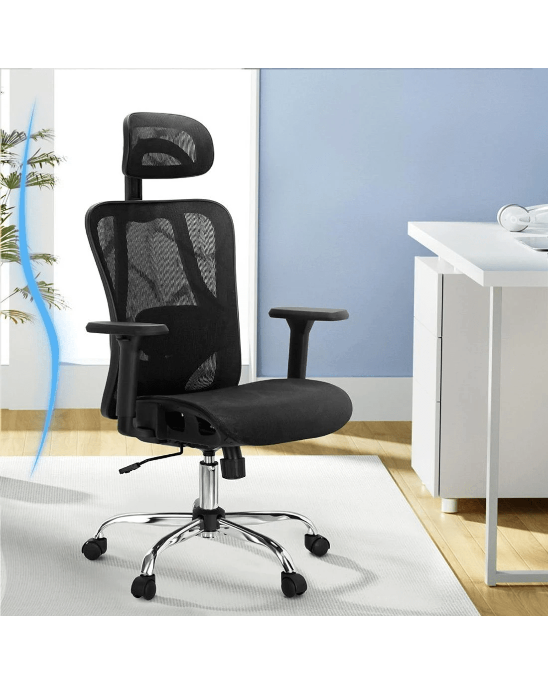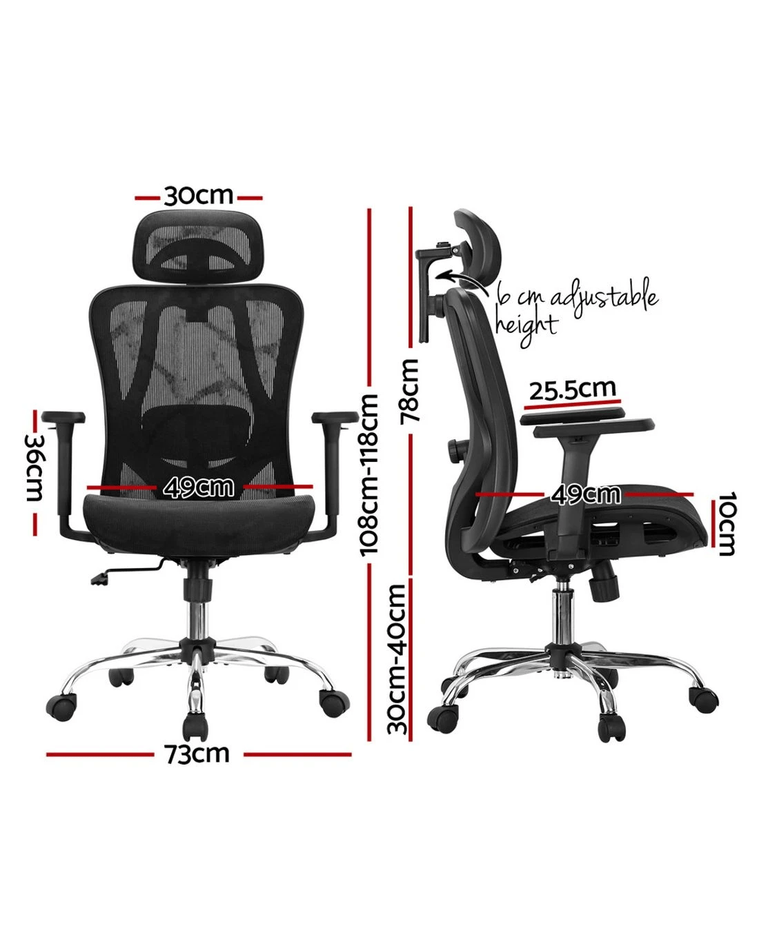 Long days in the office can be hard on your body. Stay comfortable and improve your posture with the Artiss Ergonomic High Back Chair. Designed to provide optimal comfort and support throughout your workday, our chair is the perfect addition to any office environment. The high back supports your spine and encourages good posture while you relax. The mesh material is incredibly breathable, keeping you cool and comfortable throughout the day. With an adjustable headrest and 3D multi-function PP armrests, you can customize the chair to fit your specific needs. The 10cm height adjustment ensures that you can find the perfect seating position, while the tilt tension allows for smooth reclining from 90 to 135 degrees. The chair is also 360 degrees rotatable, allowing for easy movement and access to different areas of your workspace. The chrome base adds a sleek and modern touch, while the black PU castors provide smooth and quiet mobility. Experience comfort, style, and functionality with the versatile Artiss Ergonomic High Back Chair.