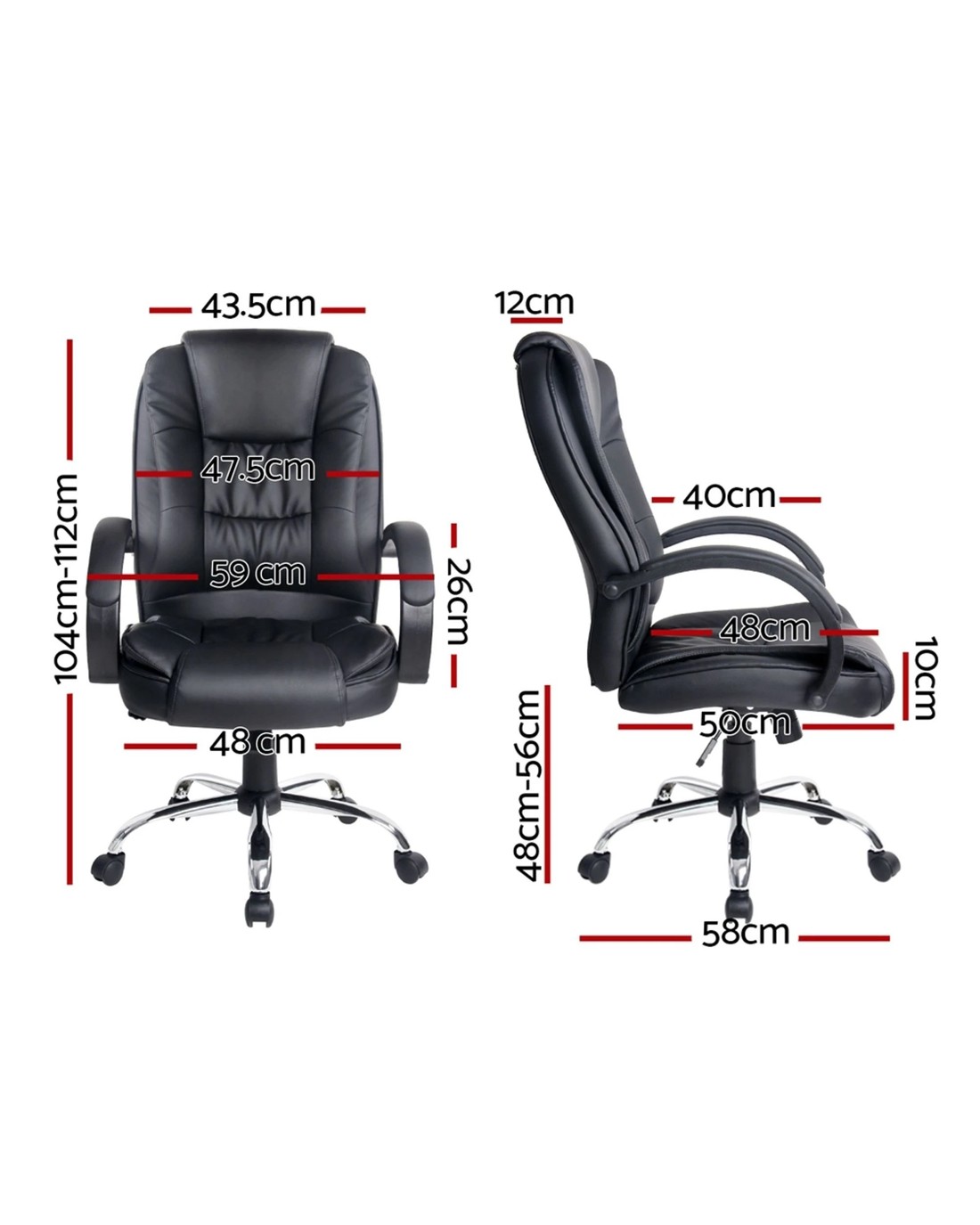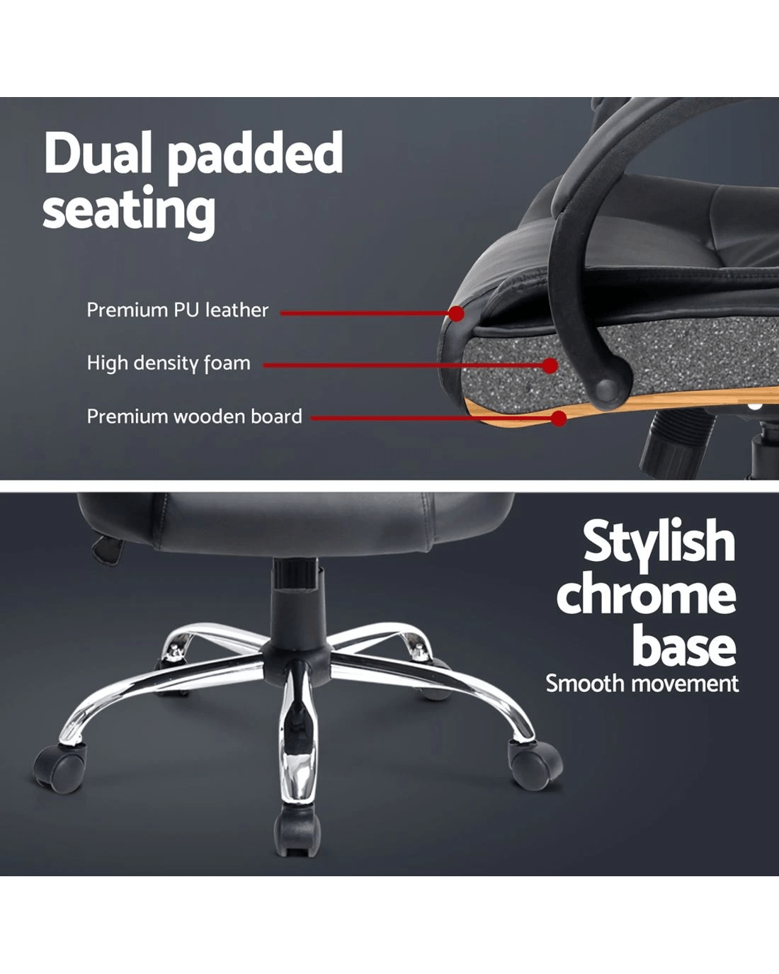 An all-time favourite, the Artiss Rainier Office Chair will bring a touch of contemporary living to your home or office. Made with premium PU leather, the chair has a high-back design, multi-layer padded seating and a comfortable padded headrest and armrests, delivering absolute five-star luxury to your workspace. It features a chrome base with easy height adjustment and tilt function, as well as 360° swivel and five smooth castors. Easy to assemble and maintain, it's even easy to clean – just use a fresh, damp cloth and your chair will look as good as new. An elite in quality and design, the Rainier Office Chair is your solution to true comfort.