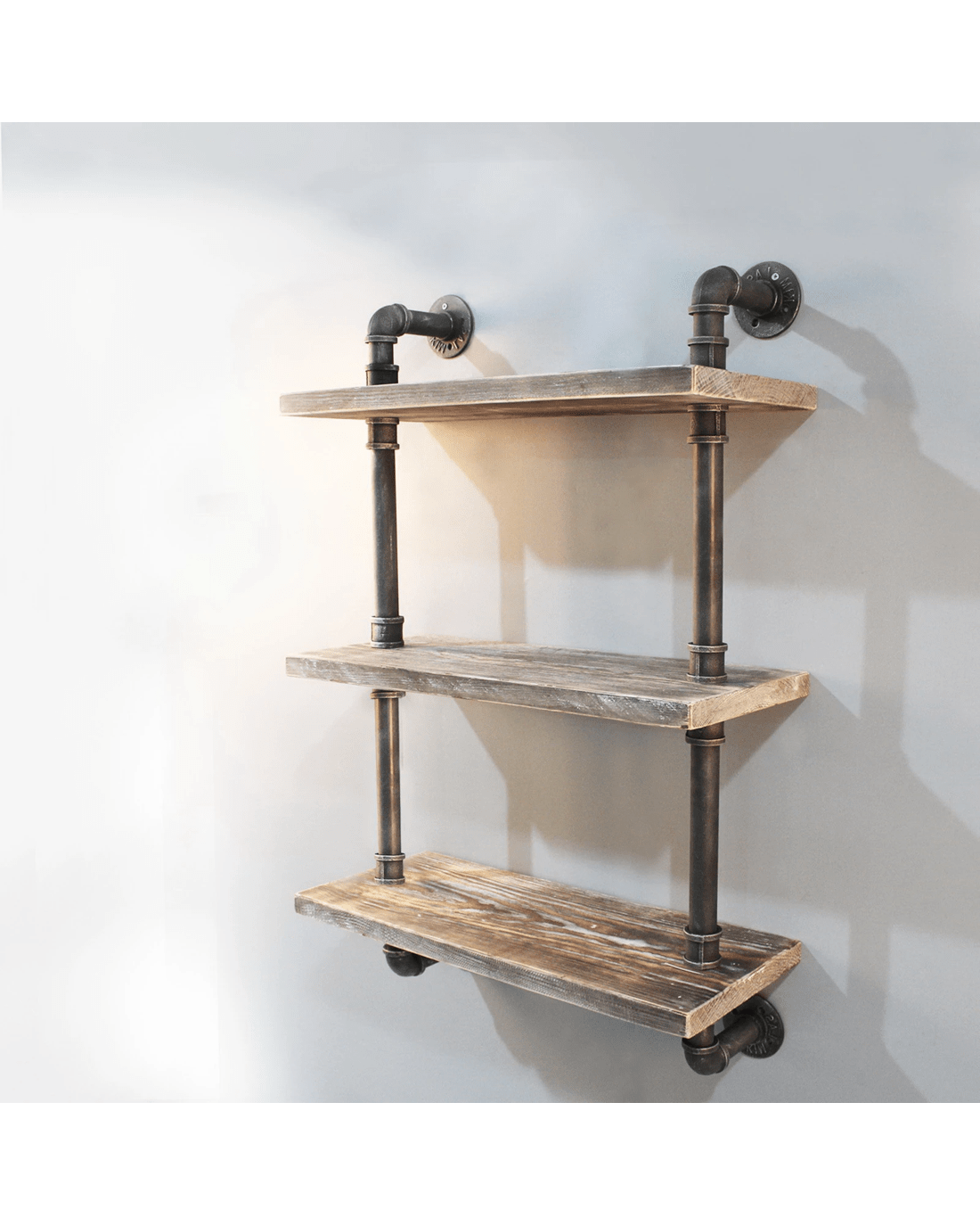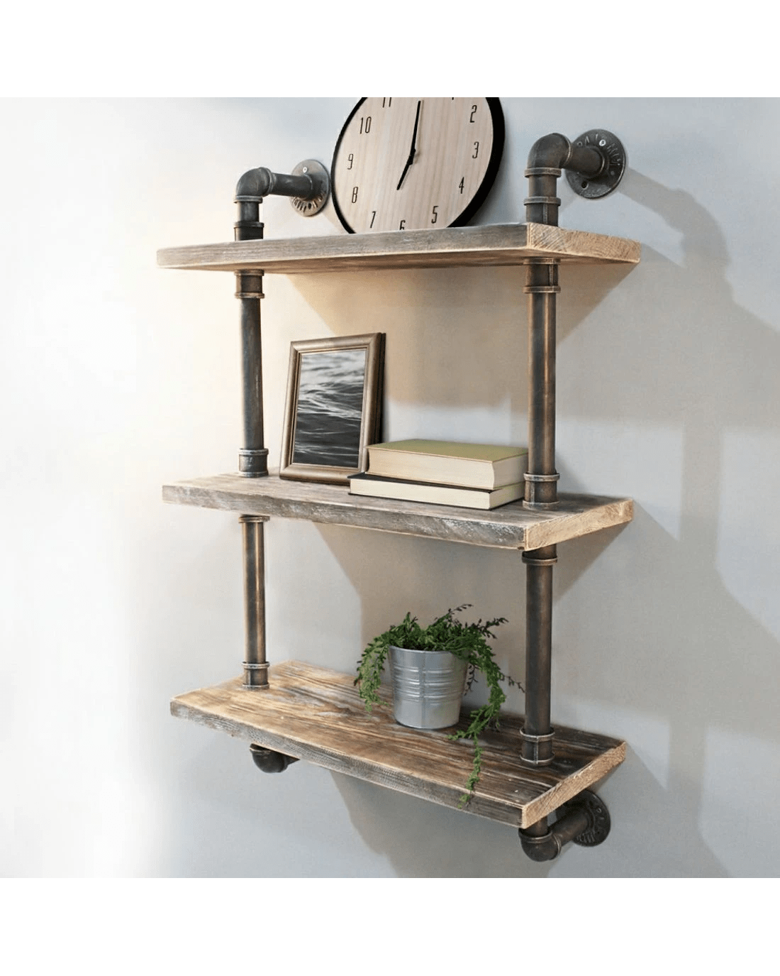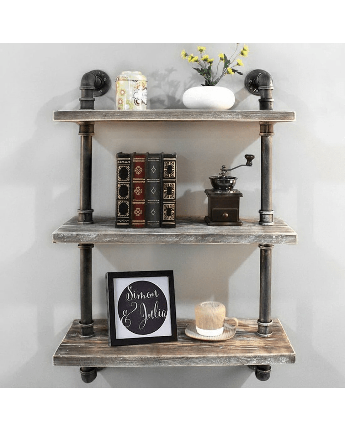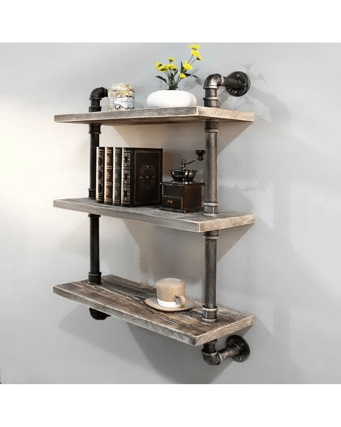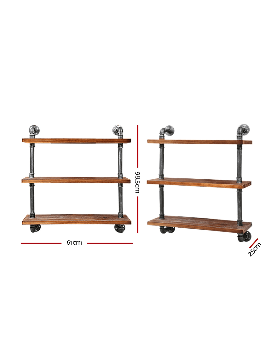 Featuring a rustic industrial 3 level pipe shelf that is perfect for home, office and café interior. Made from quality metal pipe and solid timber, the pipe shelf is one of a kind design. It is suitable for both indoor and outdoor applications.