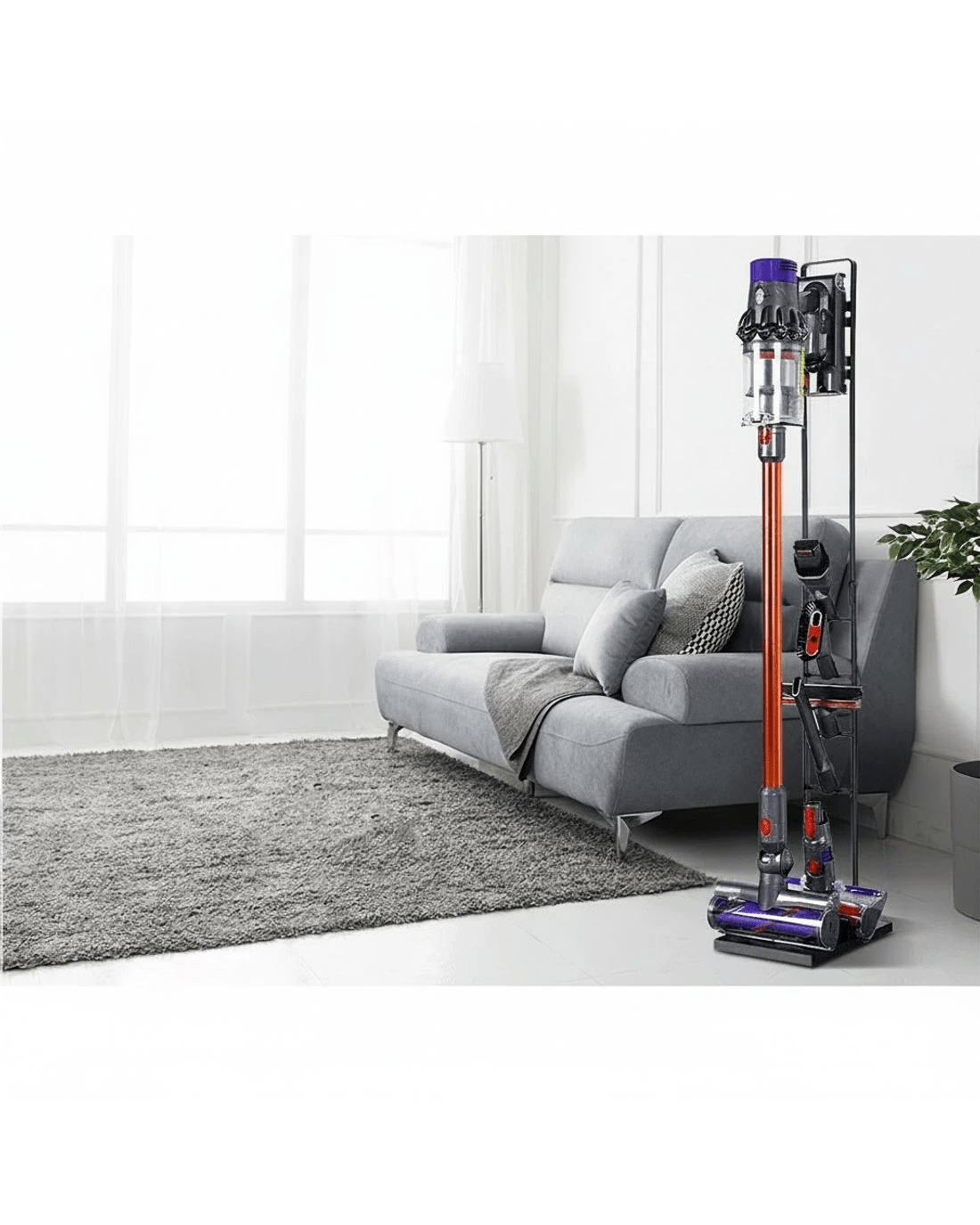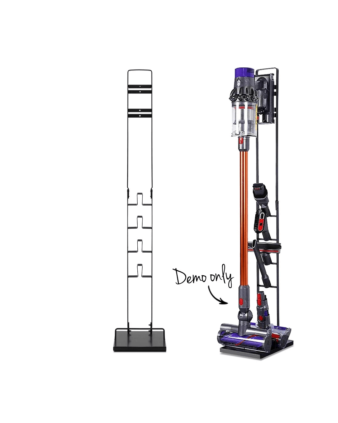 Keep your pristine walls free of holes with our Dyson-compatible Handstick Vacuum Stand. The stand is freestanding meaning there is absolutely no drilling of walls required and allows for portability so that it is no longer tied to one location and can easily move the stand from room to room or house to house. With its compact and space-saving design, the stand can fit perfectly into all the tight nooks and crannies. And you will no longer have to stop in the middle of cleaning to go searching through your whole house for vacuum attachments, because the stand has convenient storage for all your attachments to prevent them from getting lost or cluttering up your house. Our stand is compatible with Dyson and other handstick vacuum cleaners up to 11cm in width and you can rest assured that your expensive Dyson is in safe hands. Other stands can be unstable and flimsy due to poor quality material and loose fixings. Our stand on the other hand is made to stand up to robust use with its strong anti-corrosive metal frame, reliable fixings and stable base. Assembly is easy and all the required parts come included.