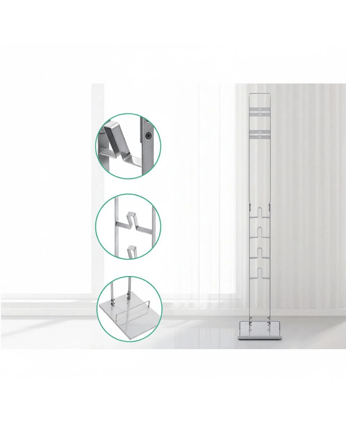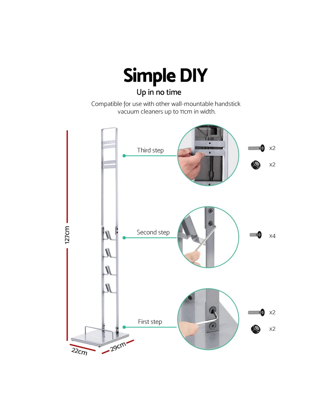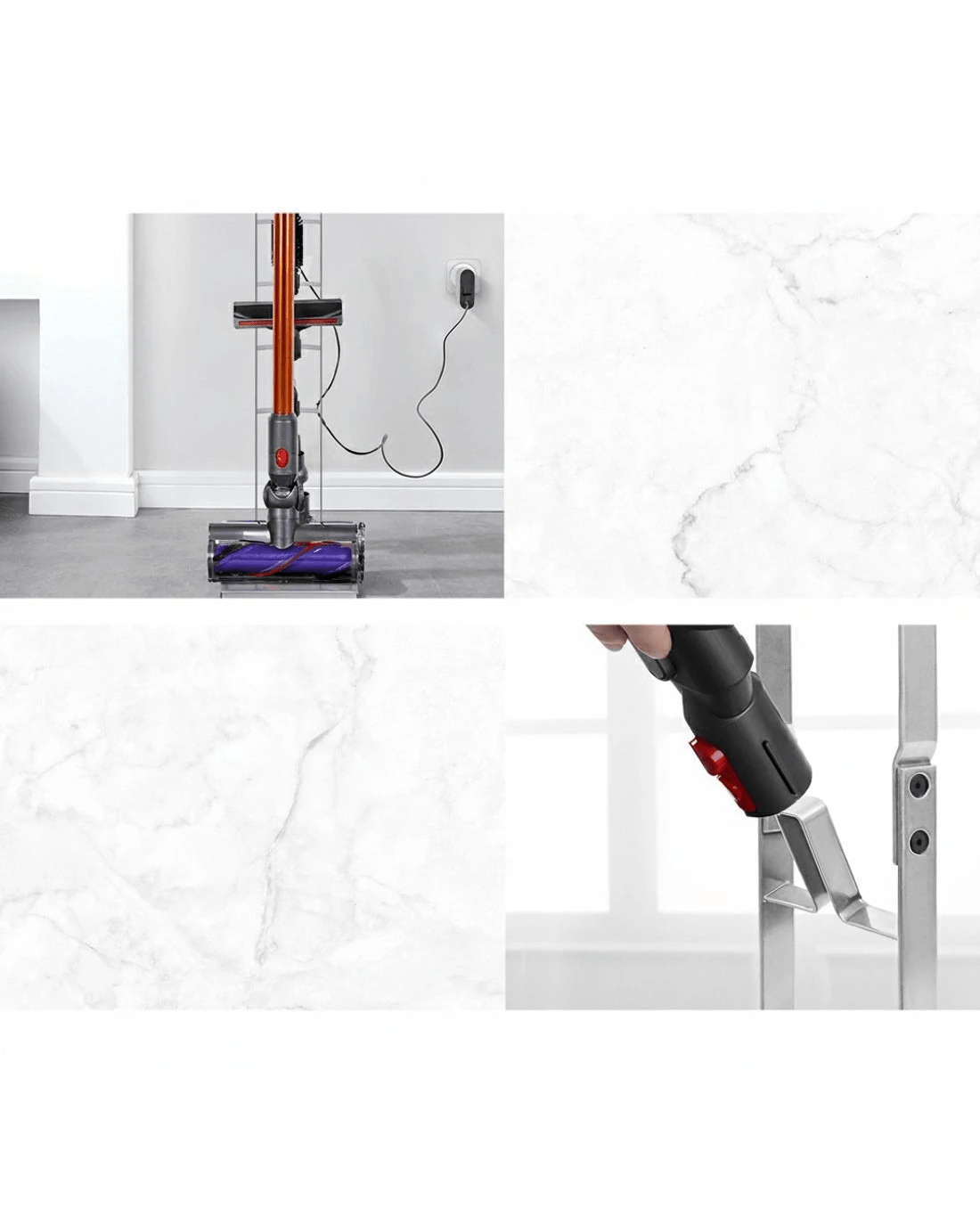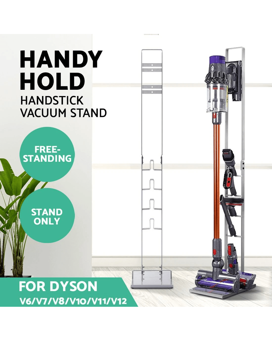 Keep your pristine walls free of holes with our Dyson-compatible Handstick Vacuum Stand. The stand is freestanding meaning there is absolutely no drilling of walls required and allows for portability so that it is no longer tied to one location and can easily move the stand from room to room or house to house. With its compact and space-saving design, the stand can fit perfectly into all the tight nooks and crannies. And you will no longer have to stop in the middle of cleaning to go searching through your whole house for vacuum attachments, because the stand has convenient storage for all your attachments to prevent them from getting lost or cluttering up your house. Our stand is compatible with Dyson and other handstick vacuum cleaners up to 11cm in width and you can rest assured that your expensive Dyson is in safe hands. Other stands can be unstable and flimsy due to poor quality material and loose fixings. Our stand on the other hand is made to stand up to robust use with its strong anti-corrosive metal frame, reliable fixings and stable base. Assembly is easy and all the required parts come included.