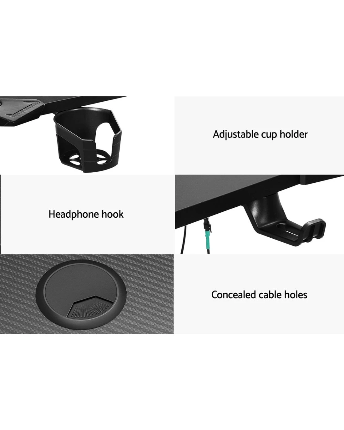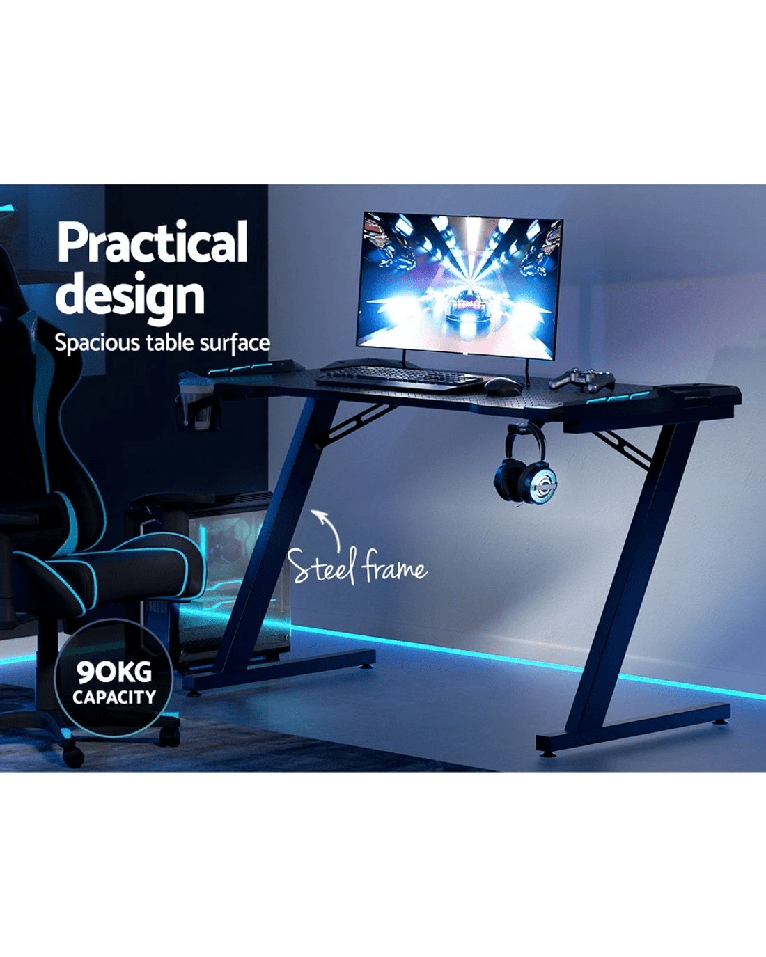 Setup your home gaming station with Artiss gaming desk. Designed for avid gamers, this gaming table is both stylish and practical. The gaming table is equipped with RGB light effects. It comes in seven different colours, which you can adjust according to your preference. You can even adjust its brightness. It'll enhance your gaming experience. To make your gaming experience more convenient, this gaming table has spacious and sturdy surface, which means you have enough room to keep your gaming PC, monitor, keyboard, mouse, and other essentials. For ultimate durability and sturdiness, the gaming table features powder-coated solid steel frame with P2 PB melamine table material and 18mm thickness. It has 90kg weight holding capacity. Furthermore, the table features sleek, z-shaped legs, which ensures ultimate stability and prevents shaking. It also has adjustable foot pad for better support. For ease of use and additional convenience, this gaming table boasts carbon fibre texture that makes it waterproof, non-slip, and easy to clean. It also has an adjustable cup holder, headphone hook, and built-in cable management system and comes with one year warranty. With so much that it has to offer, bring home this gaming table to take your gaming session to the next level.