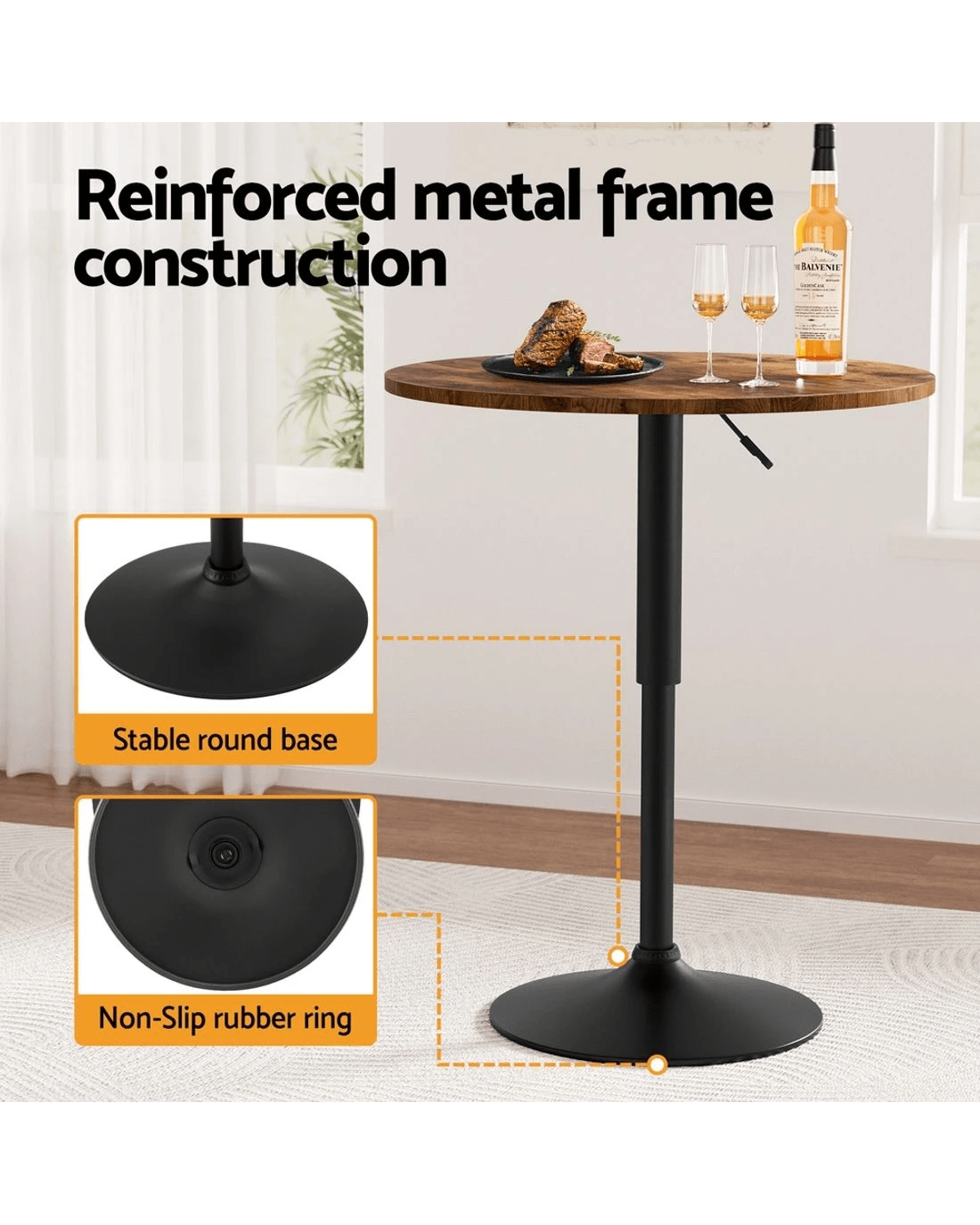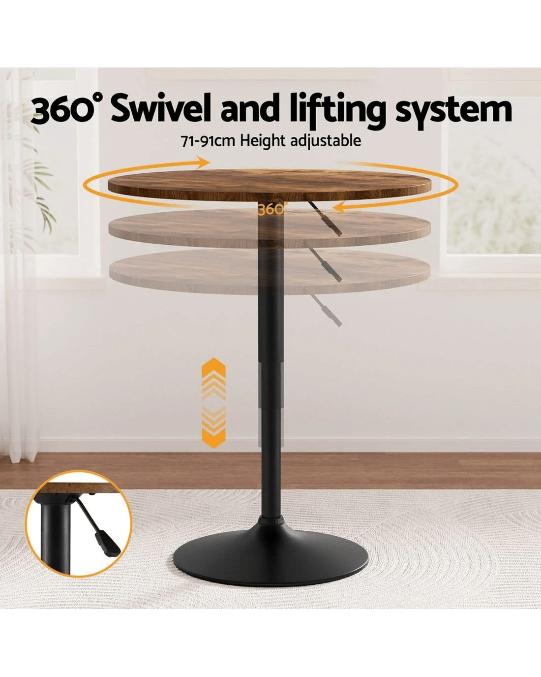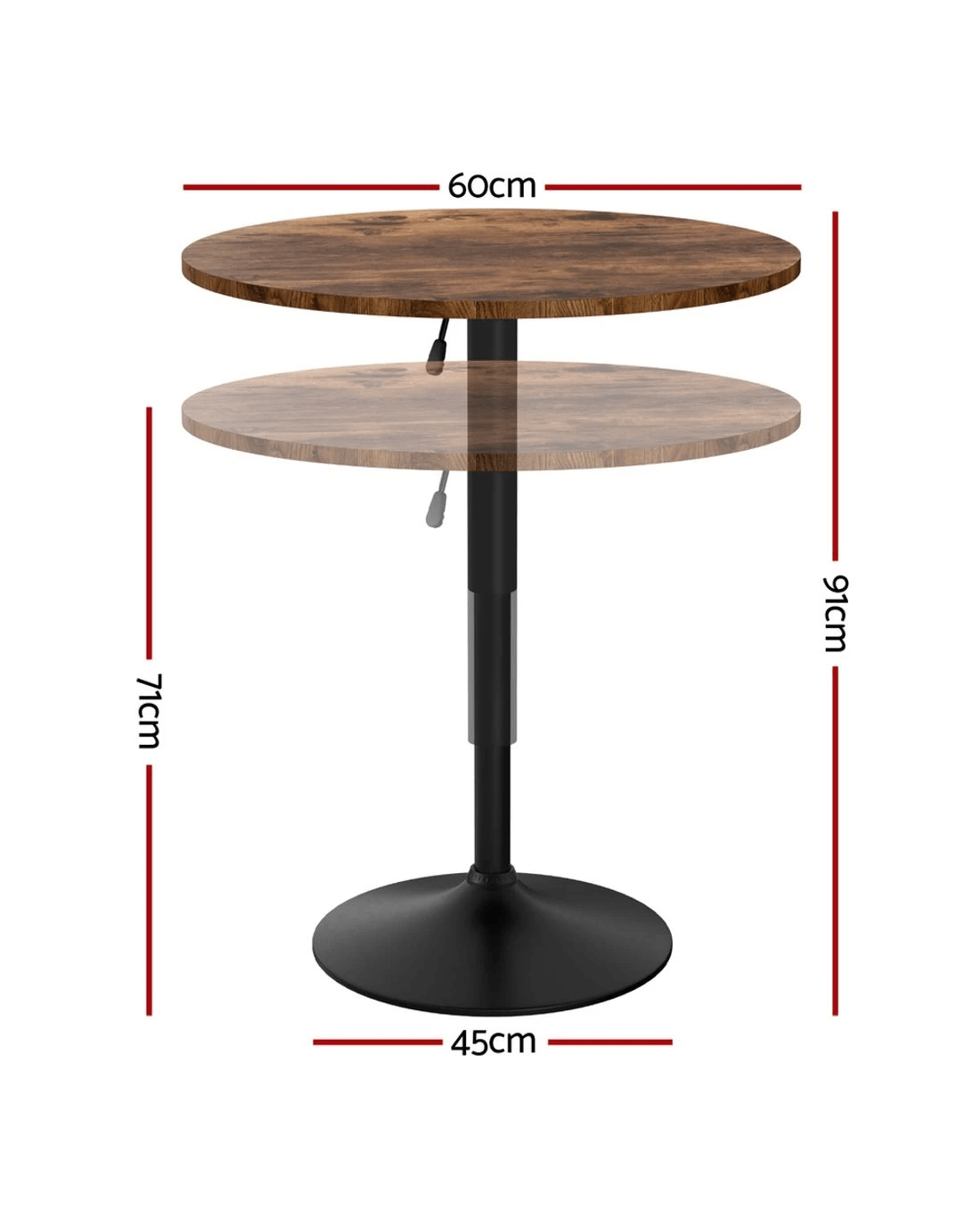 Elevate your space with the Artiss Adjustable Bar Table, combining sleek design and practical functionality. The 360° swivel base and gaslift mechanism allow effortless height adjustments from 71cm to 91cm, perfect for kitchen counters, outdoor patios, or home bars. Crafted with a robust steel frame and scratch-resistant MDF tabletop, this 60cm circular table offers ample room for drinks, decor, or workspace essentials. Its non-slip rubber ring and weighted 45cm base ensure stability on uneven surfaces. The rustic brown and black finish adds contemporary charm to any setting. Simple assembly and weather-resistant materials make it ideal for both indoor and outdoor use.