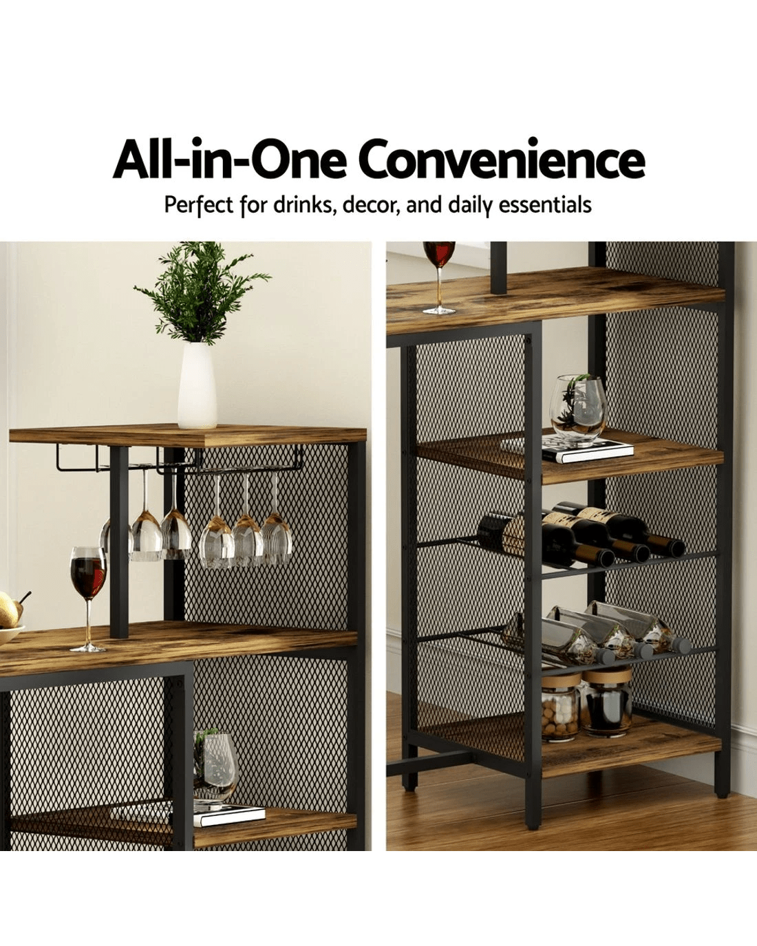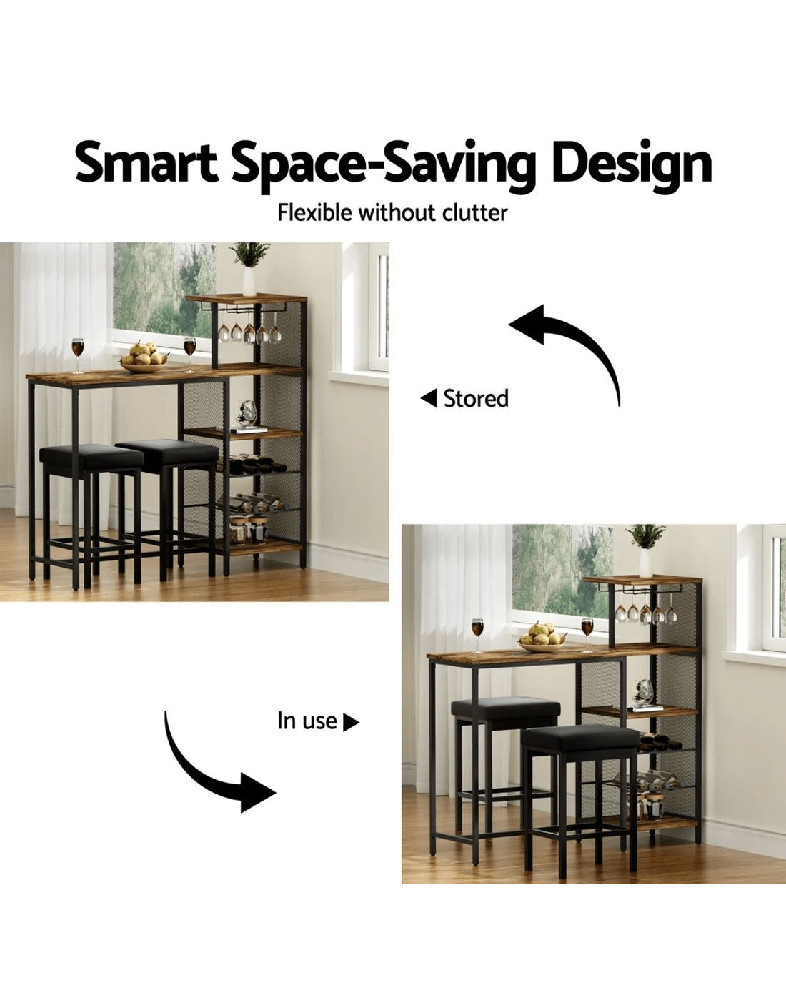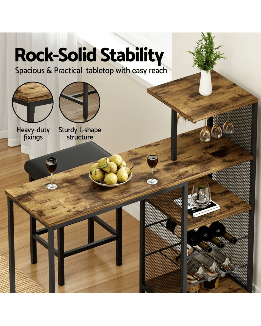 Elevate your entertainment space with the Artiss Industrial Bar Table, combining rugged metal pipe design with functional storage. The sturdy steel frame supports a spacious walnut-finish MDF tabletop, perfect for serving drinks or displaying decor. Keep essentials within reach using the built-in dual cup holders and 6-bottle wine rack. Its multi-level layout organises glassware, bottles, and bar tools neatly while saving floor space. Effortless tool-free assembly fits seamlessly into compact apartments, patios, or man caves. Durable materials withstand daily use, blending industrial charm with practical storage.