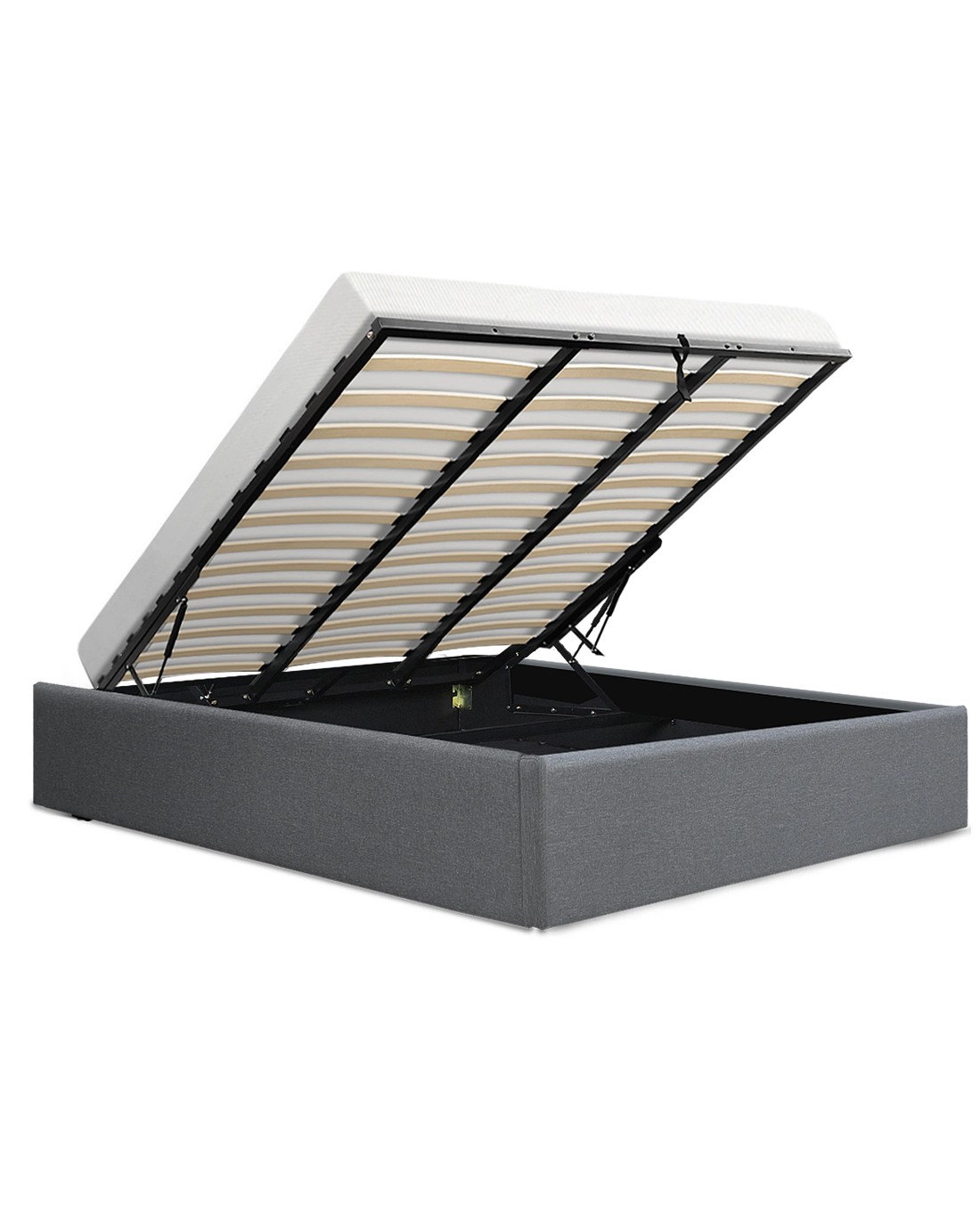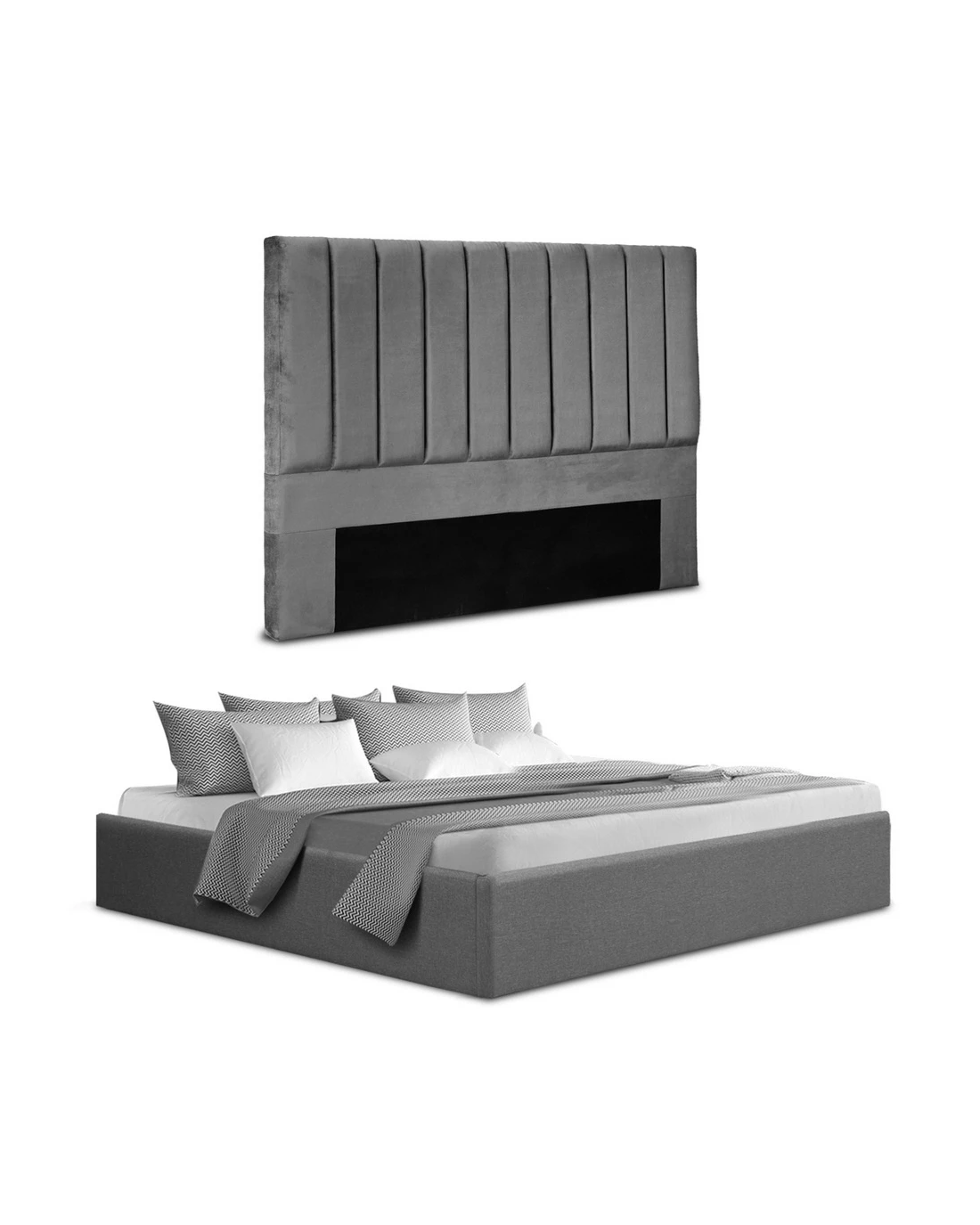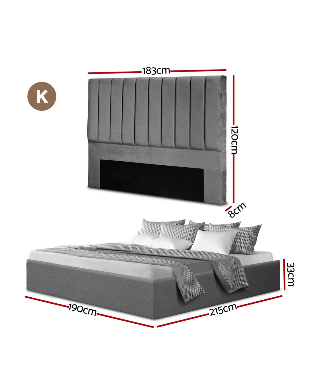 This Artiss King Bed Frame combines a gas lift storage base and velvet headboard. The base features faux linen upholstery, high-density foam padding, and reinforced wood construction with 300kg capacity. The art deco inspired headboard includes soft velvet fabric, foam padding, and breathable backing. Fits standard king mattresses (203x153cm). Easy assembly required. Grey finish complements modern bedrooms.
