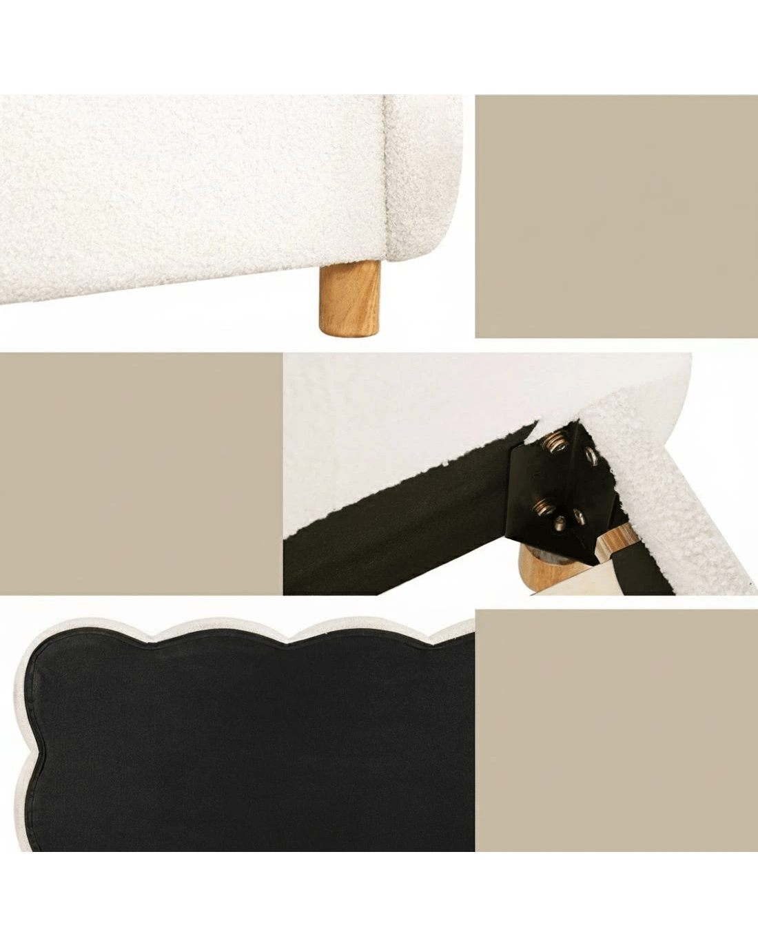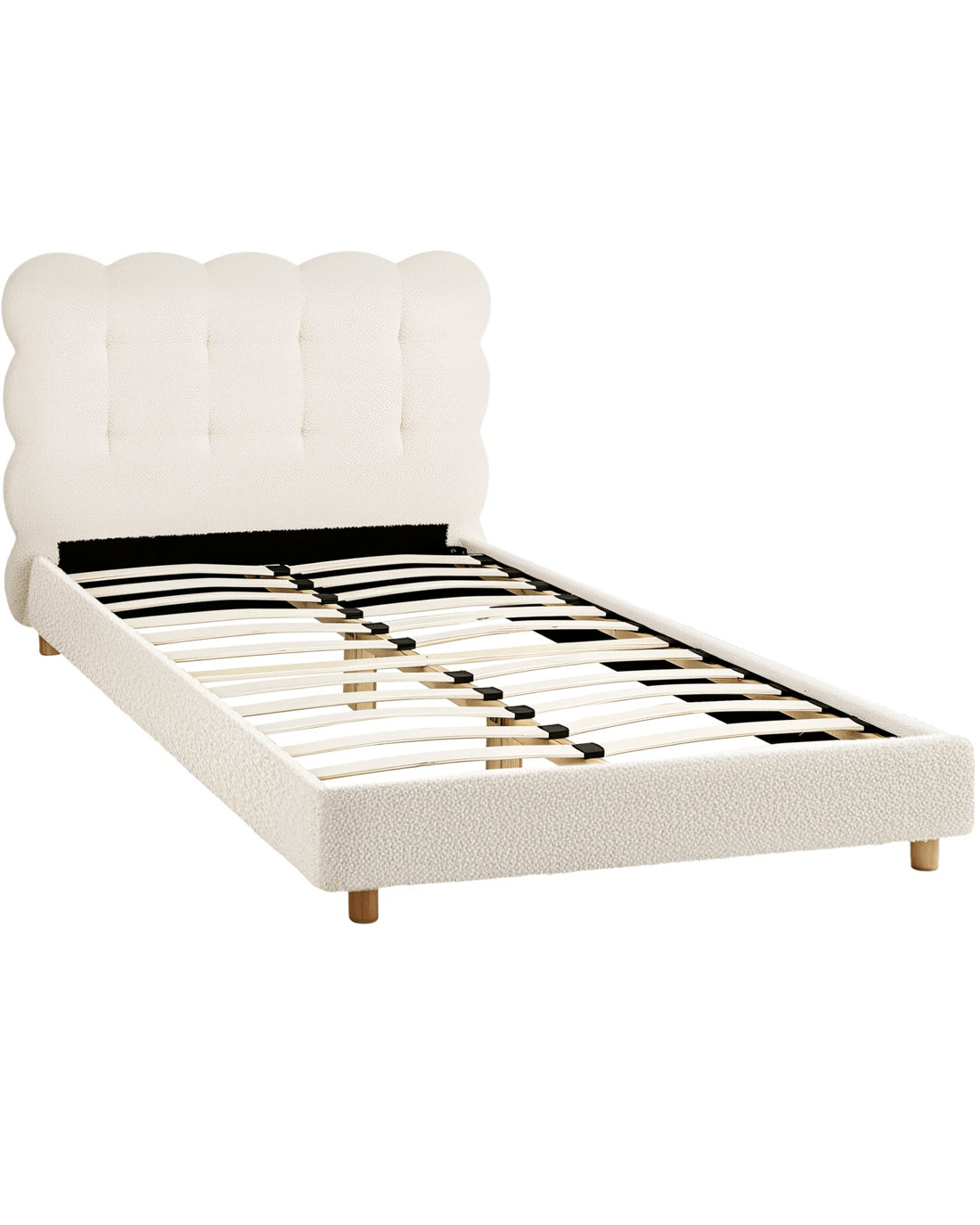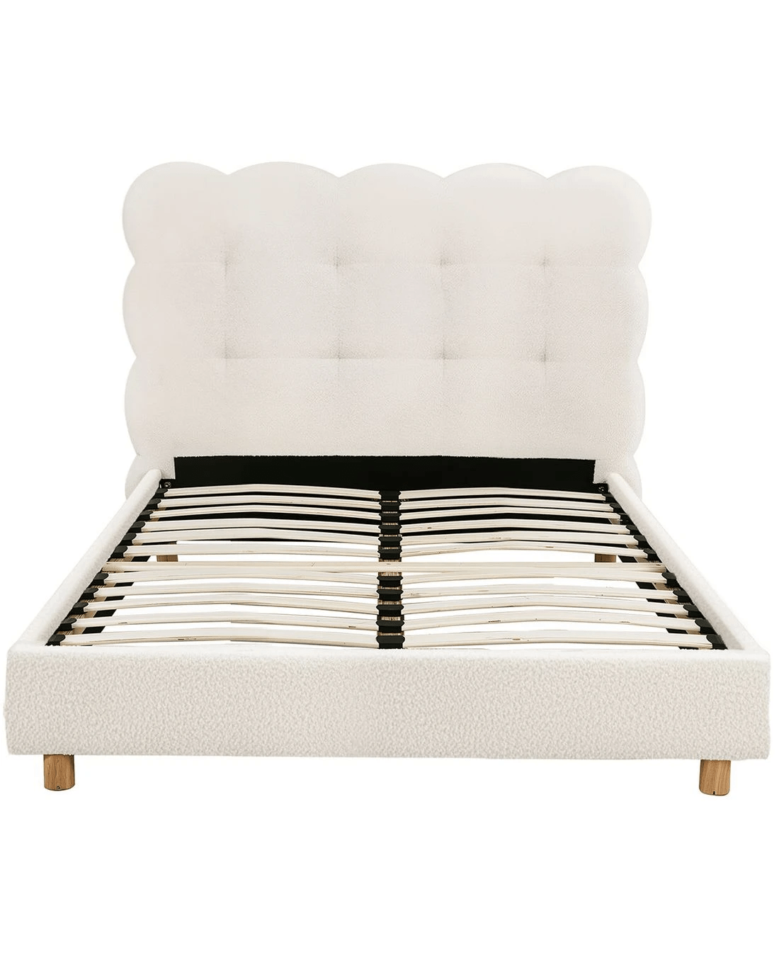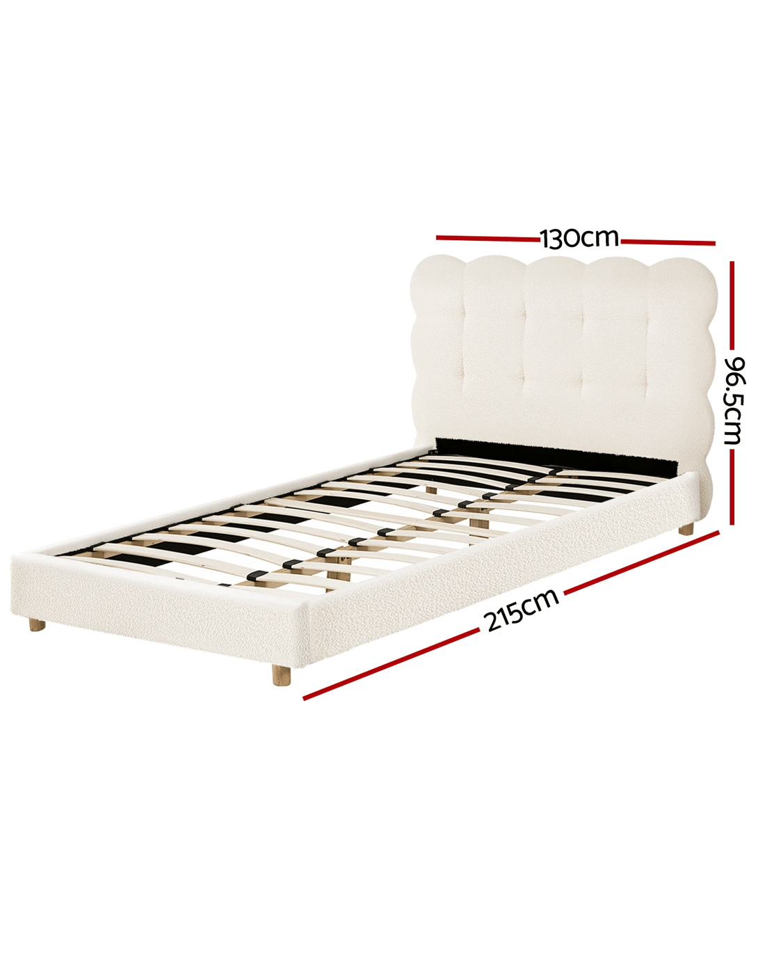 Artiss cloud headboard bed frame in white. Features boucle fabric upholstery and durable wood and metal construction. This platform base fits king single mattresses. Includes wooden slats and metal legs for strength. Easy to assemble. Supports up to 300KG. Note: Actual colour may vary.