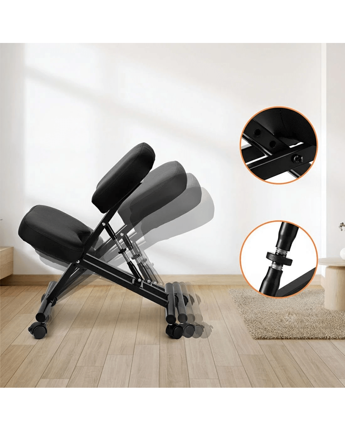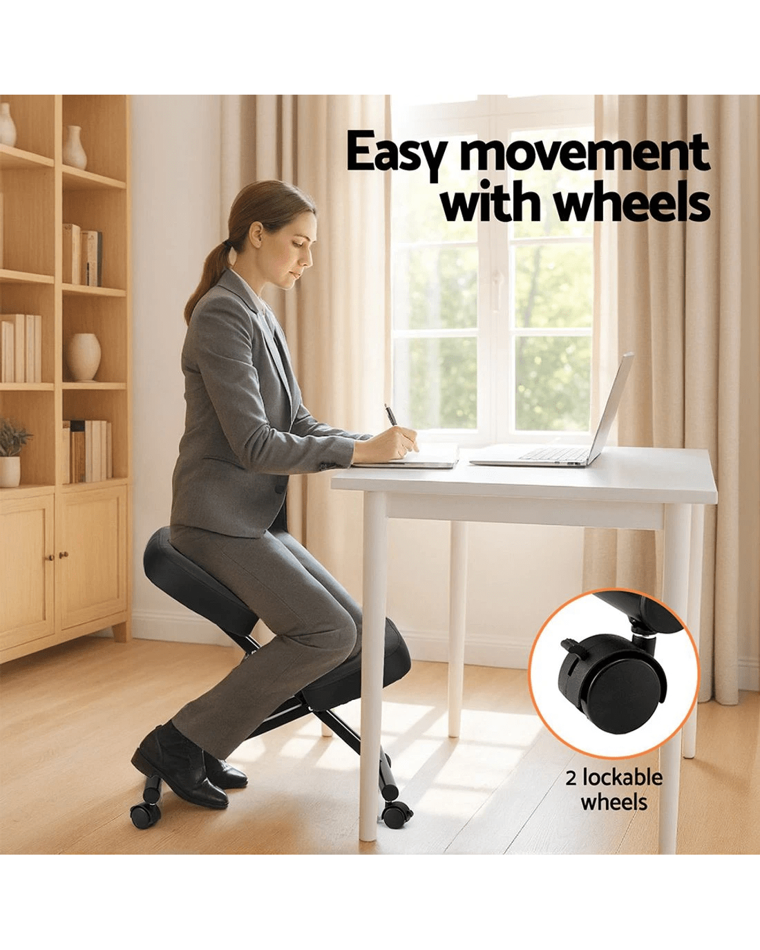 Move effortlessly with smooth-rolling wheels, while the 2 lockable wheels provide stability when needed. The 6cm high-density foam seat and PU leather knee pad deliver plush support without compromising posture. With simple, tool-free assembly, this sleek black kneeling chair is perfect for home offices or workspaces.