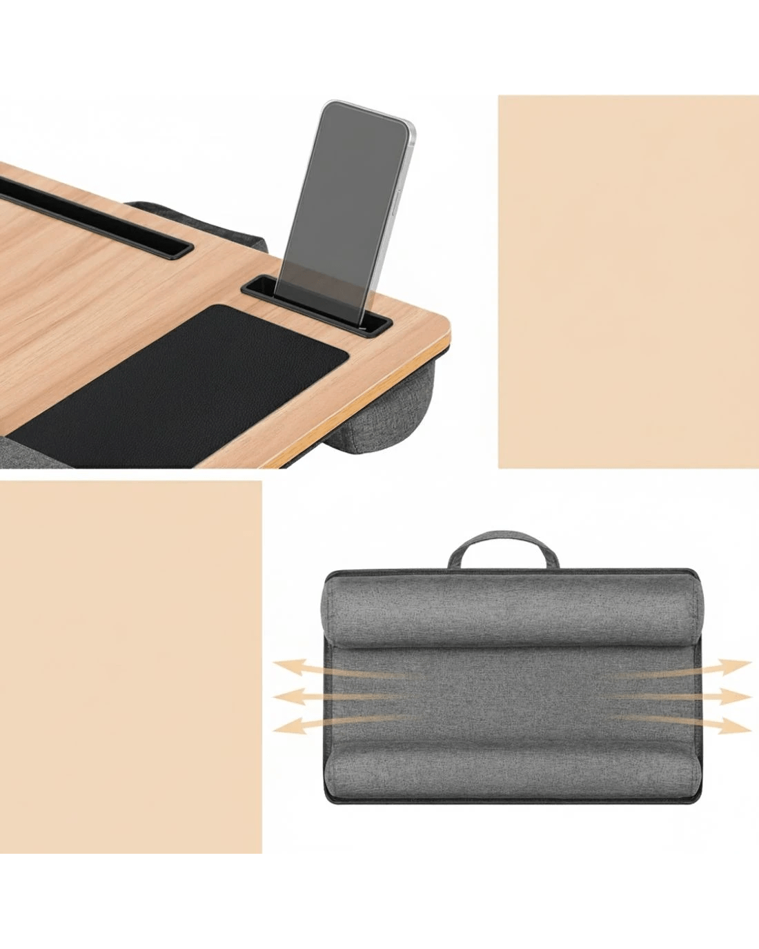 The dual-bolster cushion base offers superior comfort, conforming to your lap while promoting airflow to prevent overheating. Lightweight yet durable, this lap desk is perfect for working from bed, couch, or outdoors – ideal for professionals, students, and casual users alike.