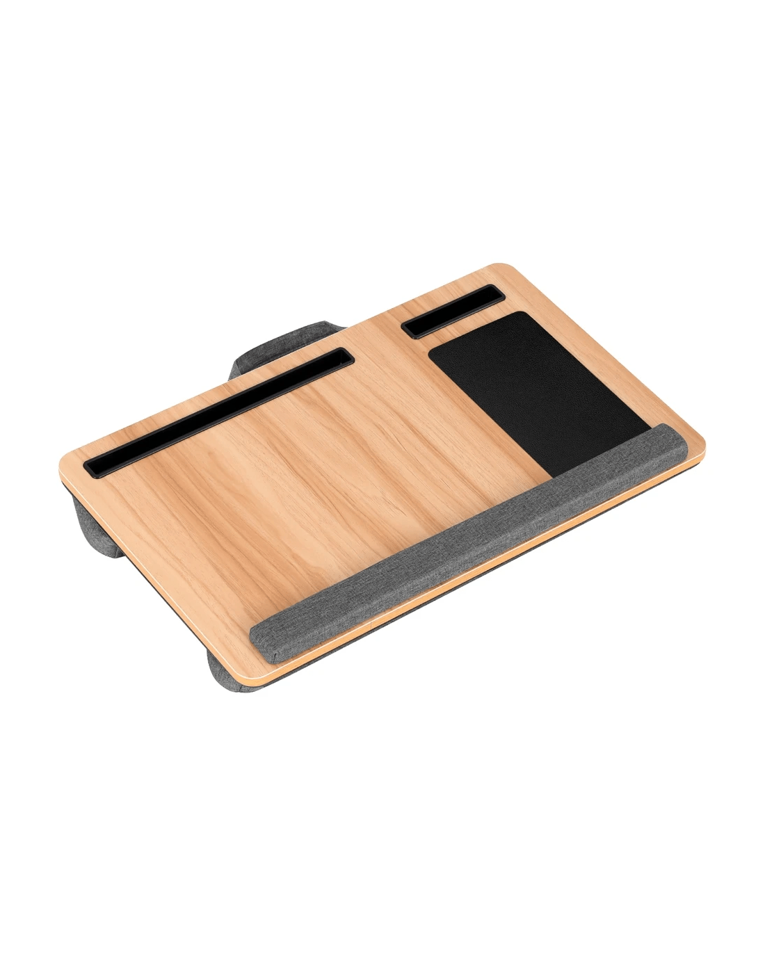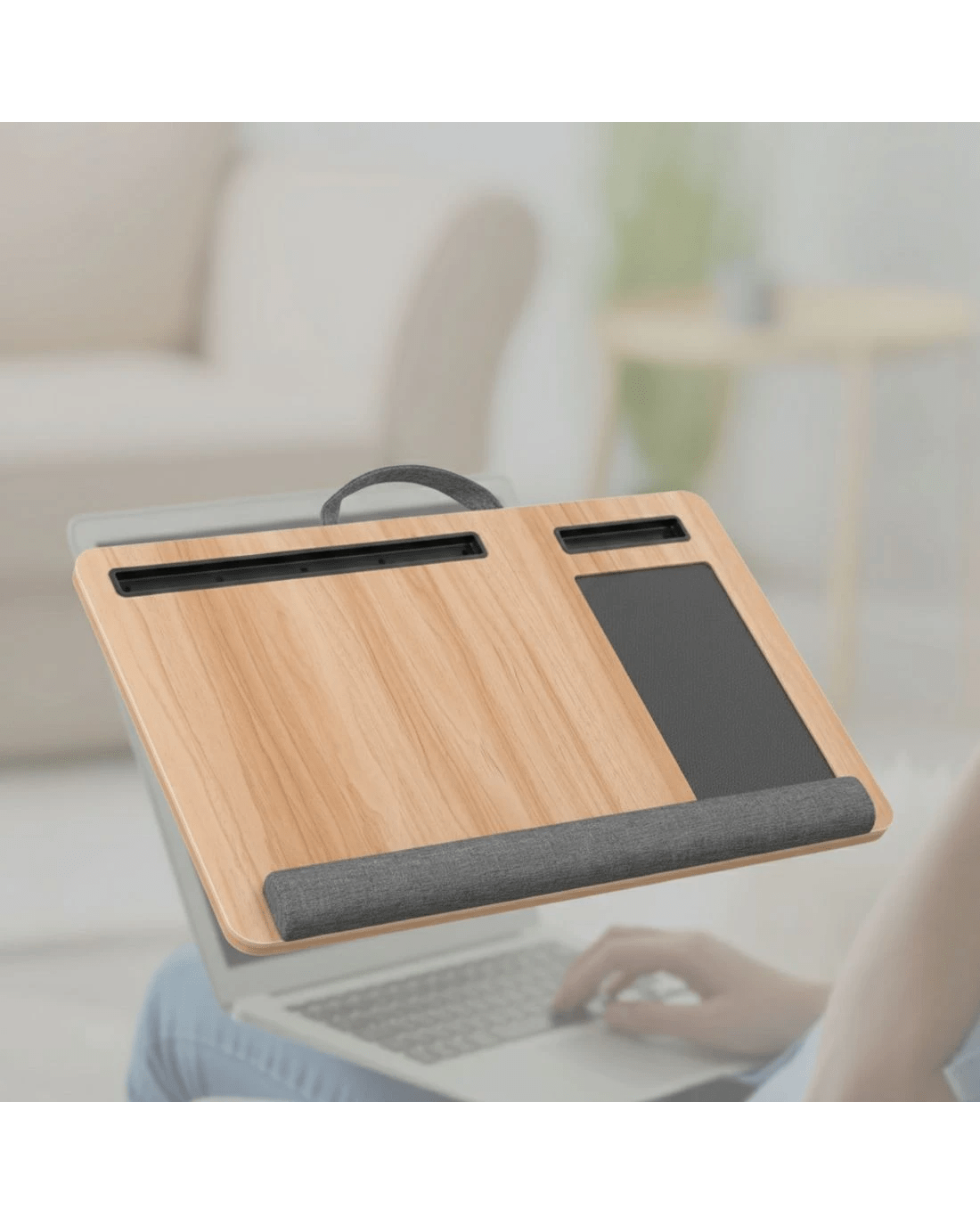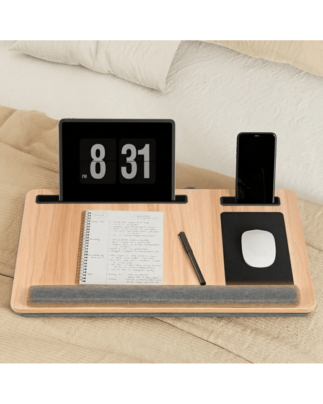 Work or browse in comfort with our versatile lap desk, designed to fit 13.3" to 15.6" laptops. The smooth MDF surface provides a stable platform, while the ergonomic wrist pad reduces strain during extended use. Stay productive with the built-in phone slot and spacious mouse pad, keeping all your essentials within reach.