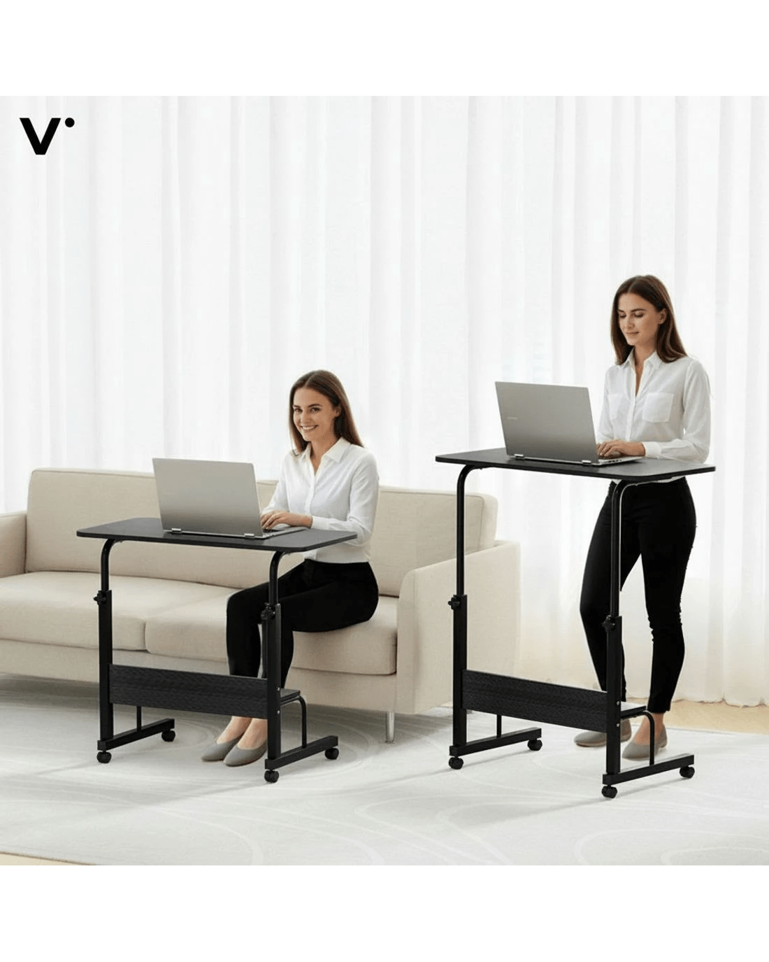 Experience ultimate flexibility with our portable and lightweight mobile laptop desk, designed to adapt to your lifestyle. The sturdy steel frame with U-shape design ensures stability while remaining easy to move. Detachable lockable caster wheels allow smooth mobility and secure placement wherever you need it - perfect for use near beds, couches, or recliners.