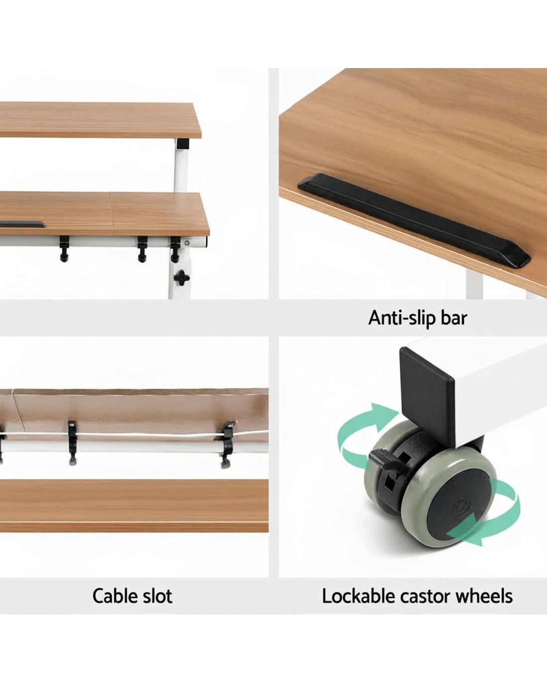 Designed to be strong and lightweight, our Mobile Twin Laptop Desk has two separate desk areas for uncluttered work. The two desk tops can be adjusted in height to suit your layout while one of them can also be tilt adjusted to angle to your preference. A thoughtful anti-slip bar helps keep your keyboard or any peripheral in place.