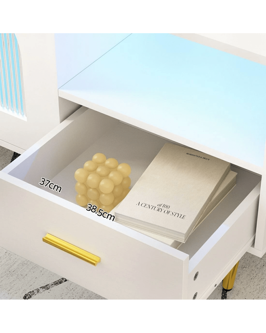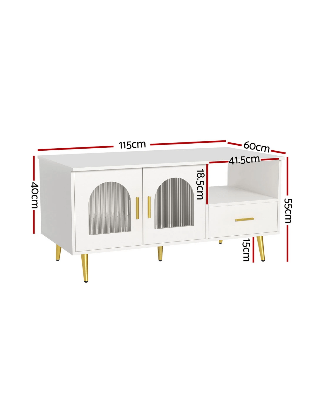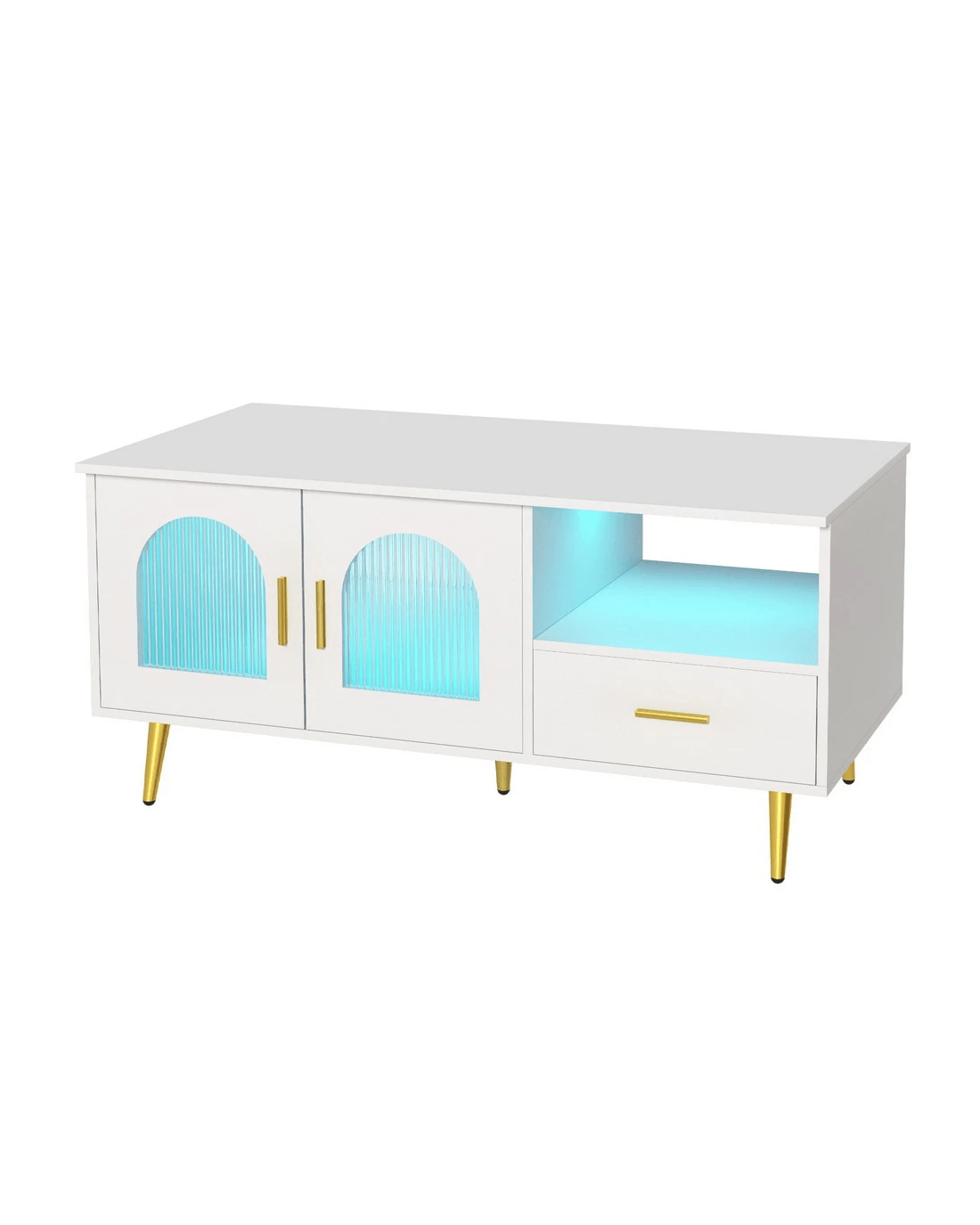 Introducing our contemporary Artiss coffee table with LED strip, USB connectivity, ample storage, sleek metal handles, melamine-coated particle board, reeded acrylic glass door, electroplated metal legs, smooth runners, easy maintenance, and assembly. Modern functionality meets stylish design.