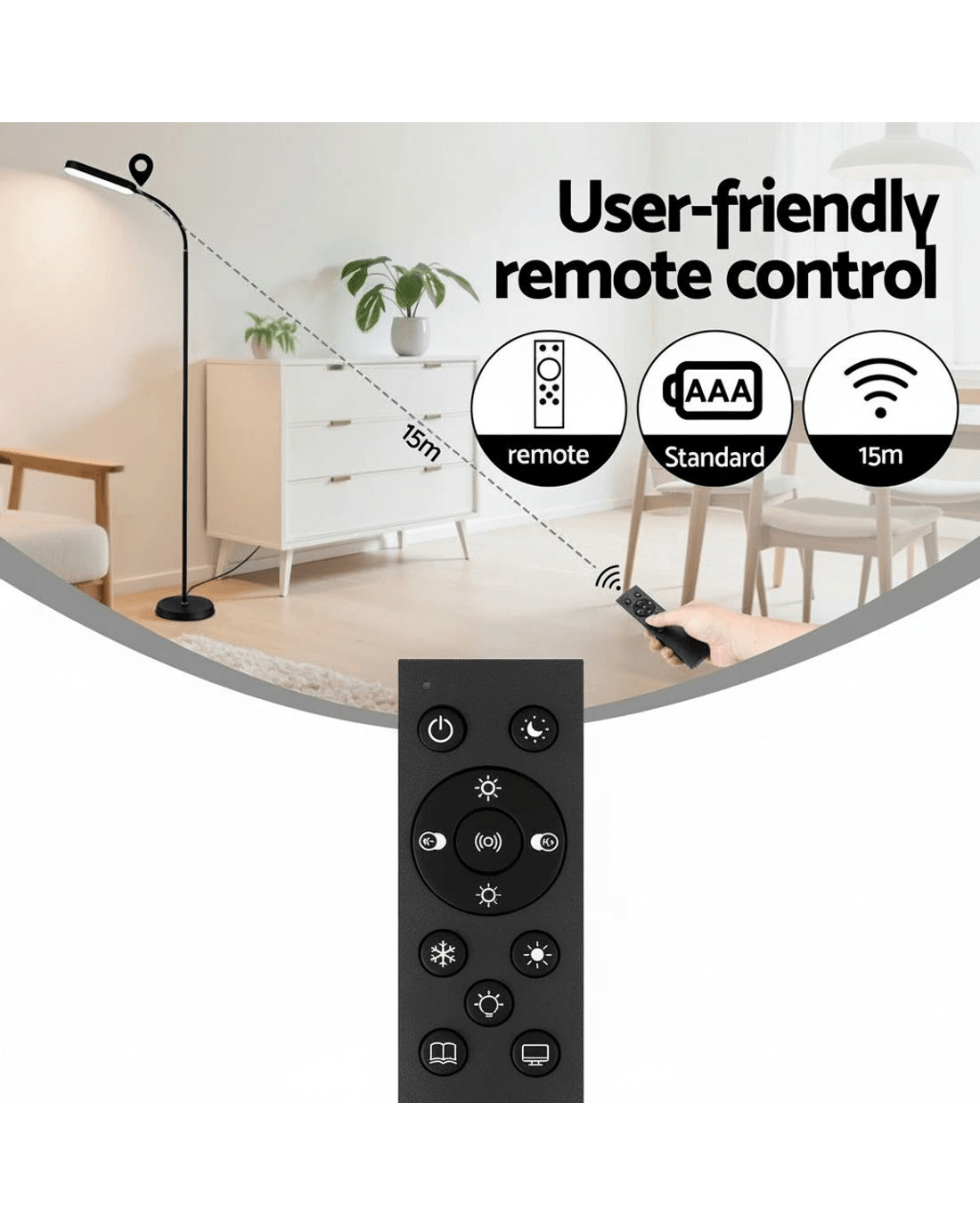 Illuminate your space with the Artiss LED Floor Lamp. This lamp blends a sleek, modern design with powerful functionality, allowing you to create the perfect lighting ambience in any room. Effortlessly customise your light with stepless brightness and multiple colour temperatures to suit any task, whether you're focused on reading, relaxing, or spending time with family. The ultra-flexible 360° gooseneck lets you precisely direct the light exactly where you need it, while the user-friendly remote control offers wireless convenience from up to 15 metres away. Powered by a reliable SAA adaptor, this energy-efficient and eye-caring lamp provides consistent, flicker-free light all day long. A stable base ensures the lamp remains secure, making it the perfect addition to your home office, living room, or bedroom.