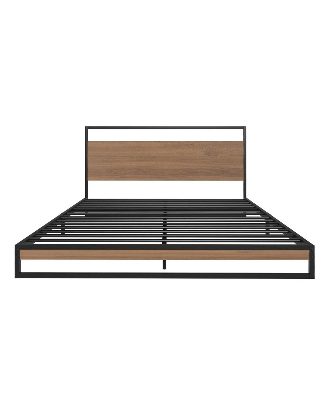 Metal and wood in perfect harmony. Our Dane Bed Frame is truly a stylish addition to any bedroom. Simple in design, the bed frame is meticulously constructed in sturdy steel and 15mm thick MDF with PVC for durability and strength. The sleek black powder-coated steel and dark wood accents lend real industrial cred to your bedroom for some standout décor. Across the frame, evenly spaced slats provide good weight distribution as well as ensuring that the mattress stays in place even with every twist and turn of your sleep. The central support beam further steadies the bed under robust use.