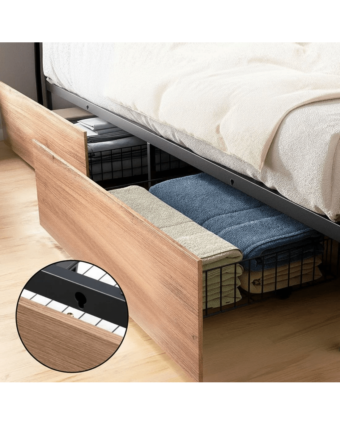 Spacious 4 drawer capacity with anti-slip clips – store kids' toys, winter blankets, or hotel linen securely. Tool-free installation under bed platform.