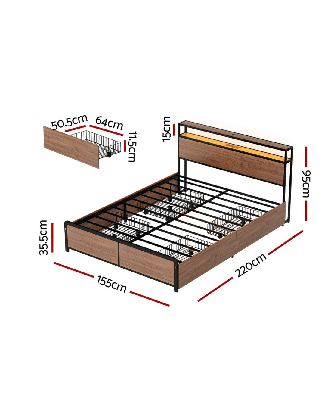 Artiss Metal Bed Frame Queen Size LED Storage Headboard USB Charge 4 Drawers - Black
