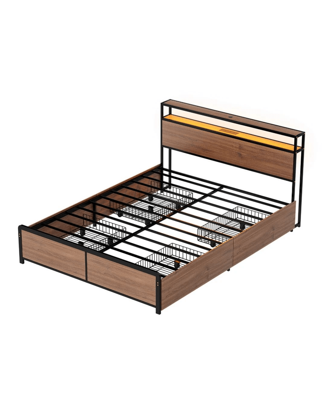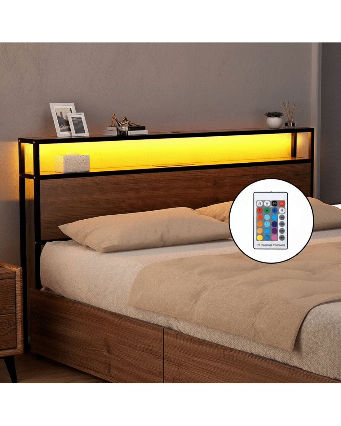 16 colour options for movie nights or relaxing baths. The steel-reinforced slats prevent mattress sagging, while 4 storage drawers keep linen organized.