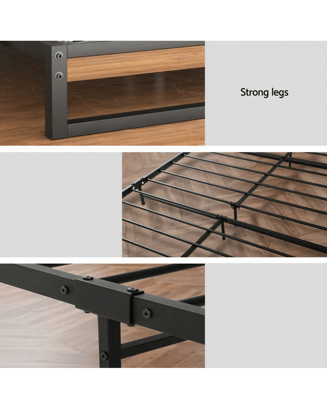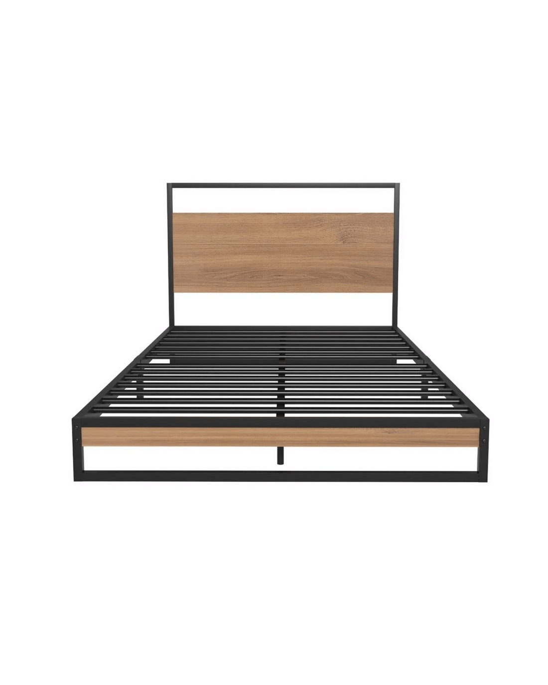Metal and wood in perfect harmony. Our Dane Bed Frame is truly a stylish addition to any bedroom. Simple in design, the bed frame is meticulously constructed in sturdy steel and 15mm thick MDF with PVC for durability and strength. The sleek black powder-coated steel and dark wood accents lend real industrial cred to your bedroom for some standout décor. Across the frame, evenly spaced slats provide good weight distribution as well as ensuring that the mattress stays in place even with every twist and turn of your sleep. The central support beam further steadies the bed under robust use.