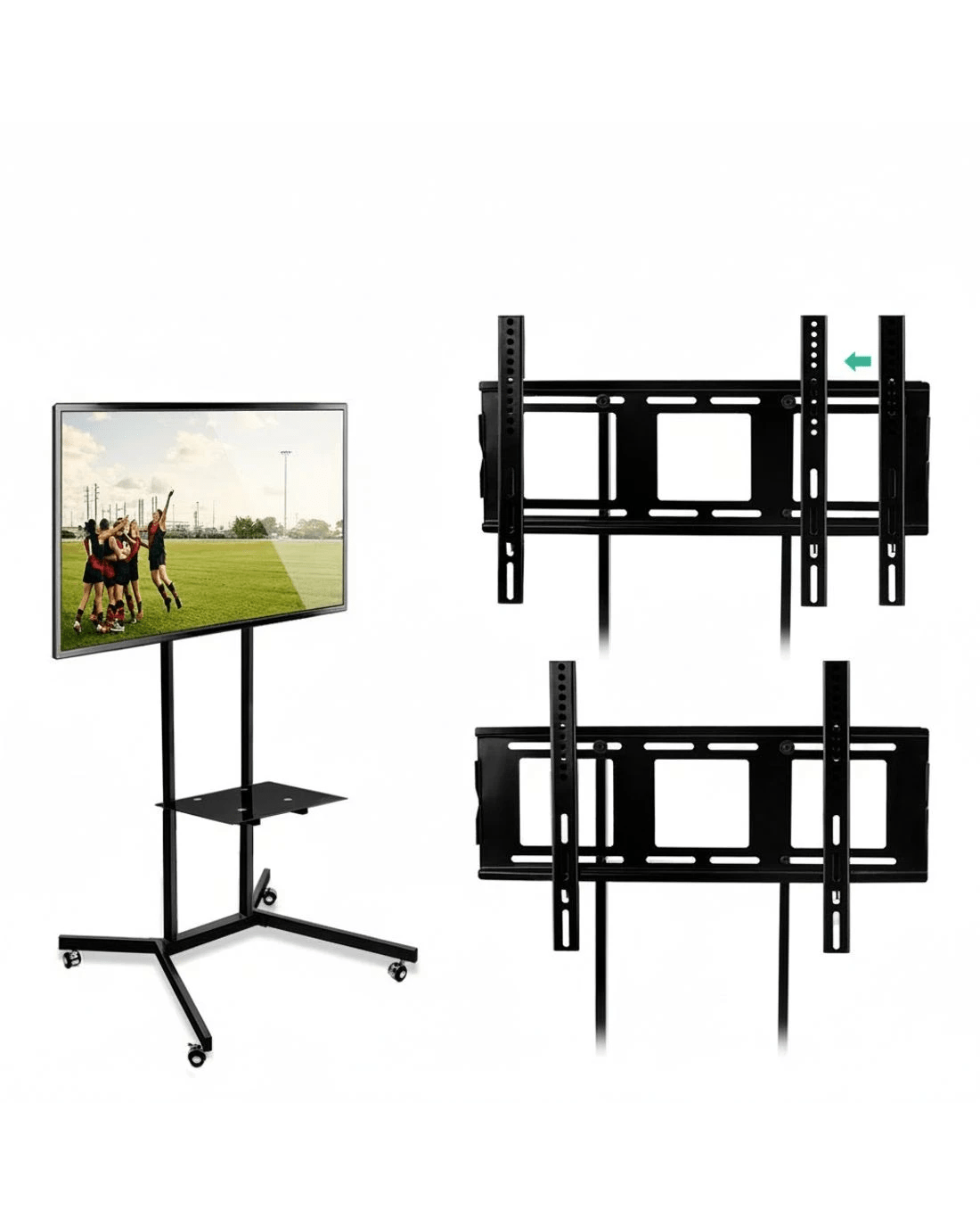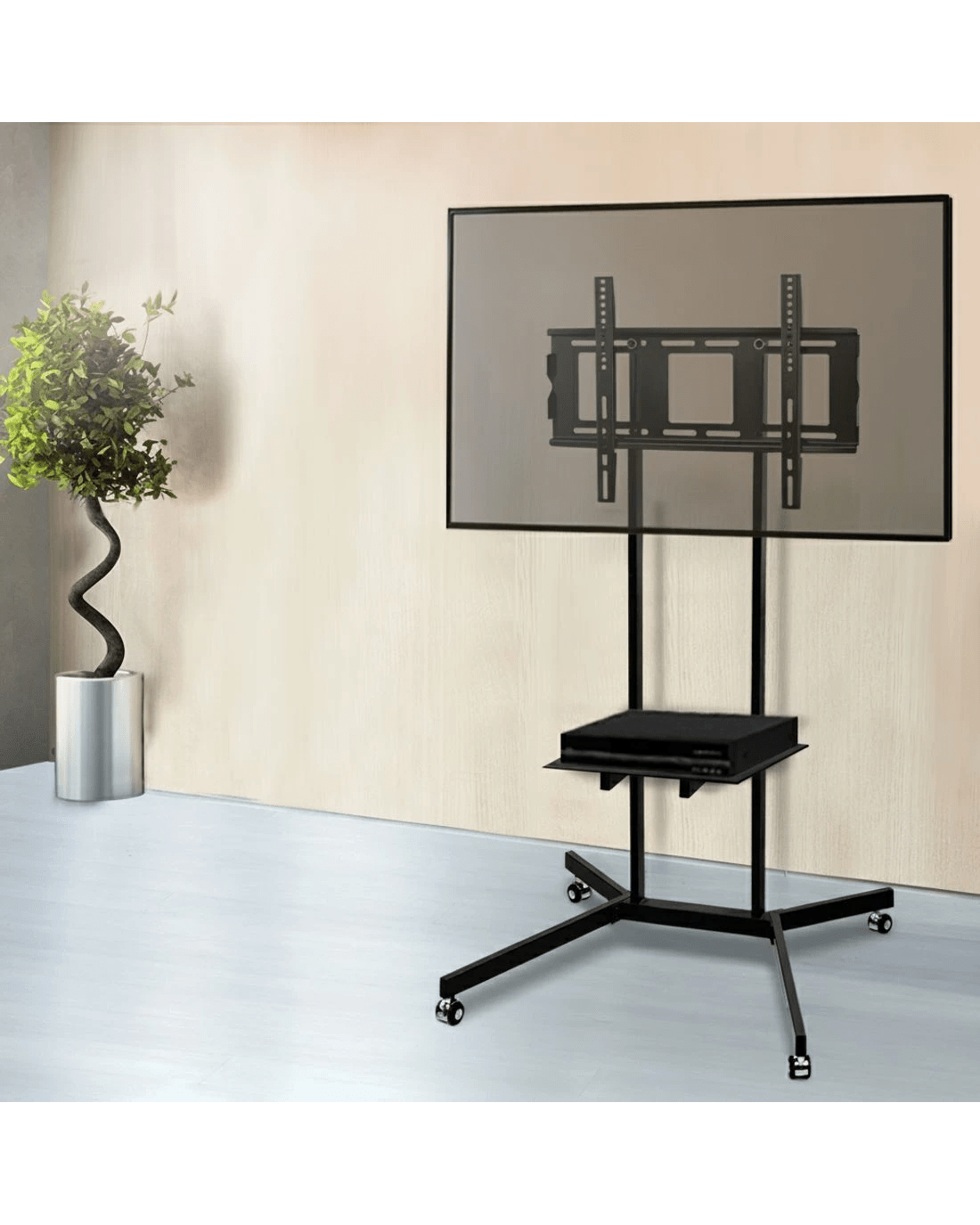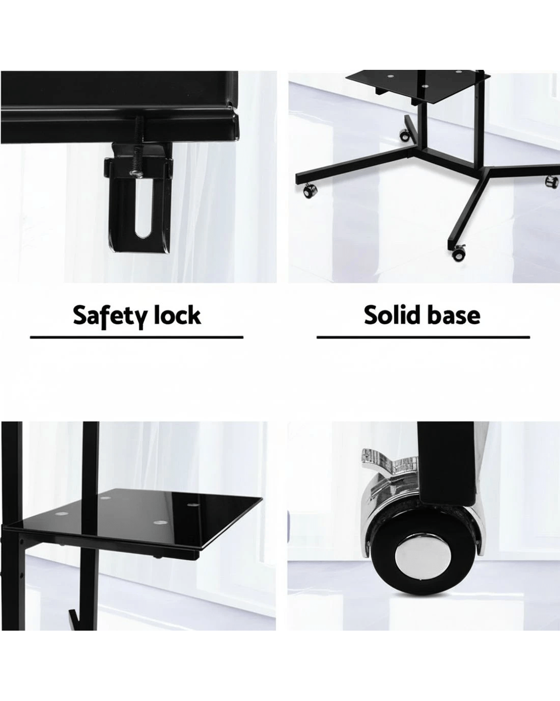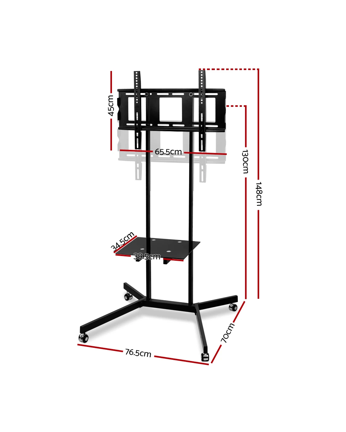 Give your entertainment zone that integrated look with our sleek Artiss TV Floor Stand. With a seamless design that incorporates your TV screen with other multi-media equipment into one ensemble, the TV Floor Stand is simply exceptional in every way. The black powder-coated TV Floor Stand can easily hold any TV screen of between 32 inches and 65 inches and comes with flexible mounting for various VESA measurements. Plus, the TV Floor Stand is set on rotating castor wheels with brakes so that you can move it to any room or location as well as any facing. It is also height adjustable of between 129.8cm and 148cm for a comfortable sight line. Not least, the tempered glass top shelf and solid metal base ensures a stable and sturdy structure at all times.