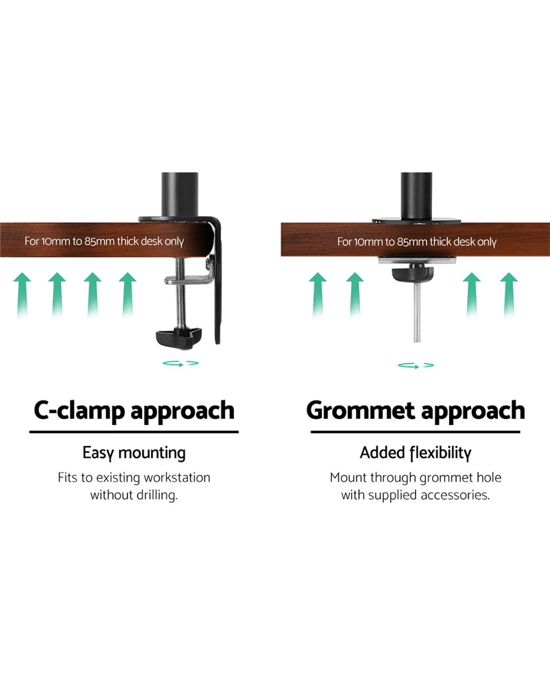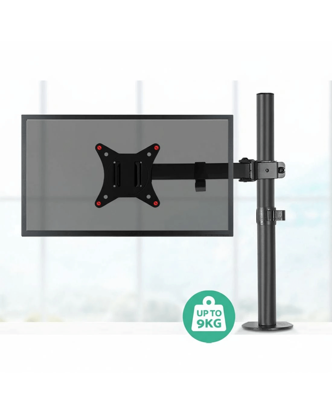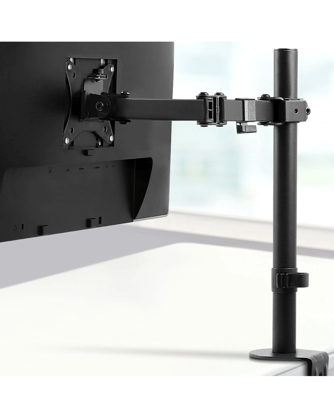 Add some extended mobility to your monitor with our Artiss Fully Adjustable Single Monitor Arm. With it, you can extend it up to 43cm to set your preferred viewing position and retract it with ease. Height adjustments can be easily done by twisting the height adjustment screw. It also allows you to swivel your monitor 180°, rotate it 360° or tilt it up to 45° and set in either landscape or portrait format. Using the detachable VESA mount, you can mount any monitor size of up to 32" with a maximum weight capacity of 9kg. Other great features include alternative set ups, cable loops for neat and tidy cabling and a tools holder for allen keys. Not least, made from heavy-duty steel, the monitor arm is designed to stand up to longlasting use without missing a beat. All the necessary mounting hardware and an assembly manual are included in the package for a hassle-free set up.