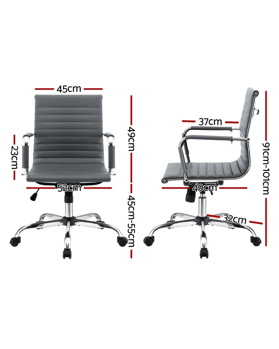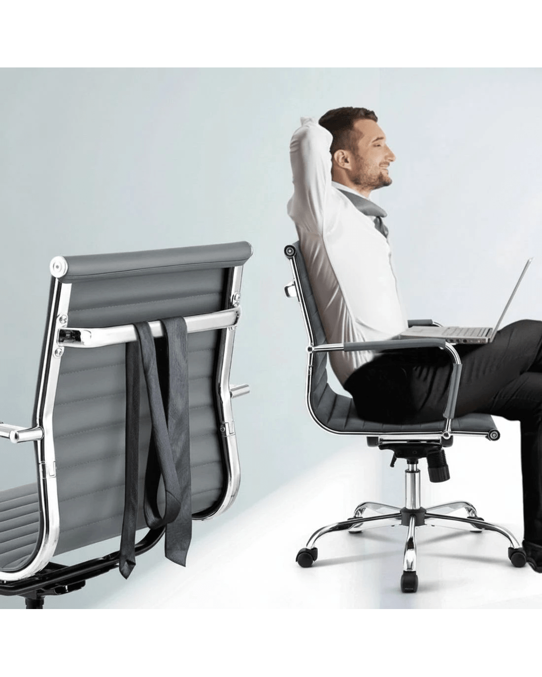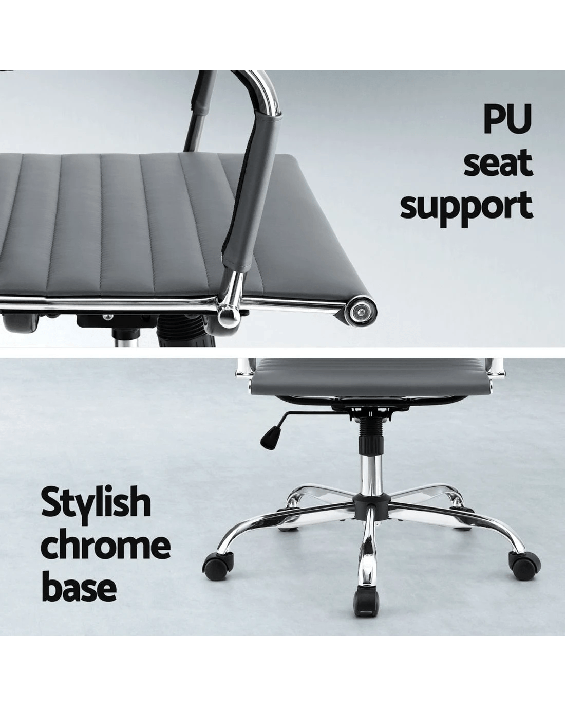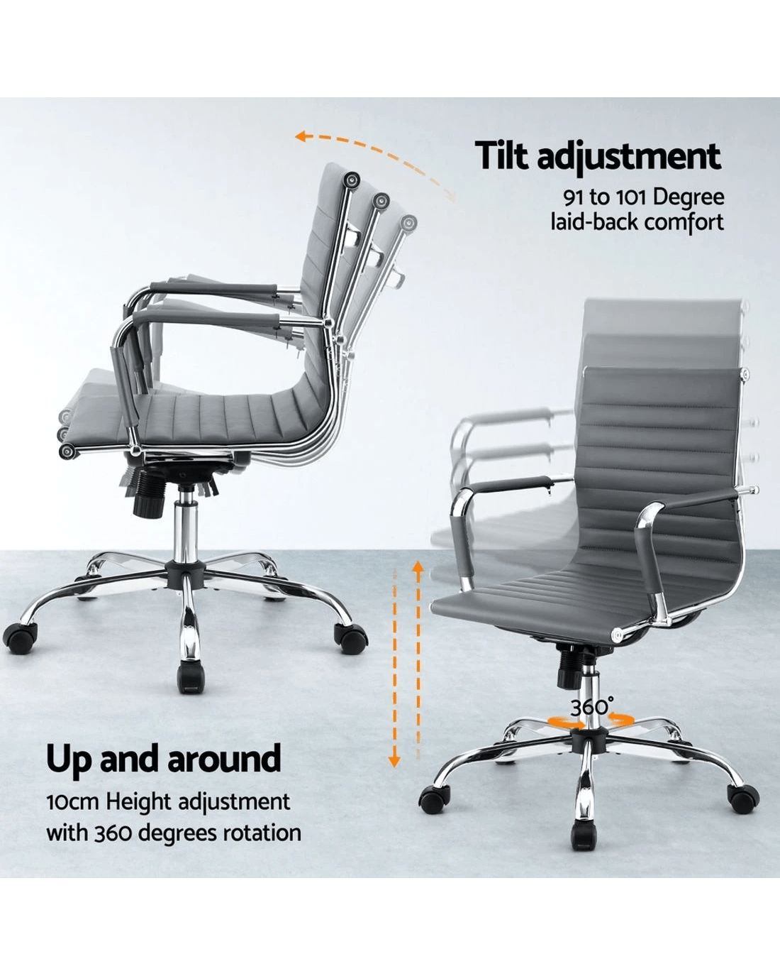 Bring a touch of contemporary living to your home or office interior with our Artiss office chair. Full of iconic styling, the office chair is absolutely sleek and elegant in every profile. More so with its faux leather upholstery that offers sophistication and class. Better still, the seat is rotatable 360° to face any direction with ease. It also comes with both height and tilt adjustment to allow you to be seated at your most comfortable position and posture. Thoughtful touches such as a chrome-finished rack at the back of the chair allows for hanging of ties, scarfs and other fashion accessories. Not least, the similar chrome adorned base has five wheel castors for easy movement.