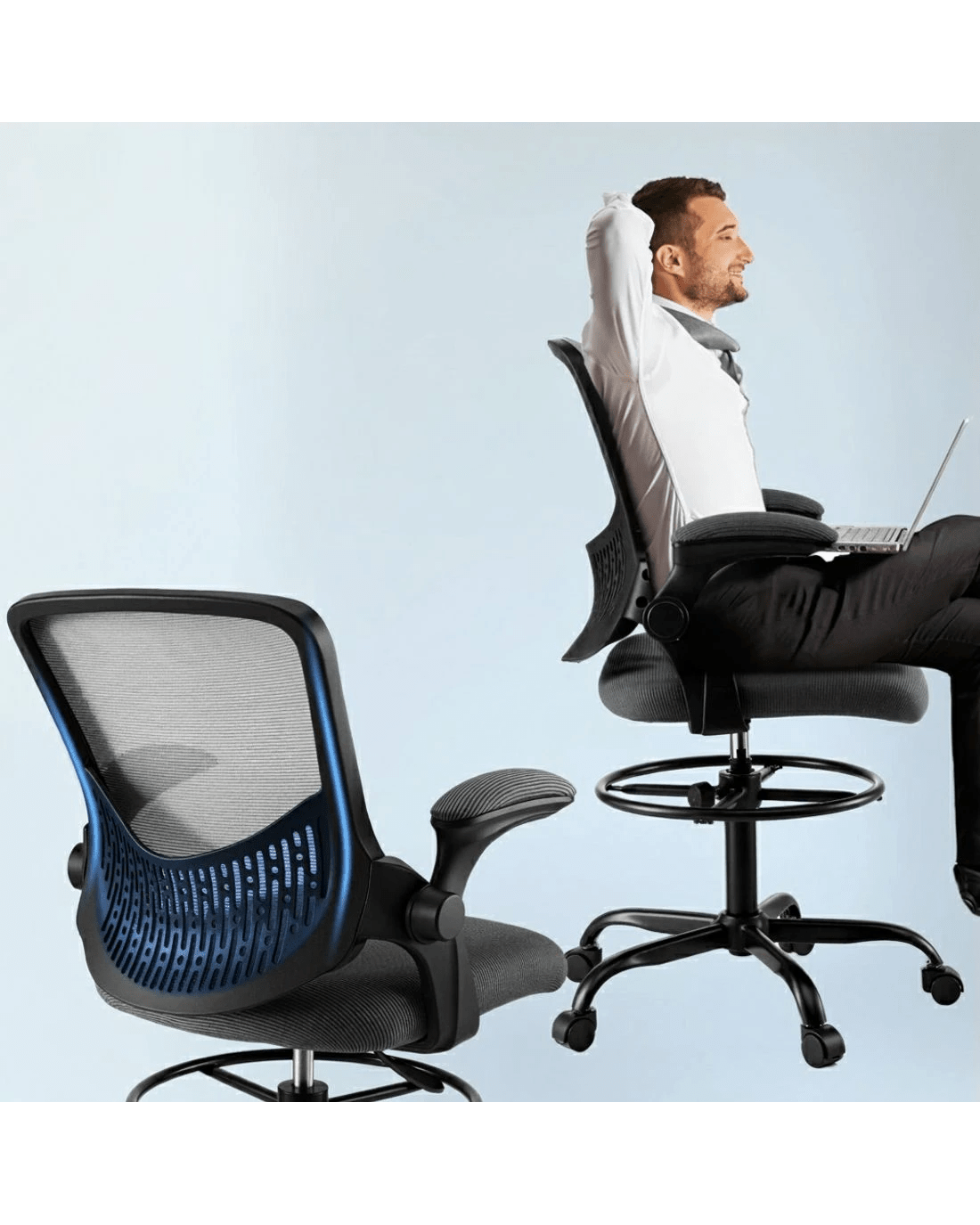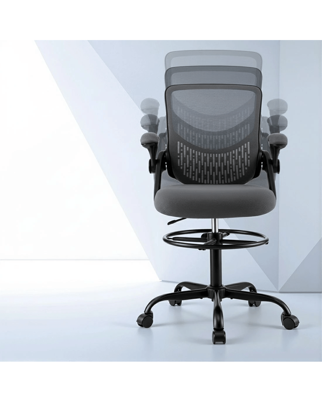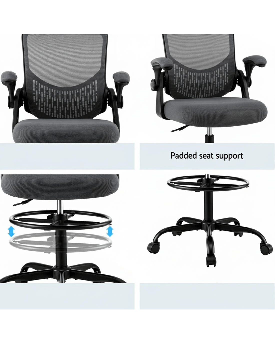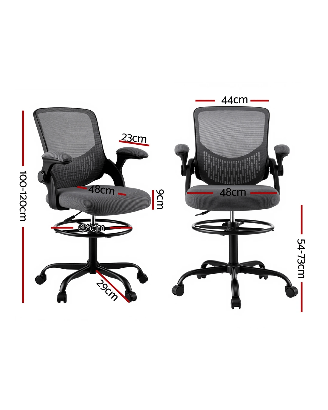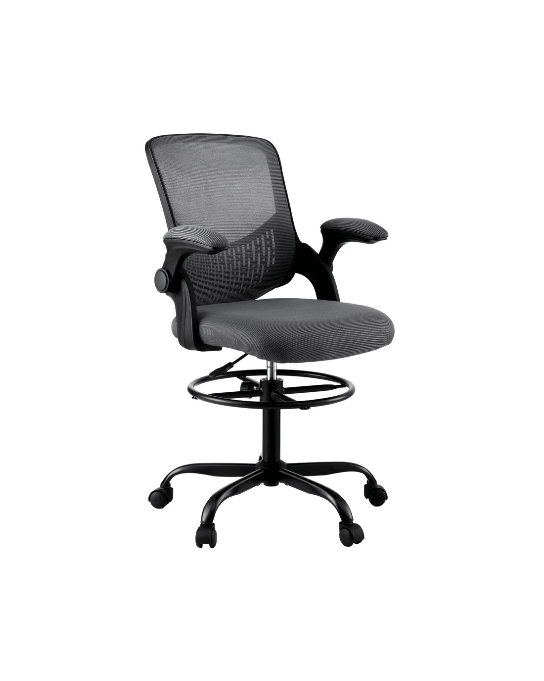 Upgrade your workspace with the Artiss Mesh Drafting Office Chair, designed for both comfort and functionality. The breathable mesh backrest promotes airflow, keeping you cool throughout the day, while its contoured design provides essential support for your back. Flip-up armrests offer flexibility, allowing you to slide the chair under your desk with ease. The height-adjustable seat and footrest ring ensure personalised comfort, making it suitable for various desk heights. With a 360-degree swivel and a stylish chromed base, this chair is both practical and modern—perfect for any home or office setup.