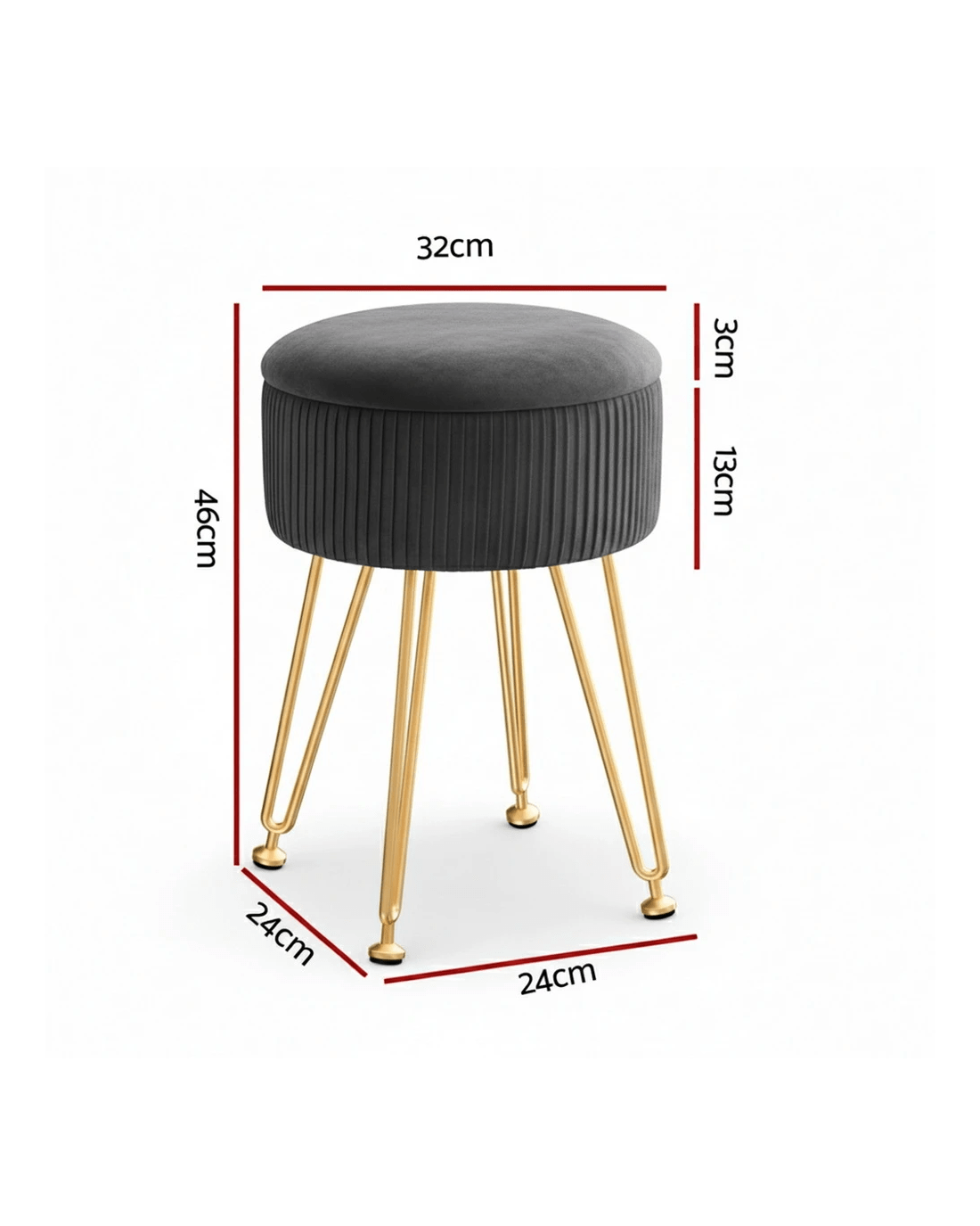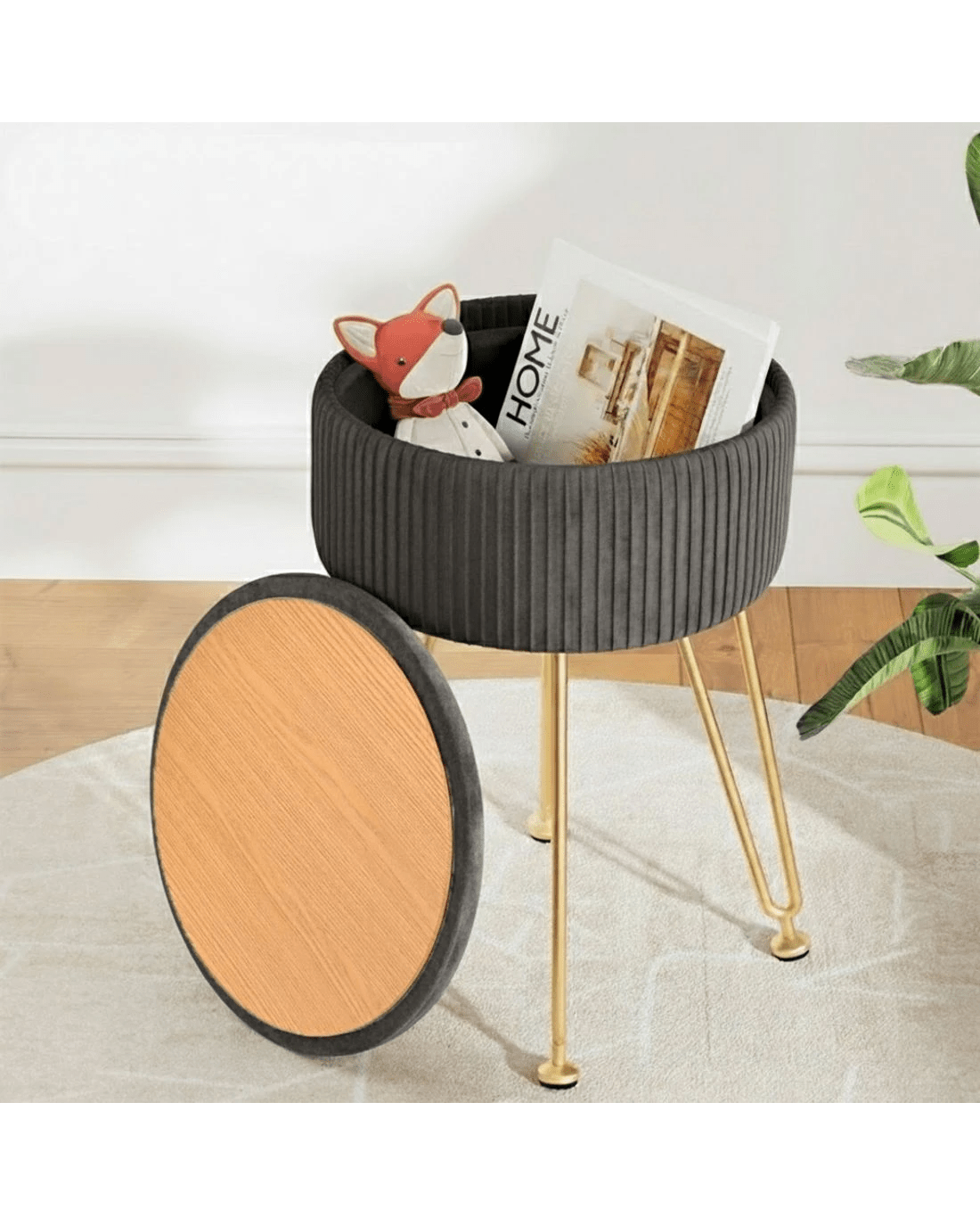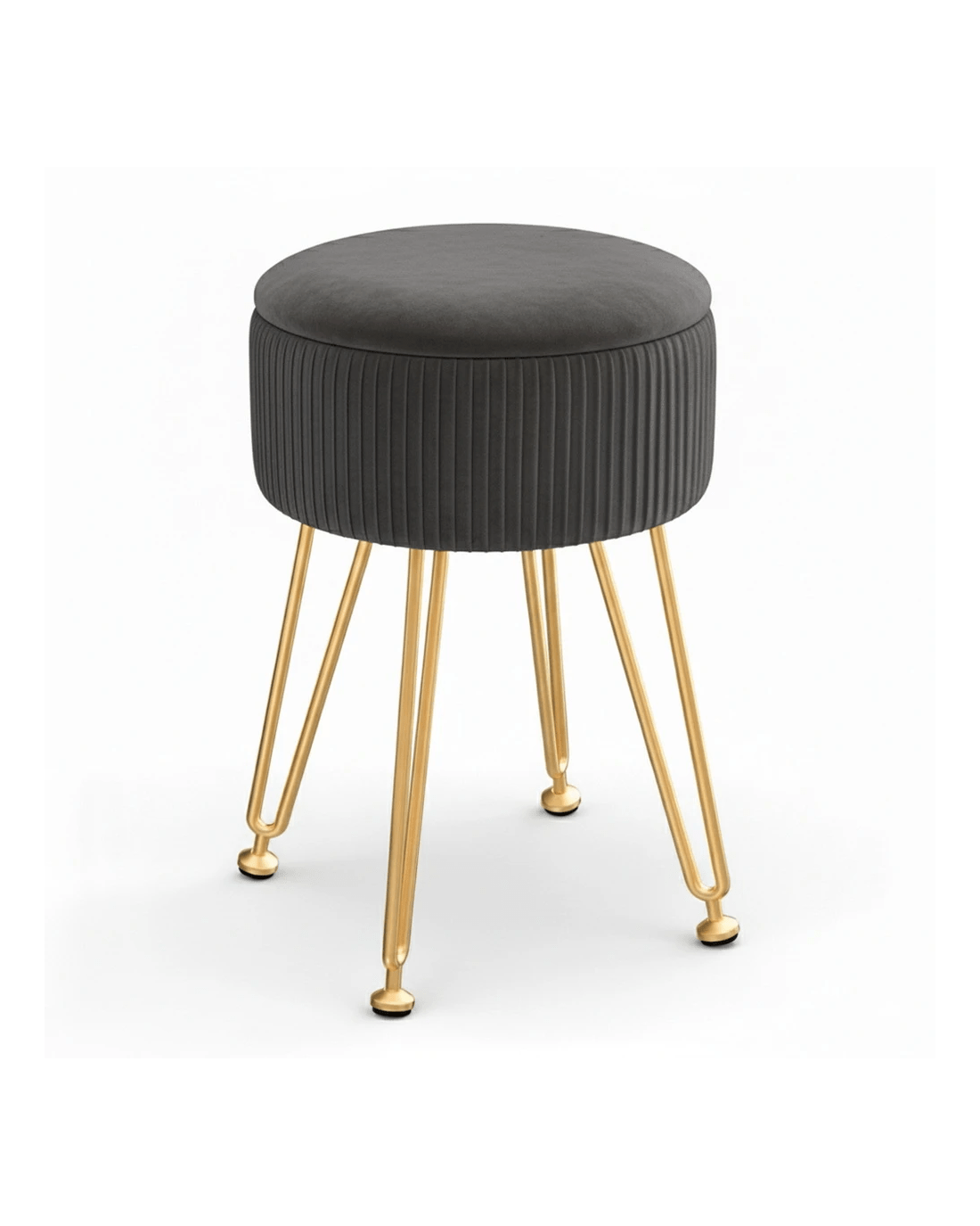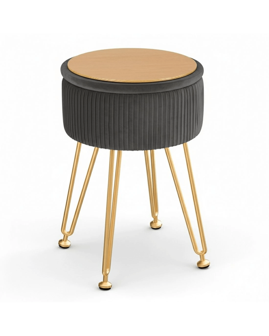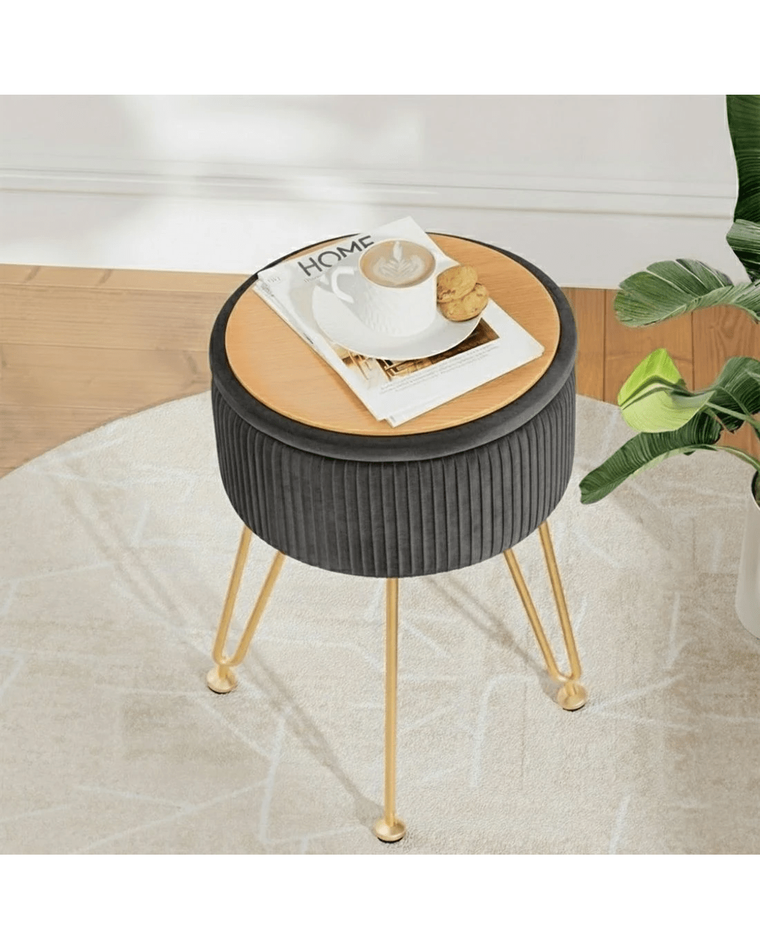 This round velvet Artiss footstool features a reversible table lid, vertical stripe design, durable MDF frame, high-resilience foam padding, and adjustable metal legs with floor protectors. Use it as a footstool, coffee table, and storage. Simple assembly required.