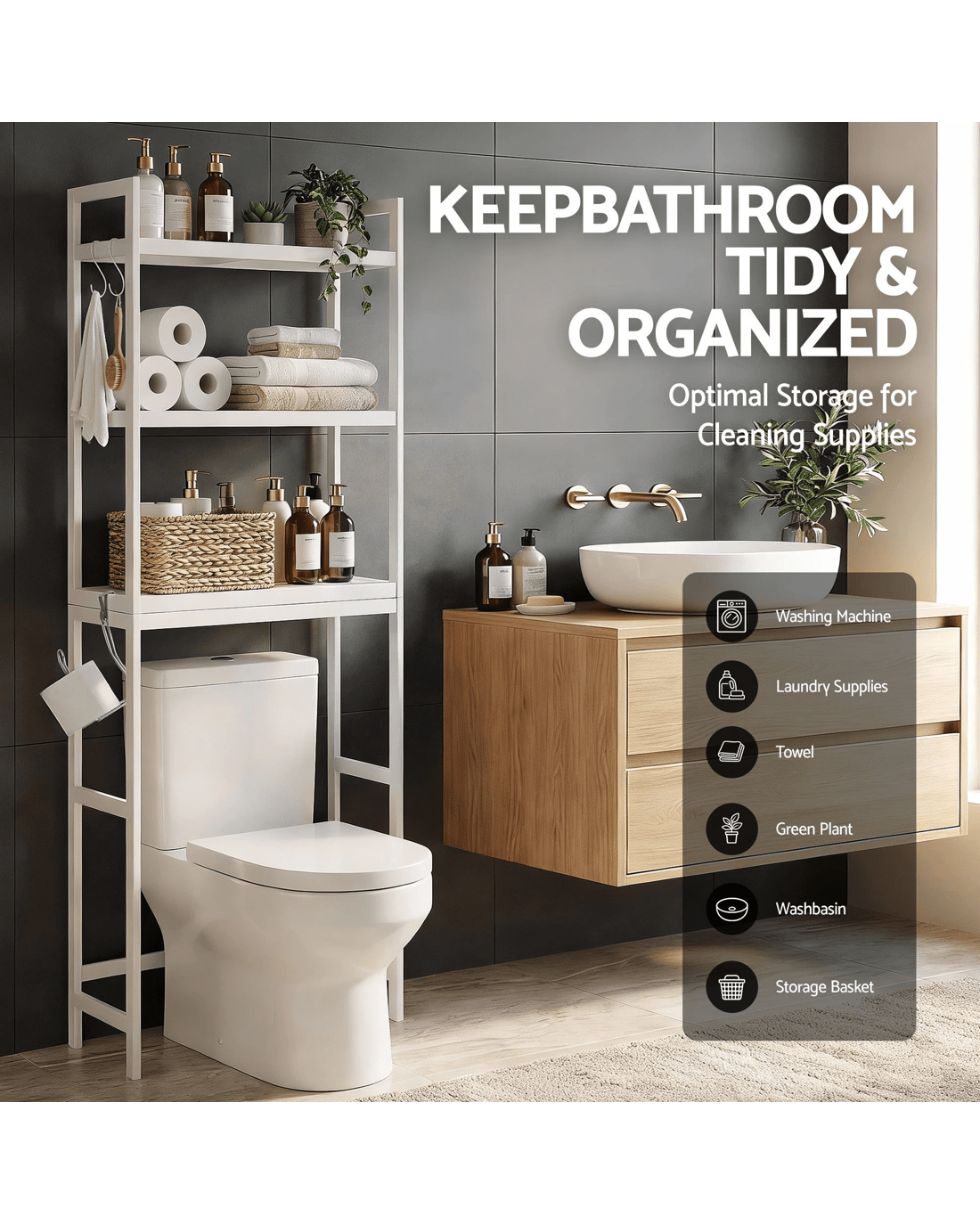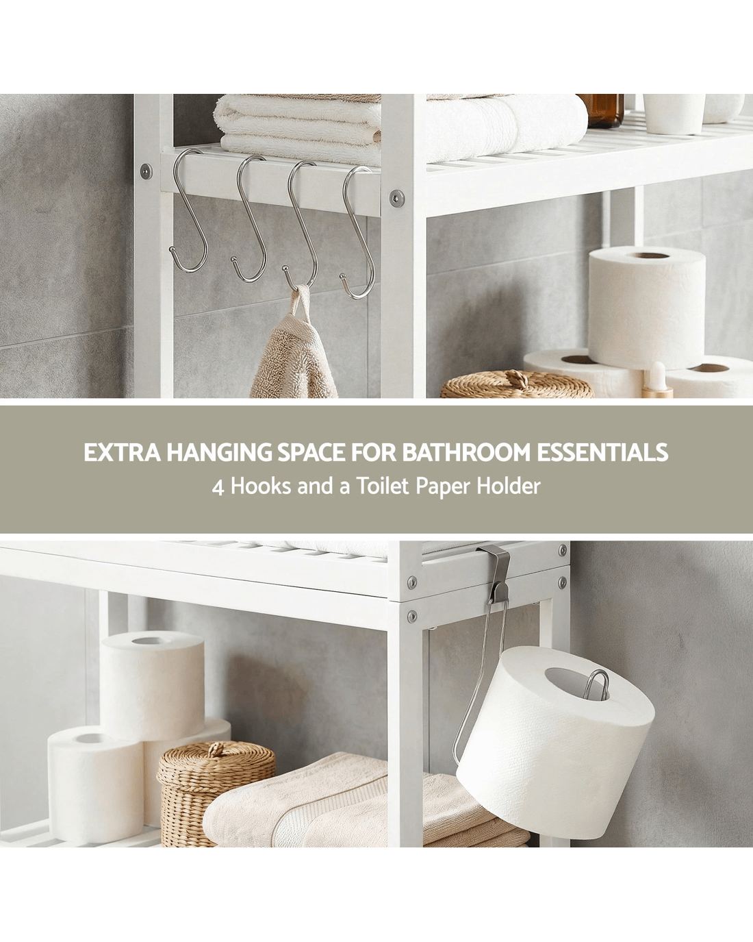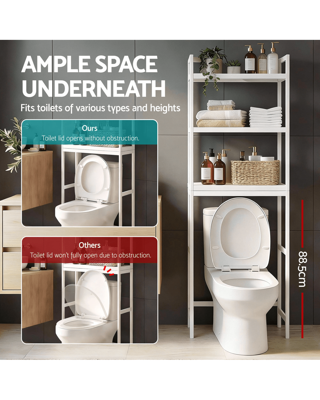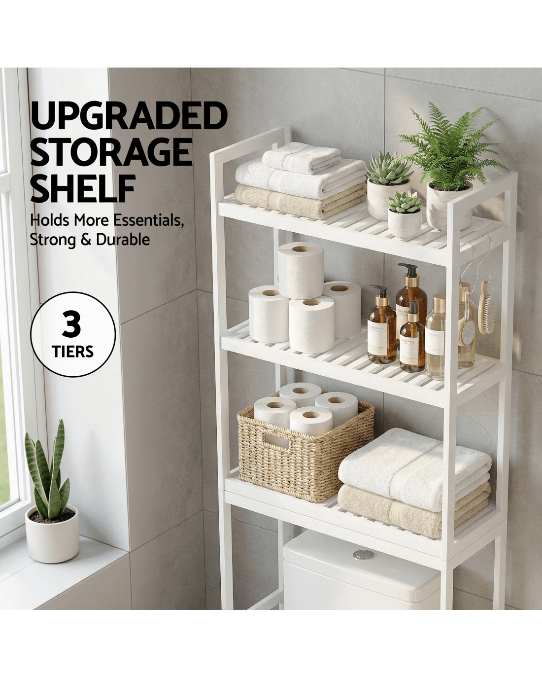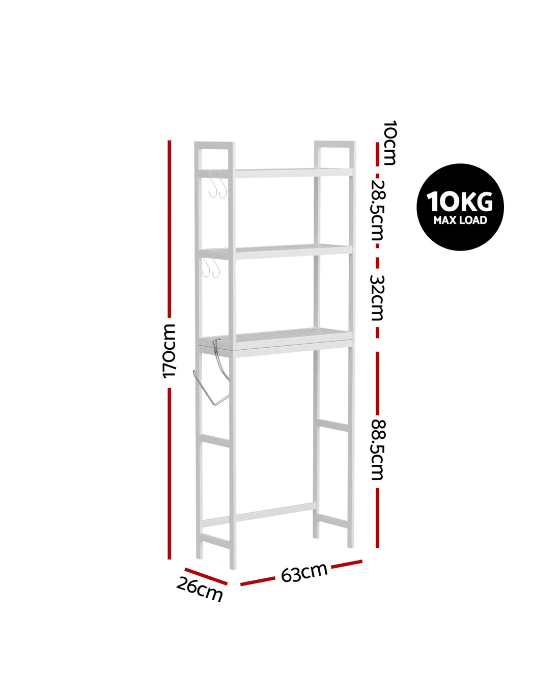This Artiss over toilet storage rack offers a spacious 3-tier layout, wide shelves and secure raised rails for everyday bathroom essentials. Designed to fit most toilet heights, it features four hooks and a toilet paper holder, creating a practical space-saving organiser for modern bathrooms.