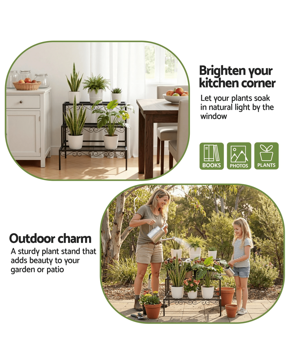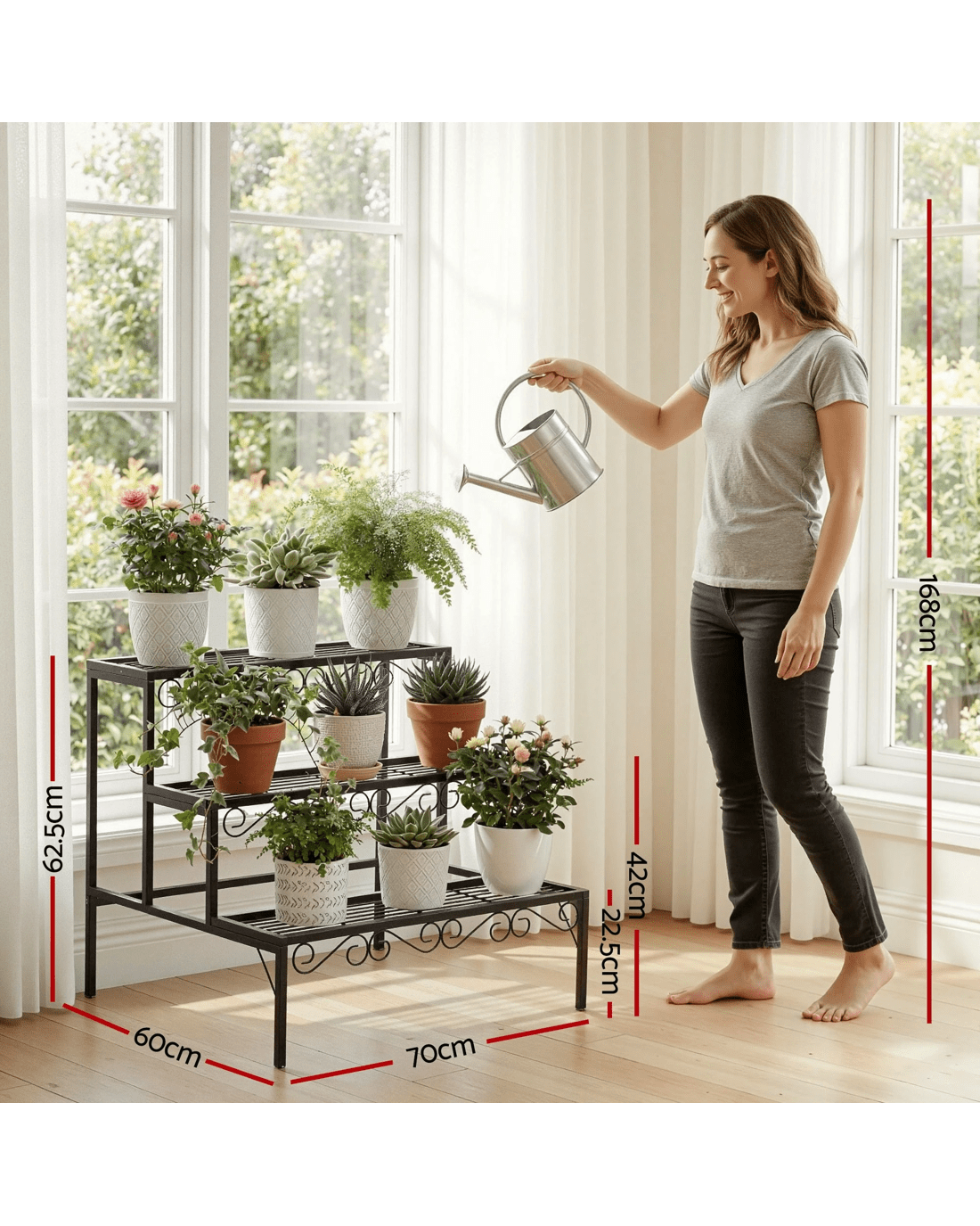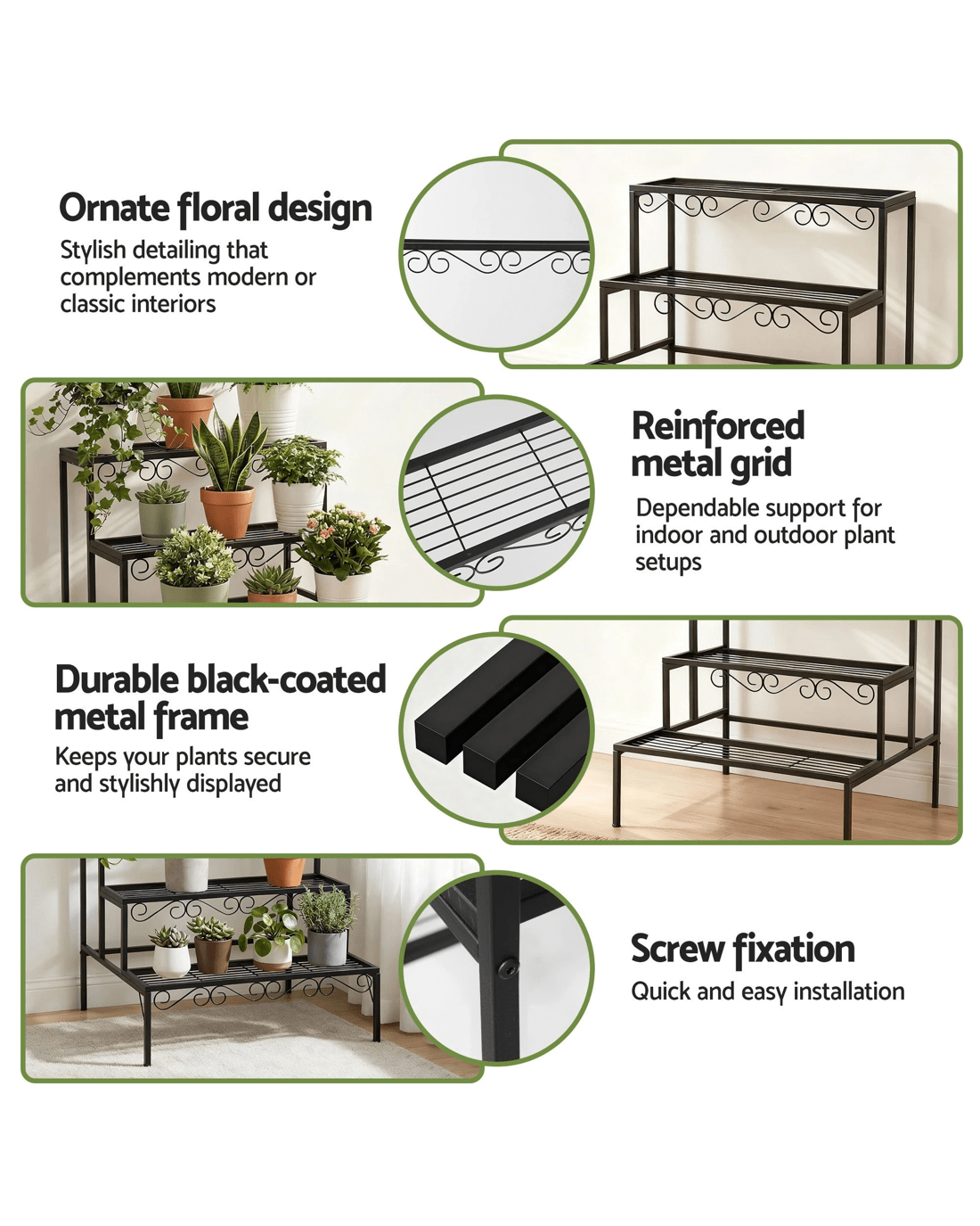 The secure screw-fixation structure ensures stability, while the sleek modern finish adds a stylish touch to any space. Durable, versatile, and functional, the Artiss 3-Tier Plant Stand is the perfect way to display your greenery with elegance and convenience.
