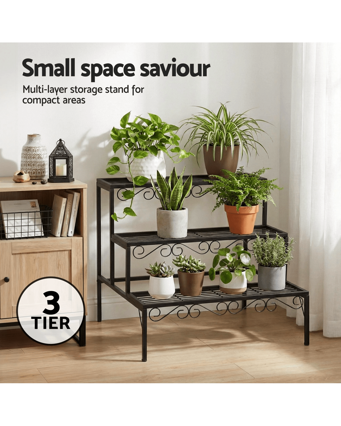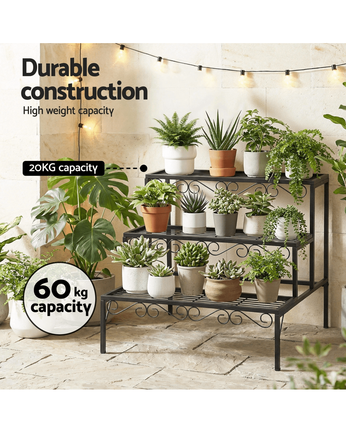 Each tier can hold up to 20kg, providing a total weight capacity of 60kg, making it perfect for both large potted plants and smaller succulents. Its space-saving compact design makes it ideal for apartments, patios, or living rooms where vertical storage is key.
