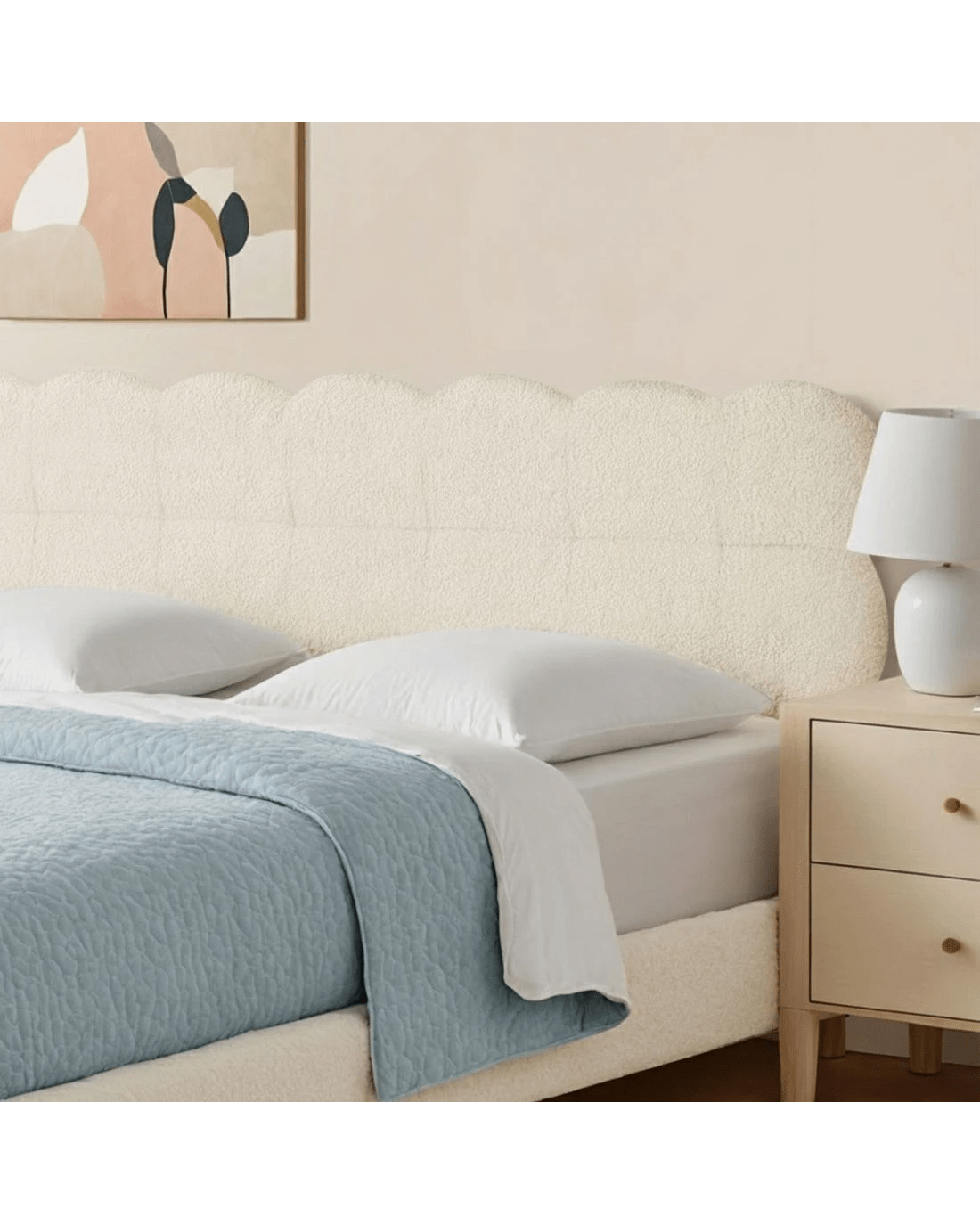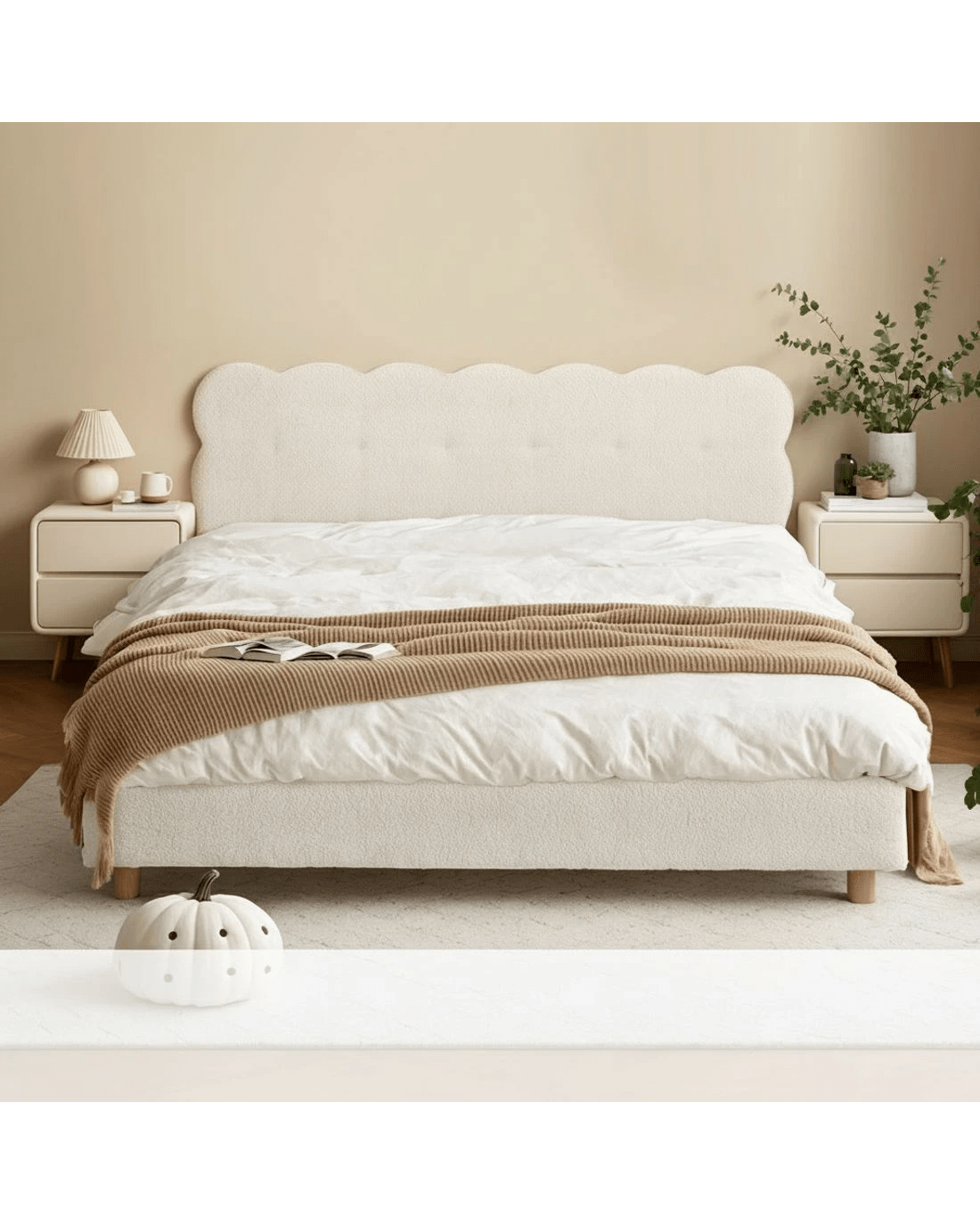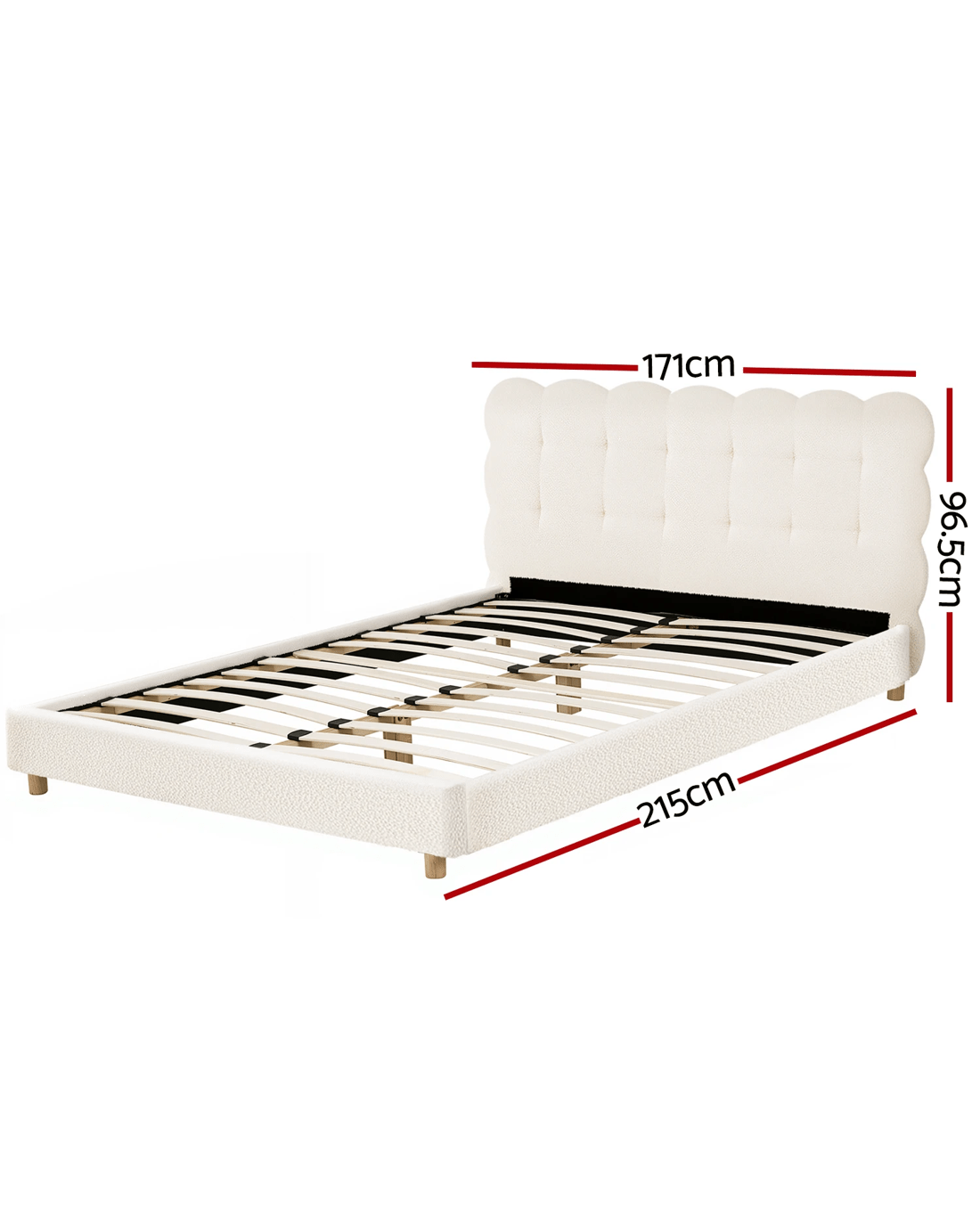 Artiss cloud headboard bed frame in white. Features boucle fabric upholstery and durable wood and metal construction. This platform base fits queen mattresses. Includes wooden slats and metal legs for strength. Easy to assemble. Supports up to 300KG. Note: Actual colour may vary.
