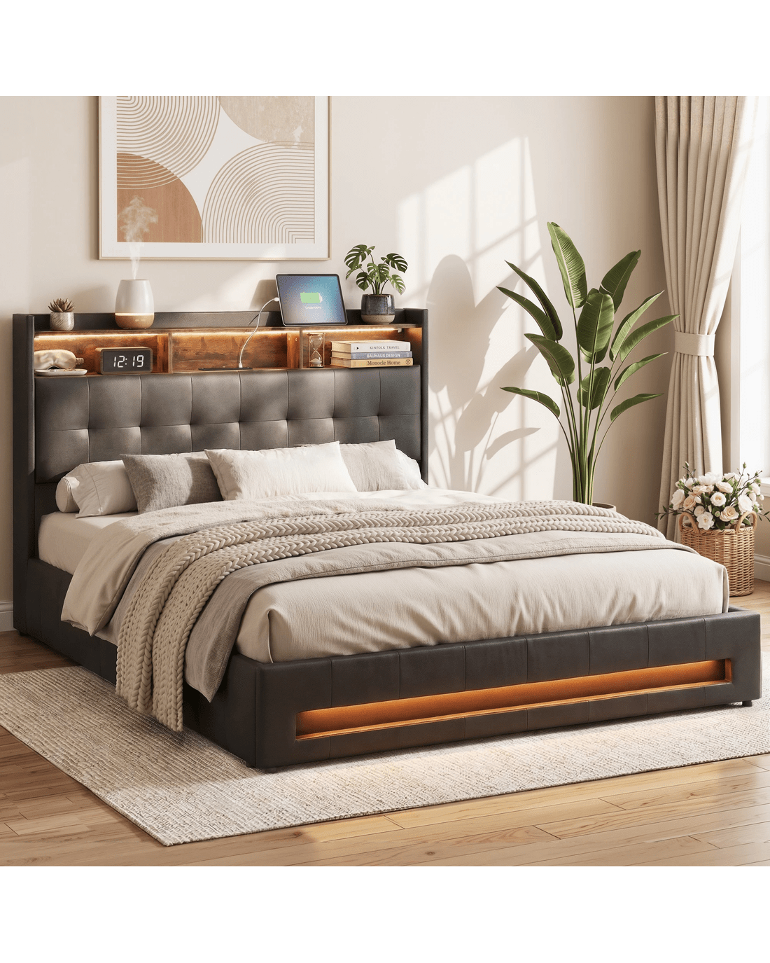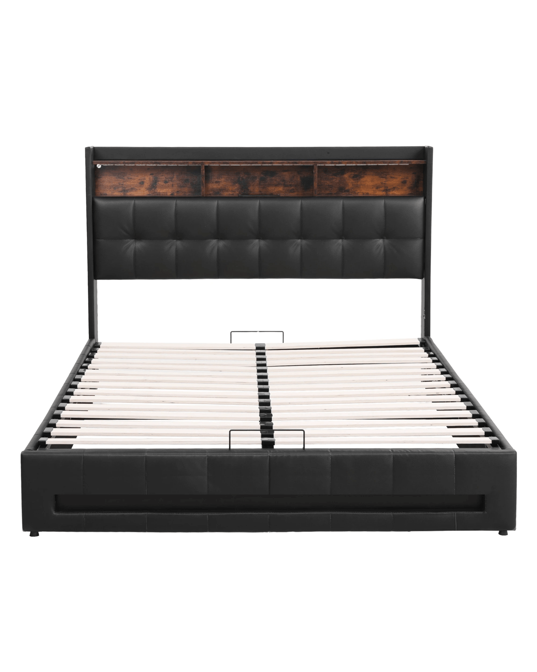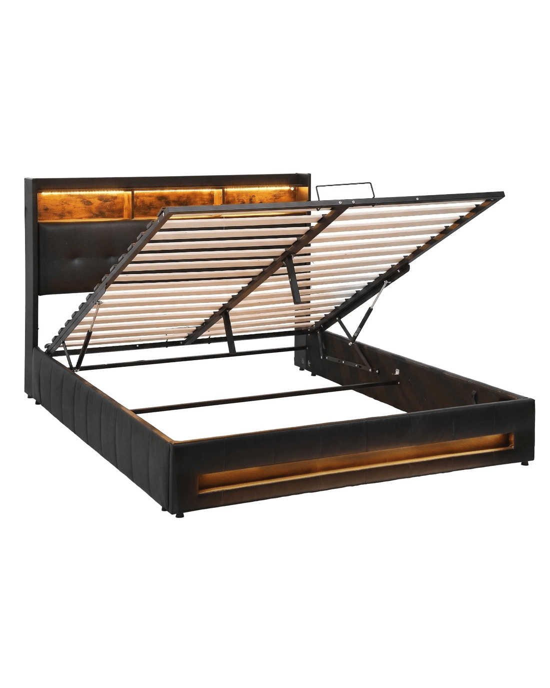 Sold by Aisle SixArtiss Queen Bed Frame Gas Lift Storage LED Lights Charging Station with Open Shelf - Black