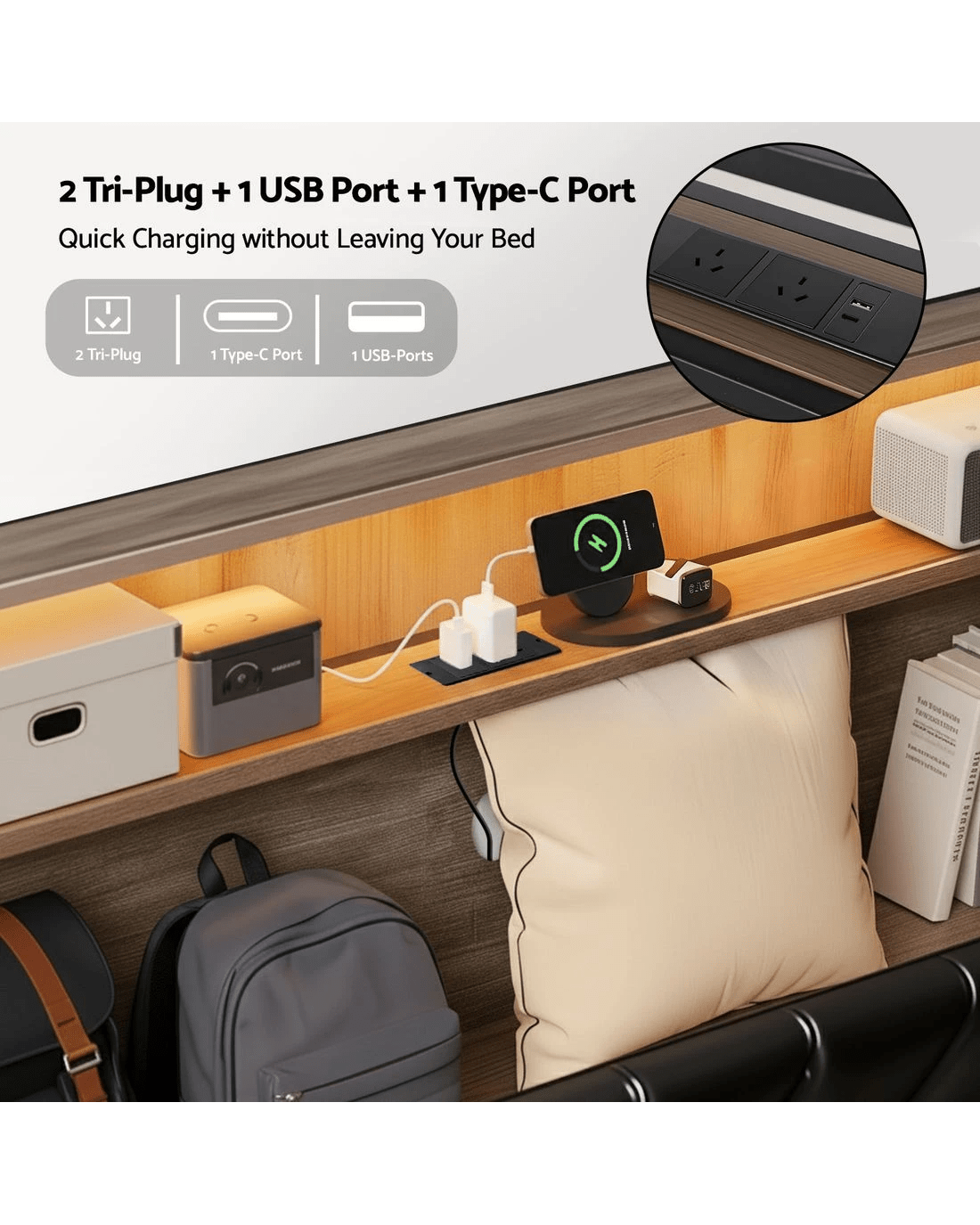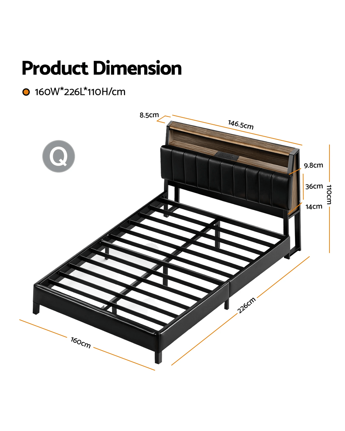 The Artiss Queen Bed Frame features dynamic LED lighting with 16 colours adjustment. Its upholstered storage headboard offers hidden organisation space, while integrated Tri-plug, USB, and Type-C ports keep devices charged. Built with a reinforced timber-steel frame and 10 metal slats, it supports 300kg and fits all queen mattresses (153x203cm). Includes under-bed storage and quick assembly.